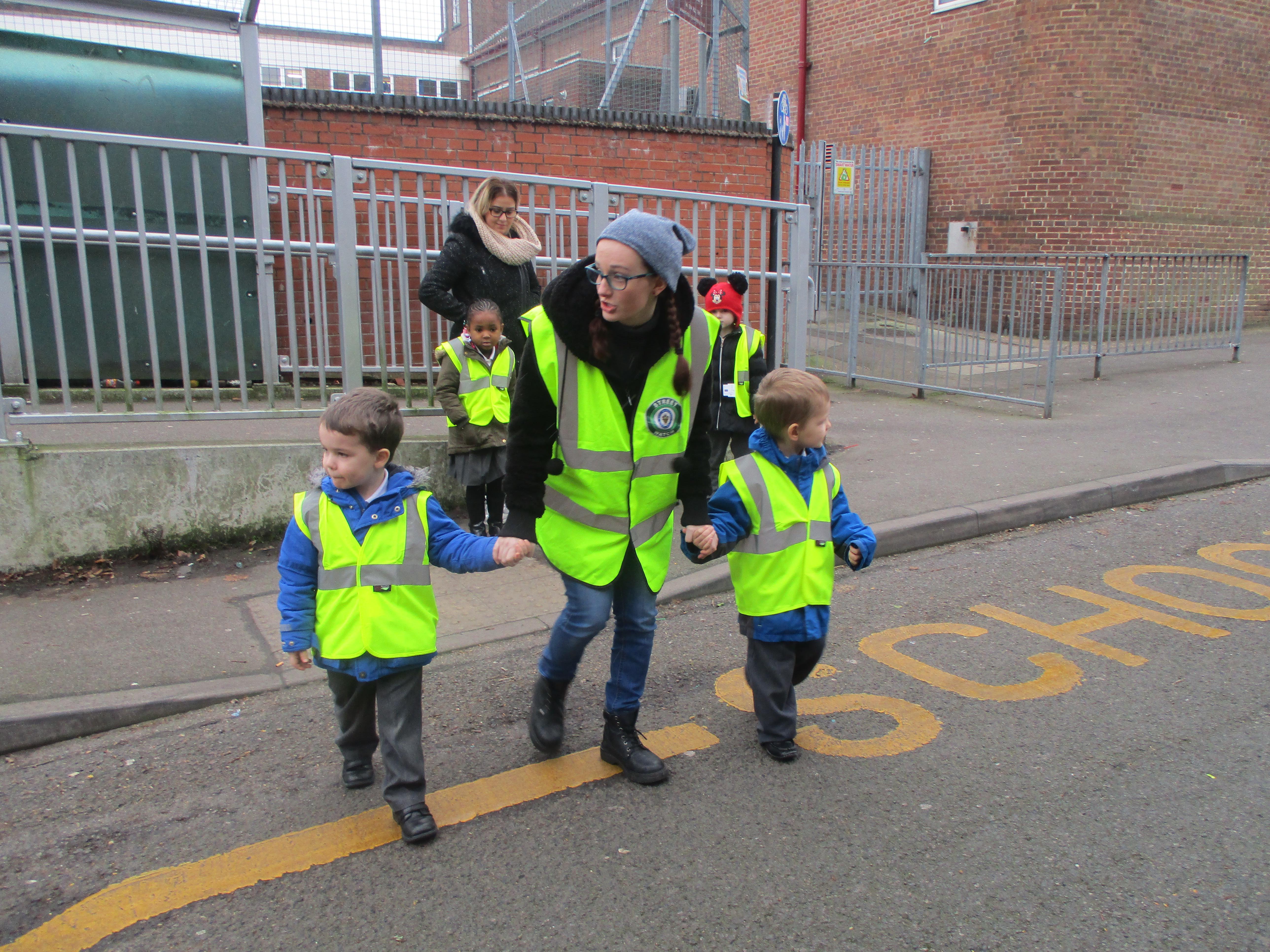 We had a visit from our local PCSO Jake Bird and her colleagues. They taught us how to cross roads safely by holding hands, looking and listening carefully. We also know we need to walk across roads and wear bright clothes so we can be seen by drivers. We even had a surprise visit from another police officer who was driving past in a police car.smiley