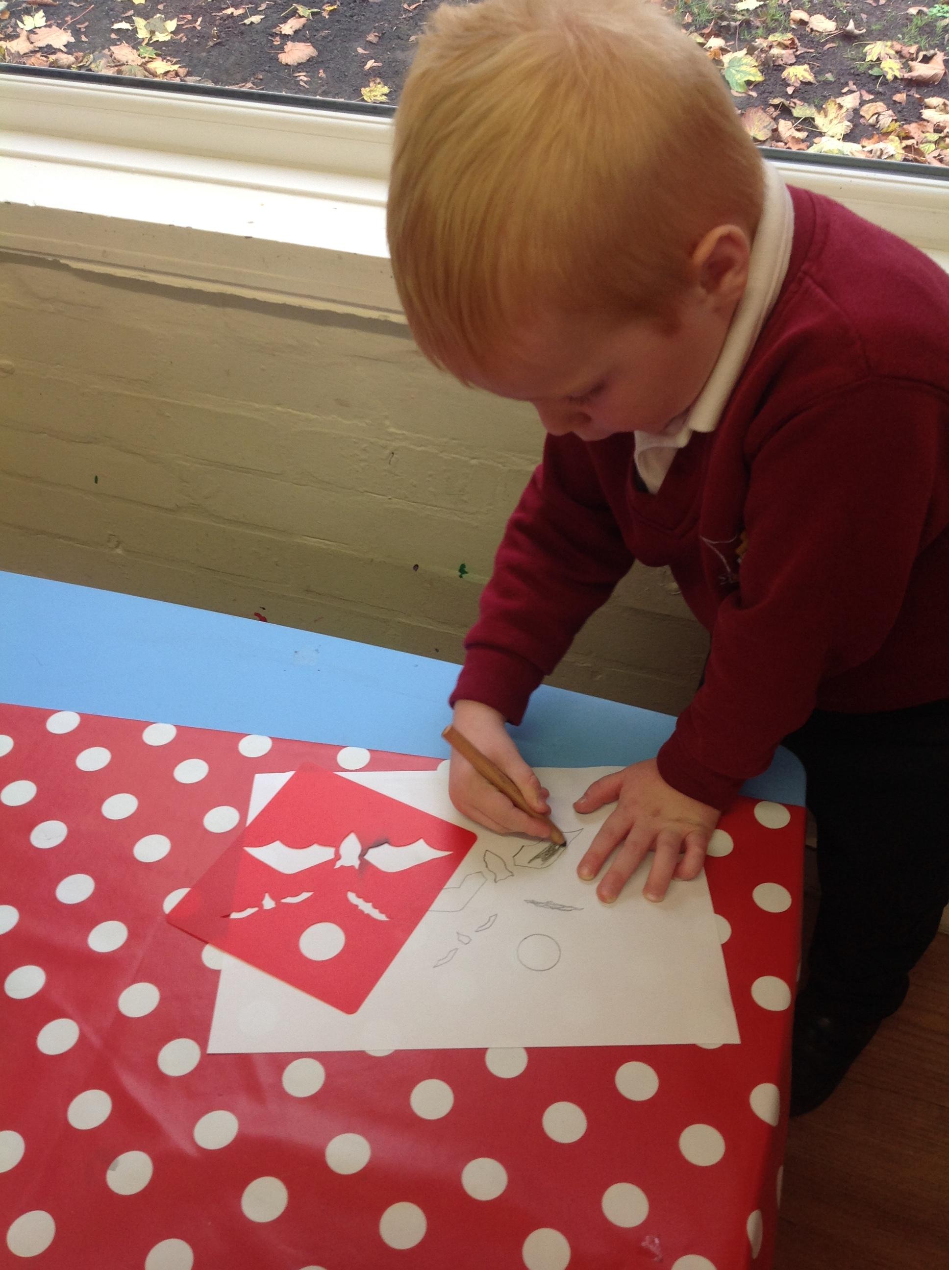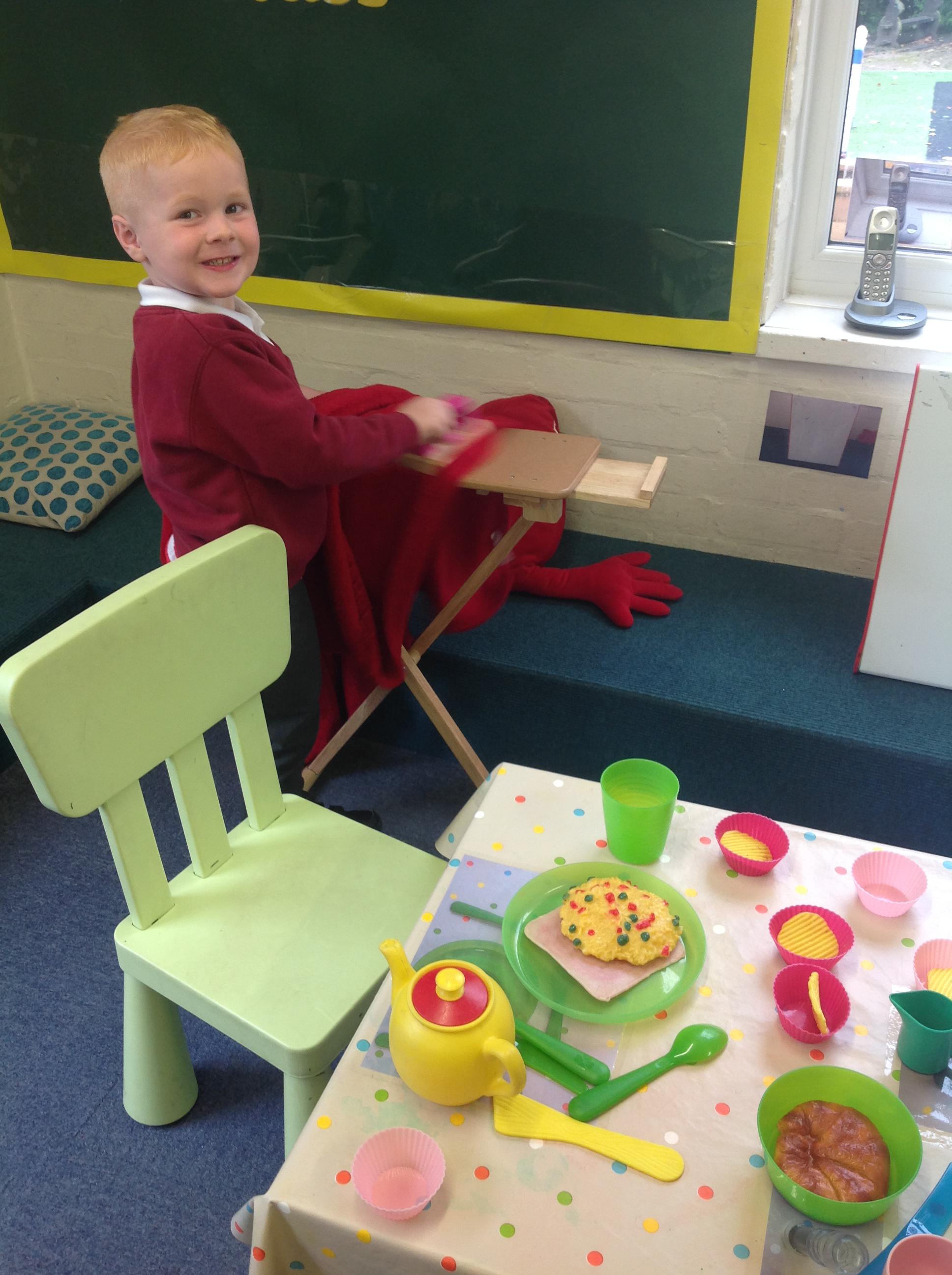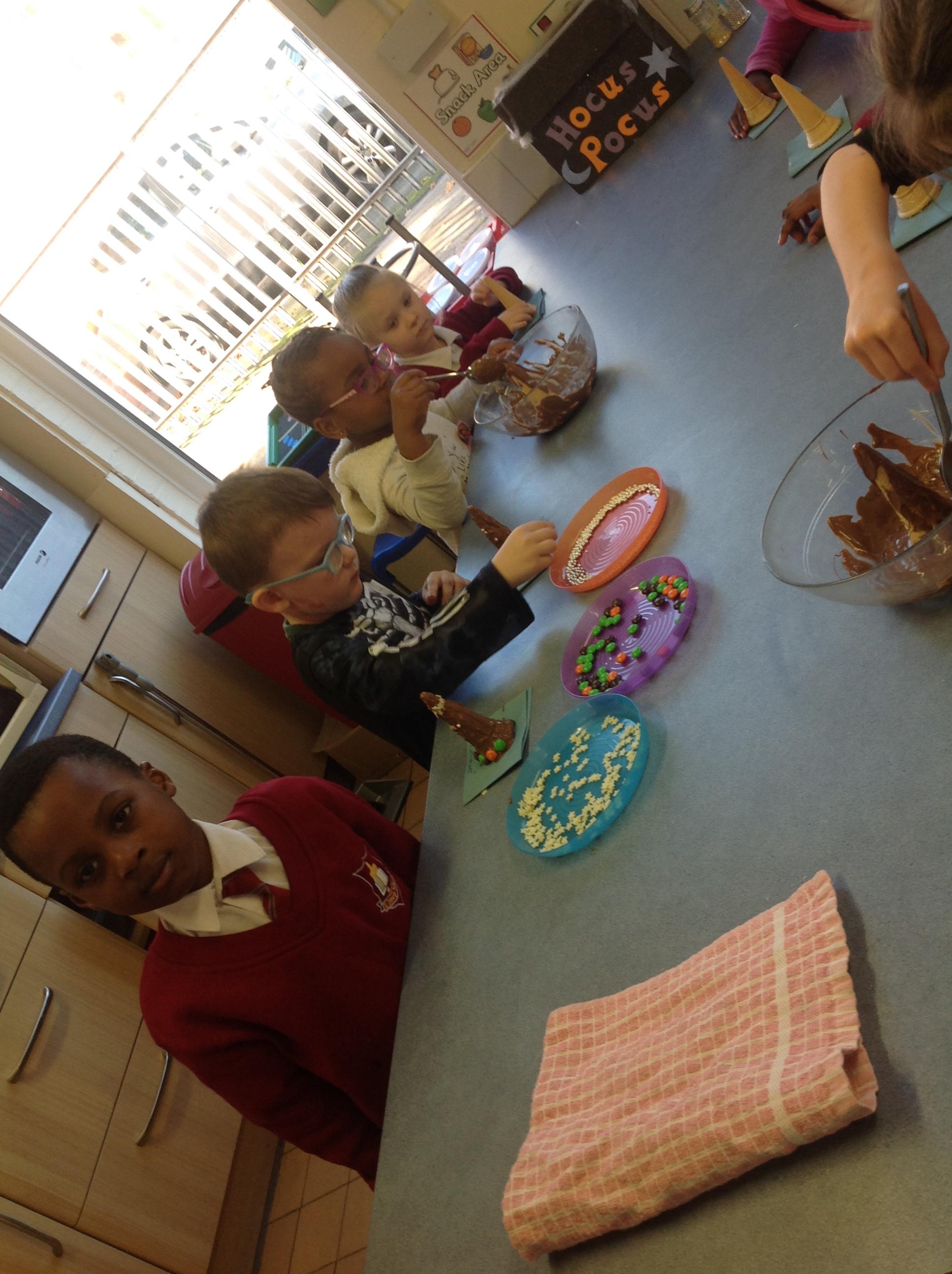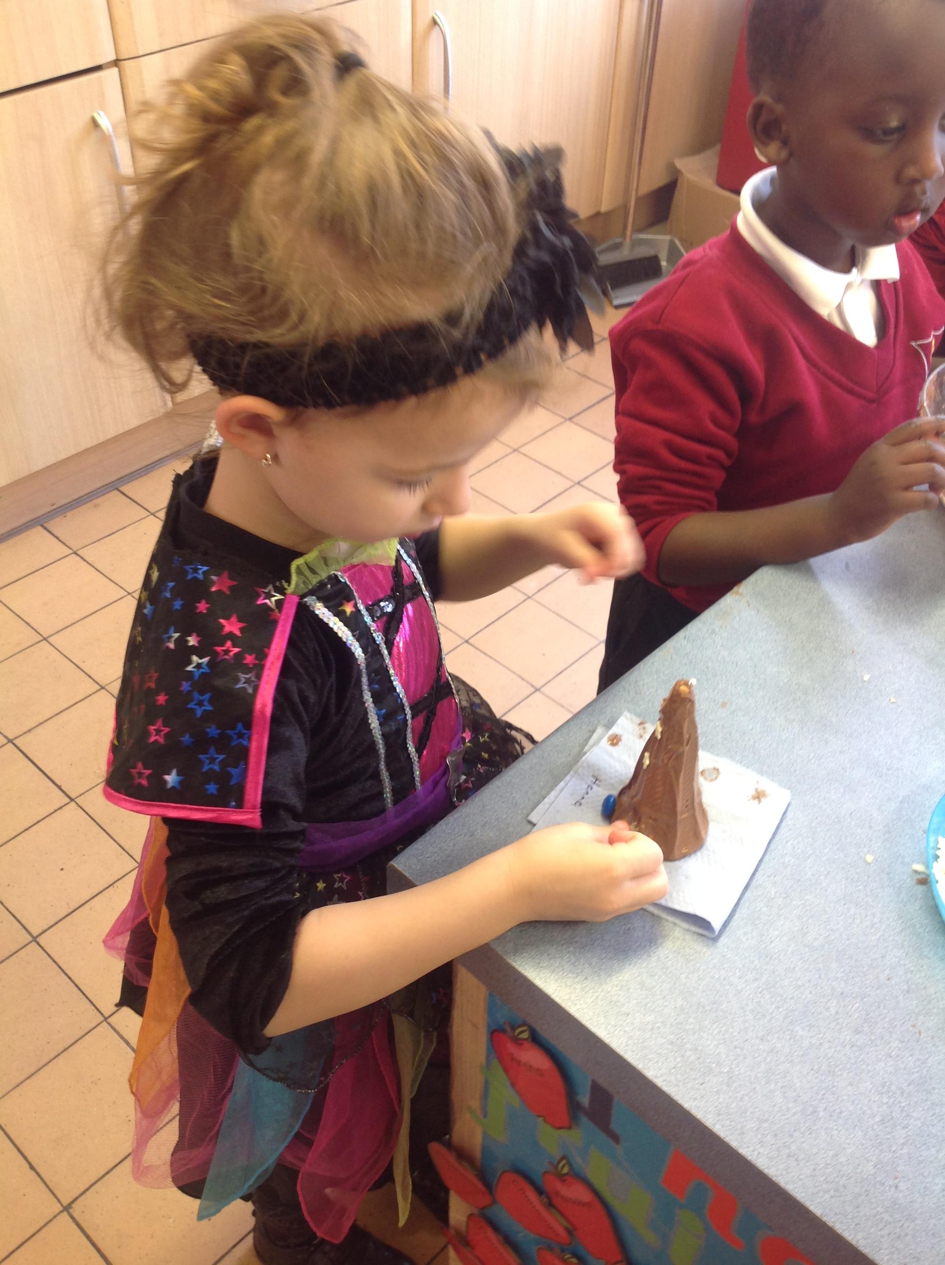 The children celebrated Halloween by dressing up as a scary character and engaged in different activities linked to their spooky story Room on the Broom. The children created pictures and cards using Halloween stencils, made chocolate witches hats and ate pumpkin soup together.