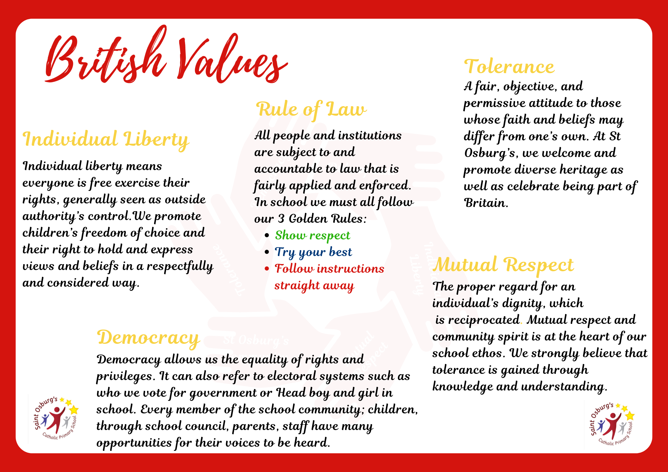 At St Osburg's Primary School we aim to actively promote the values by challenging opinions or behaviours in our school that are contrary to fundamental British values.