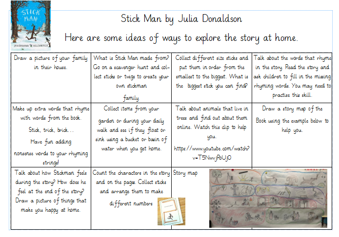 Look our for the story video on Tapestry of Mrs Gee sharing the Winter themed story of 'Stick Man' by Julia Donaldson. You can hear the author reading the story, watch the movie and use some of the ideas below to enjoy this book at home together.