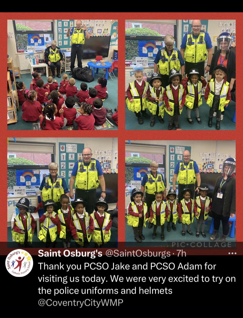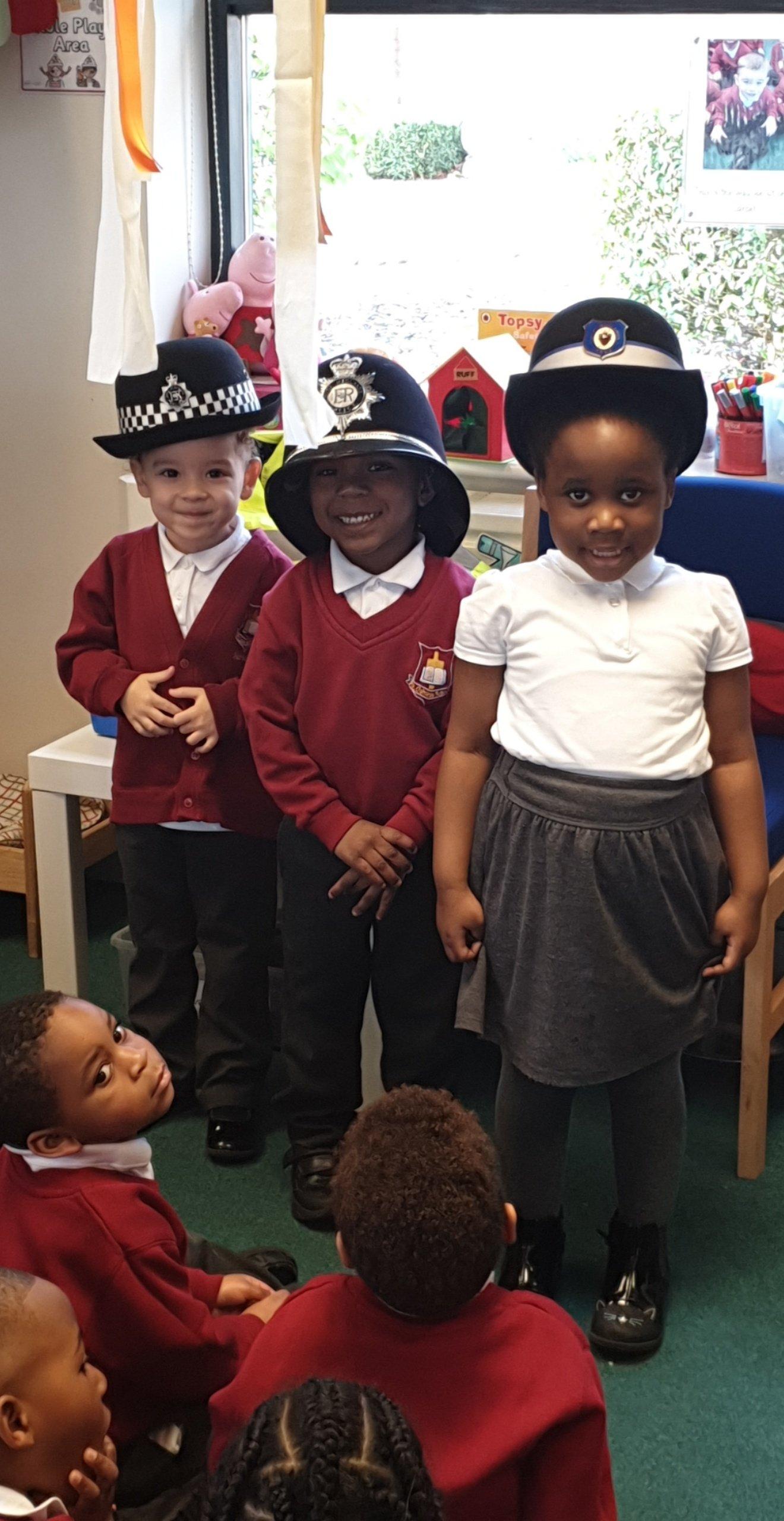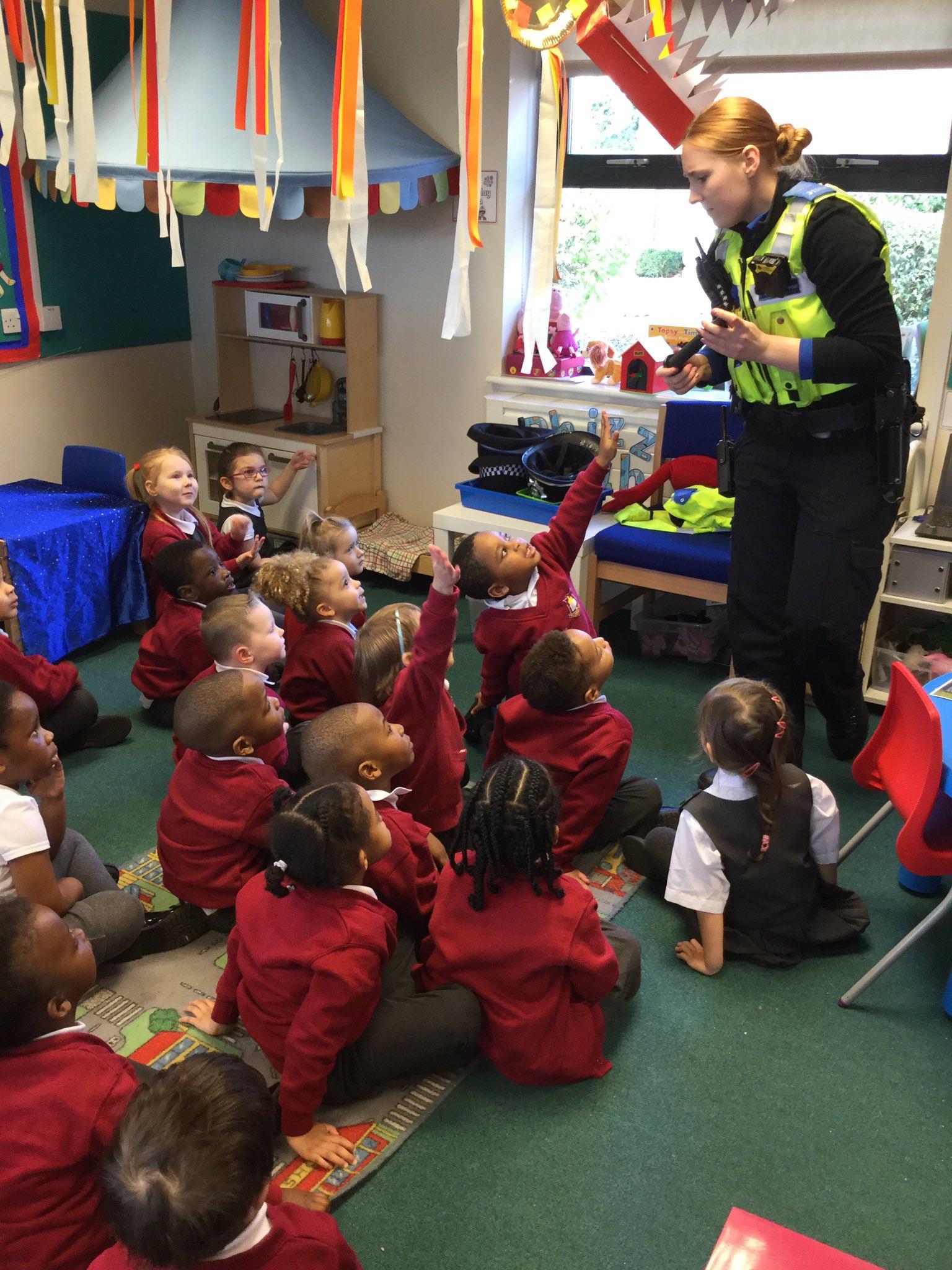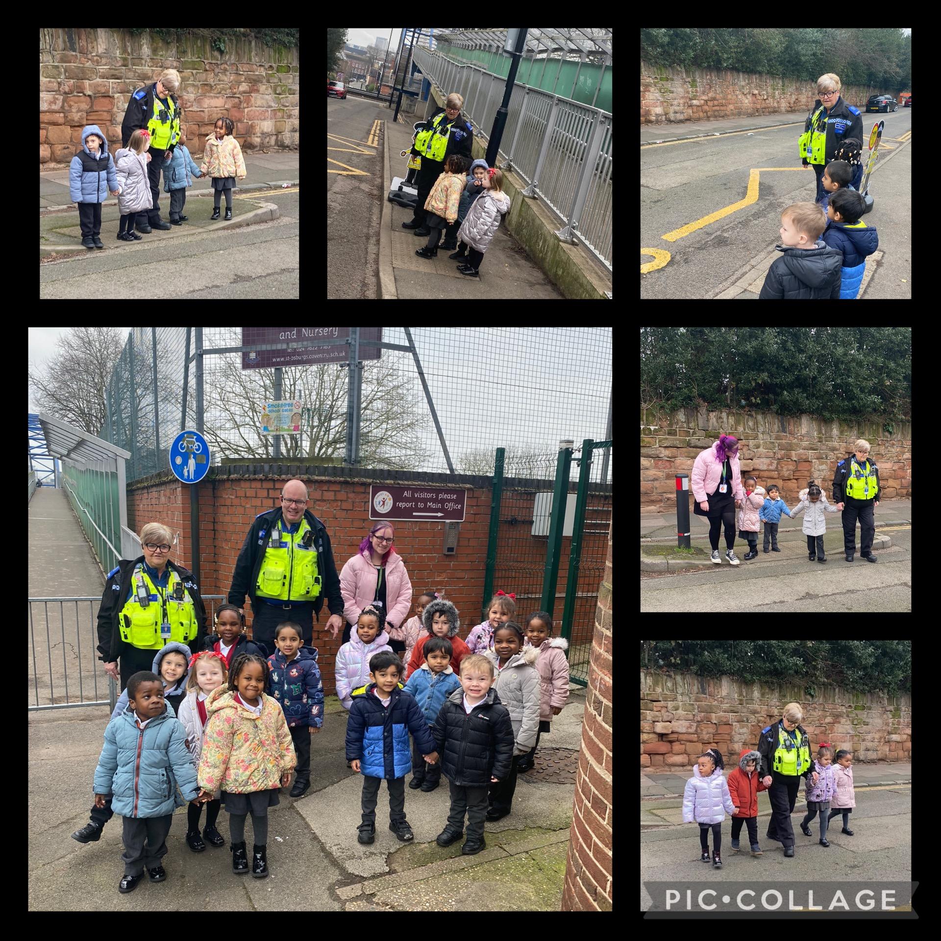 PCSO Jake and PSCO Adam visited today to teach the children how to cross roads safely. They enjoyed looking out for traffic, holding hands with a grown up and walking across the road safely.