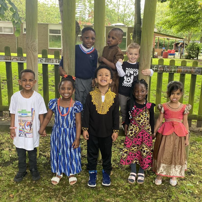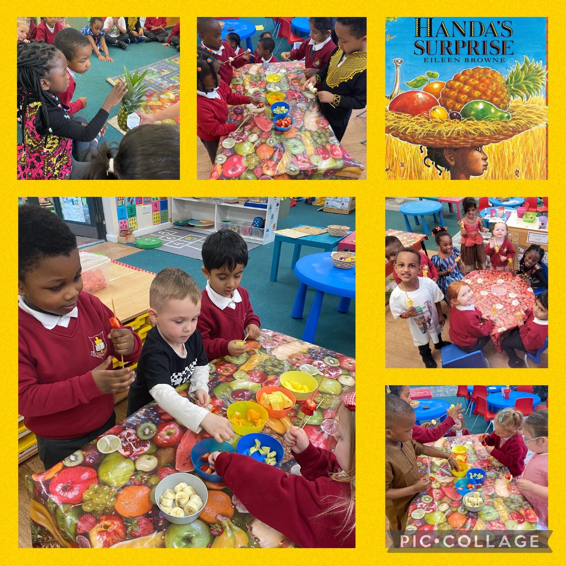 The children enjoyed dressing up in different clothes to represent their cultures and listening to the African story ‘Handa’s Surprise’. They made their own exotic fruit kebabs with pineapple, mango, orange, banana and avocado.