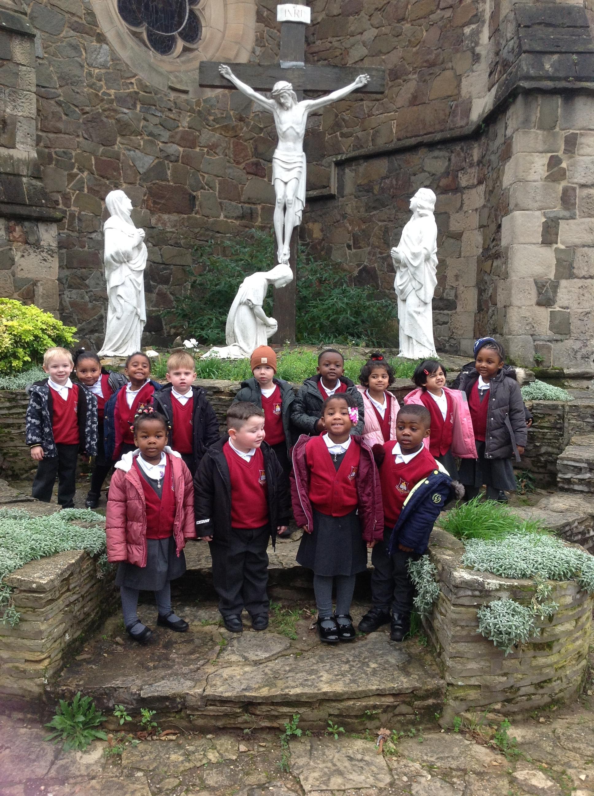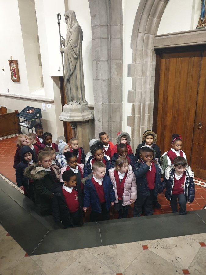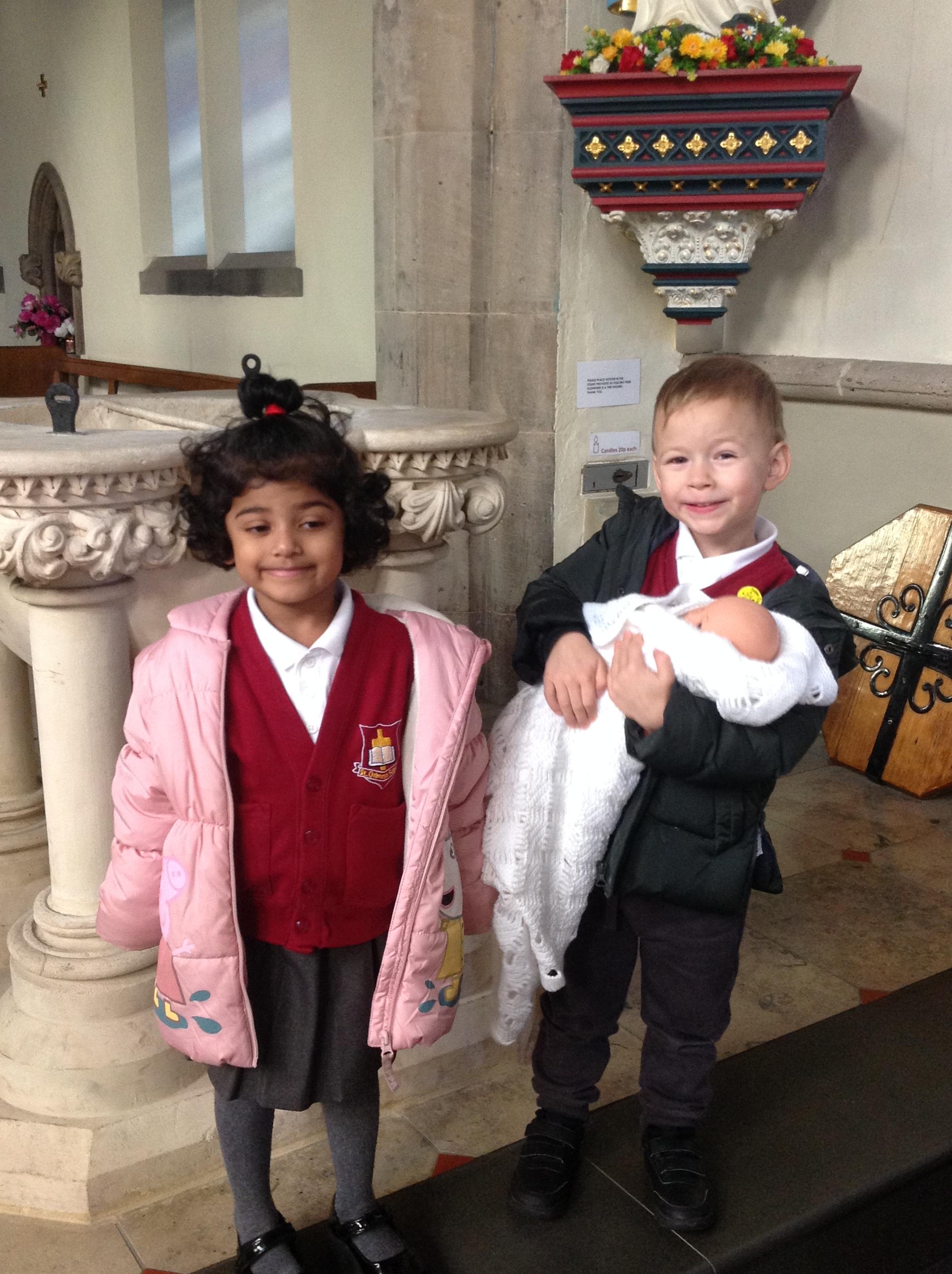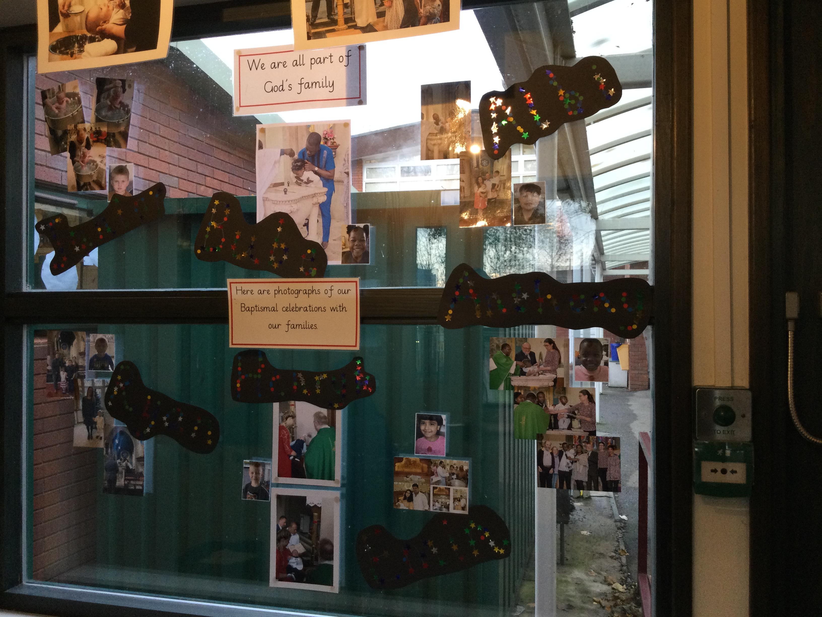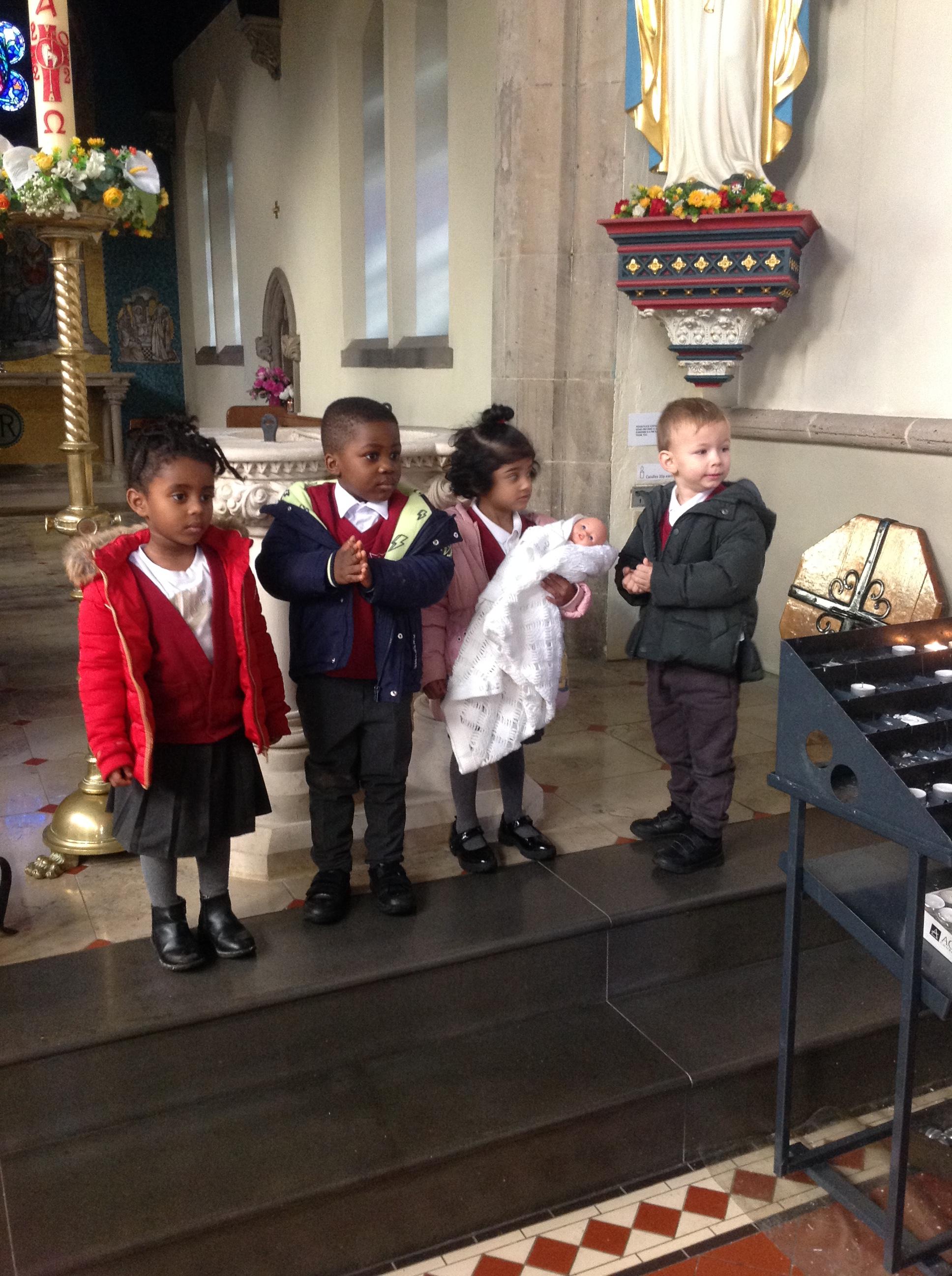 The children have been learning about the Sacrament of Baptism and visited St Osburg's Church to learn about how they are welcomed into God's family during their Baptism. They saw the Baptismal font and enjoyed a roleplay using water from the font which they poured over their baby's head. They decorated their names and displayed these alongside their Baptismal photographs.