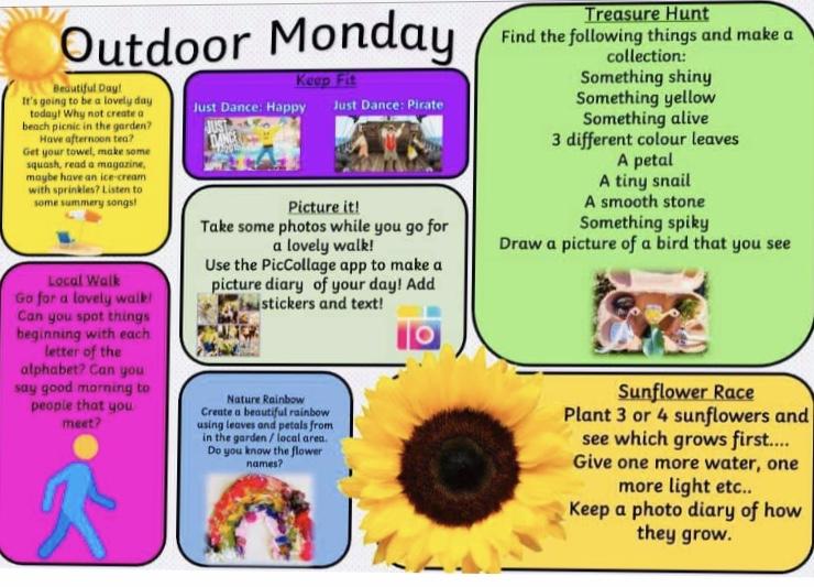 Welcome back to school for the final summer term boys and girls. I hope you have been enjoying the sunshine and playing outside with your family. A big well done to everyone who completed the Family Fun Challenges, a winner will be announced this week. In the meantime here are some more ideas for you to do at home. Pick a theme and have a go at some more home learning