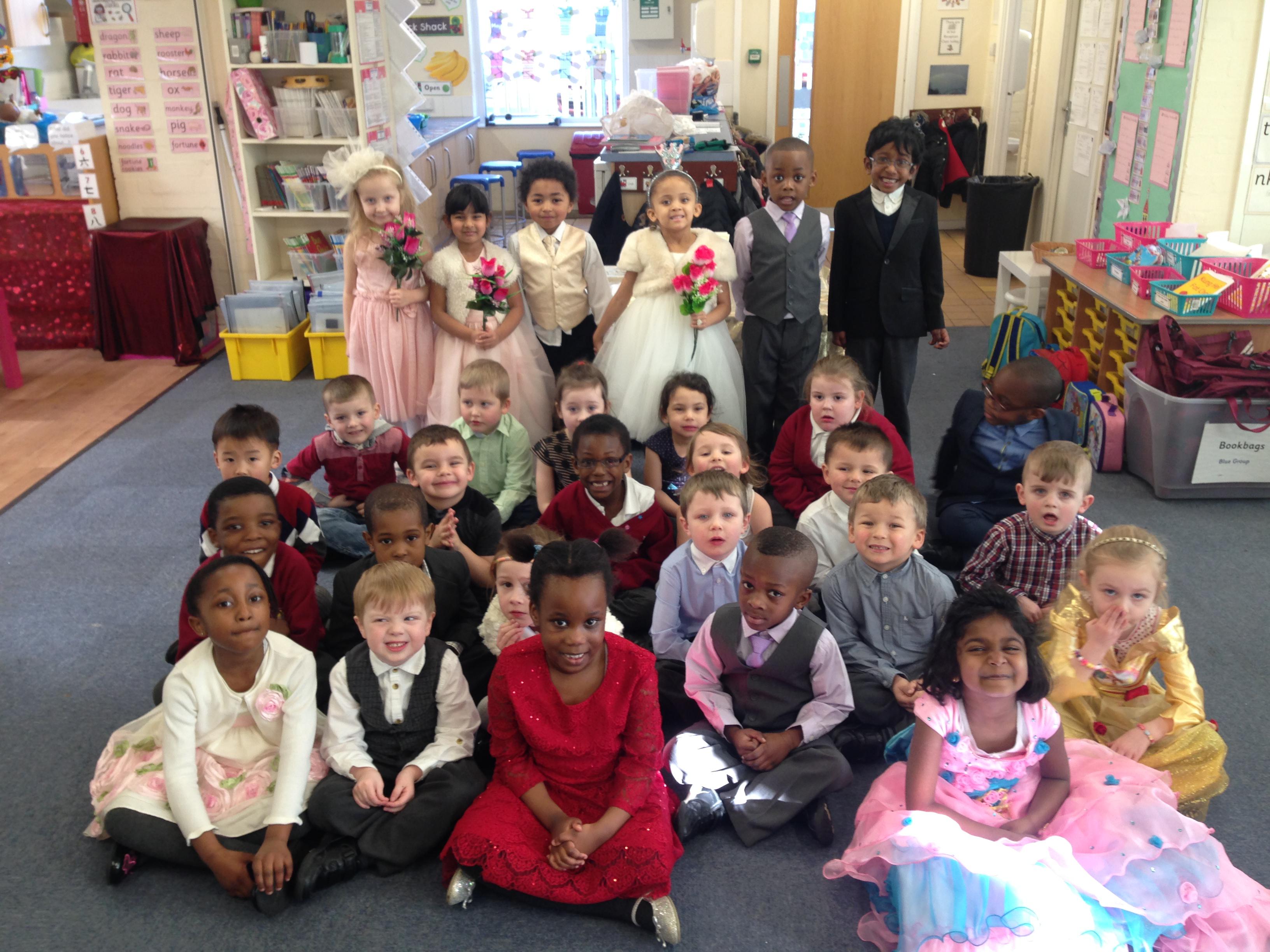We planned a celebration to act out a wedding. We know that two people get married when they love and care for each other. Before the wedding we spoke about why the sacrament of marriage is important. First, the bride and groom lit a candle to show they are individuals. They made special promises and gave each other a ring as a symbol of their everlasting love. Then the Bride and Groom lit a candle together to show that they are now one family. We celebrated the marriage by sprinkling confetti over the Bride and Groom. We then all shared the wedding cake and danced together.