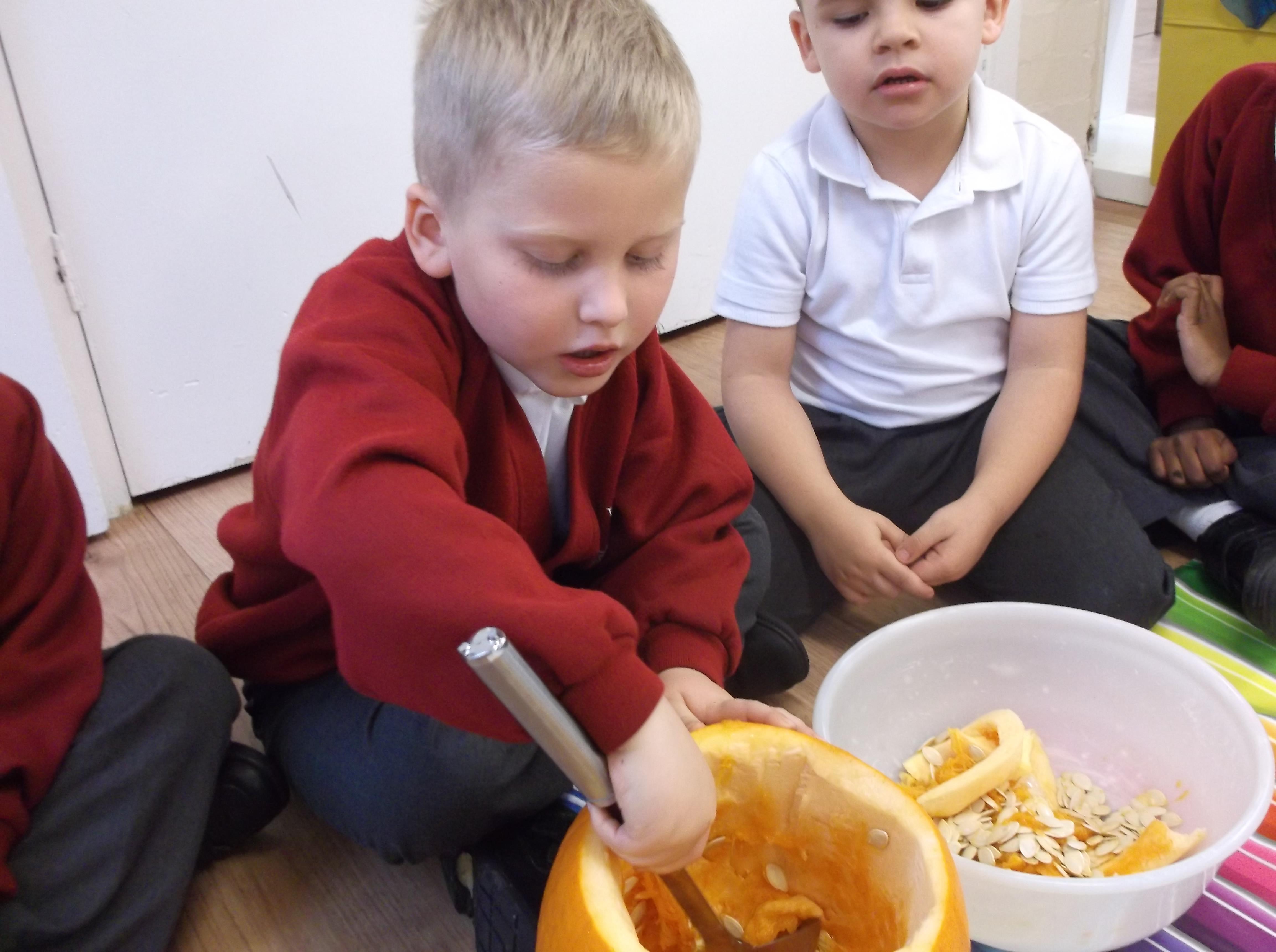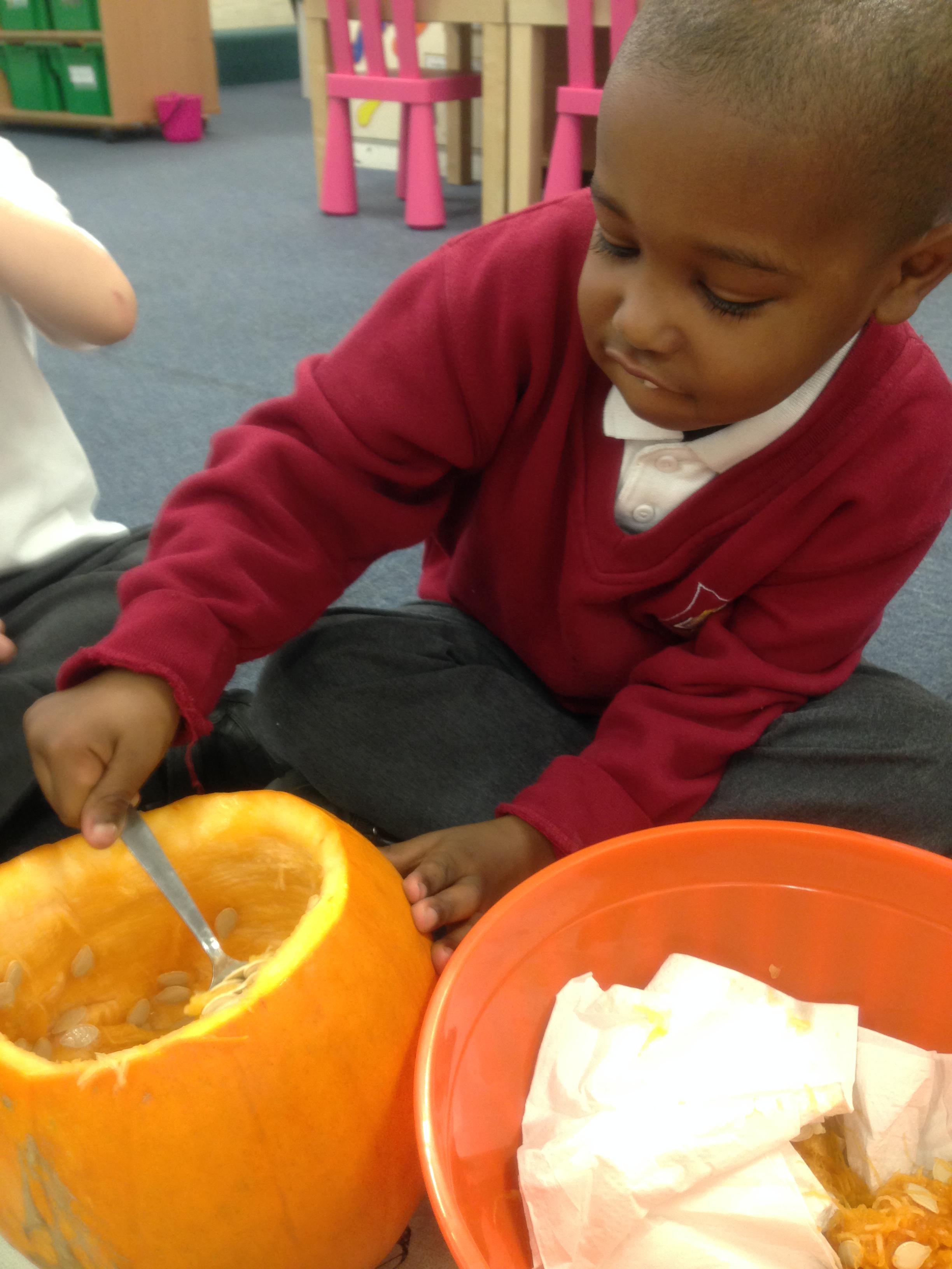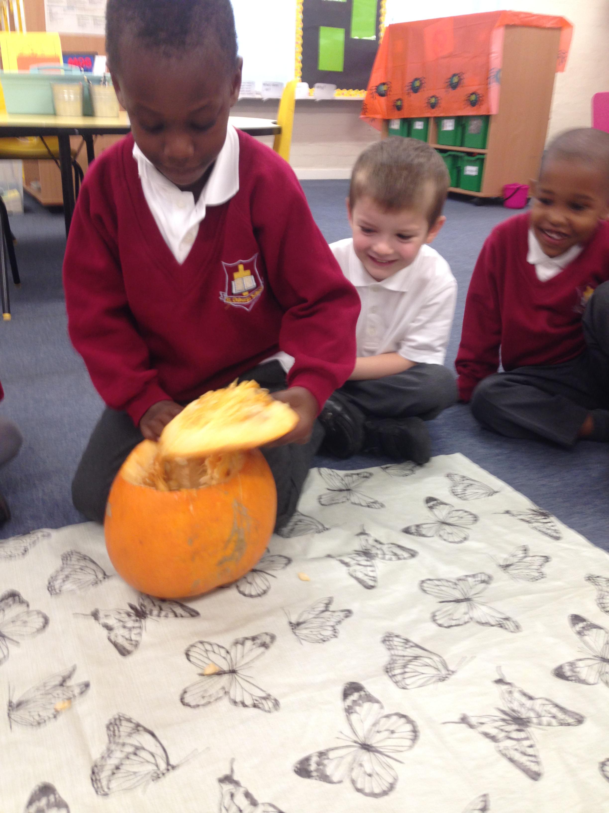 The children were so excited to help carve out a pumpkin and talk about what they found inside. We have put our pumpkins on our Autumn topic table.