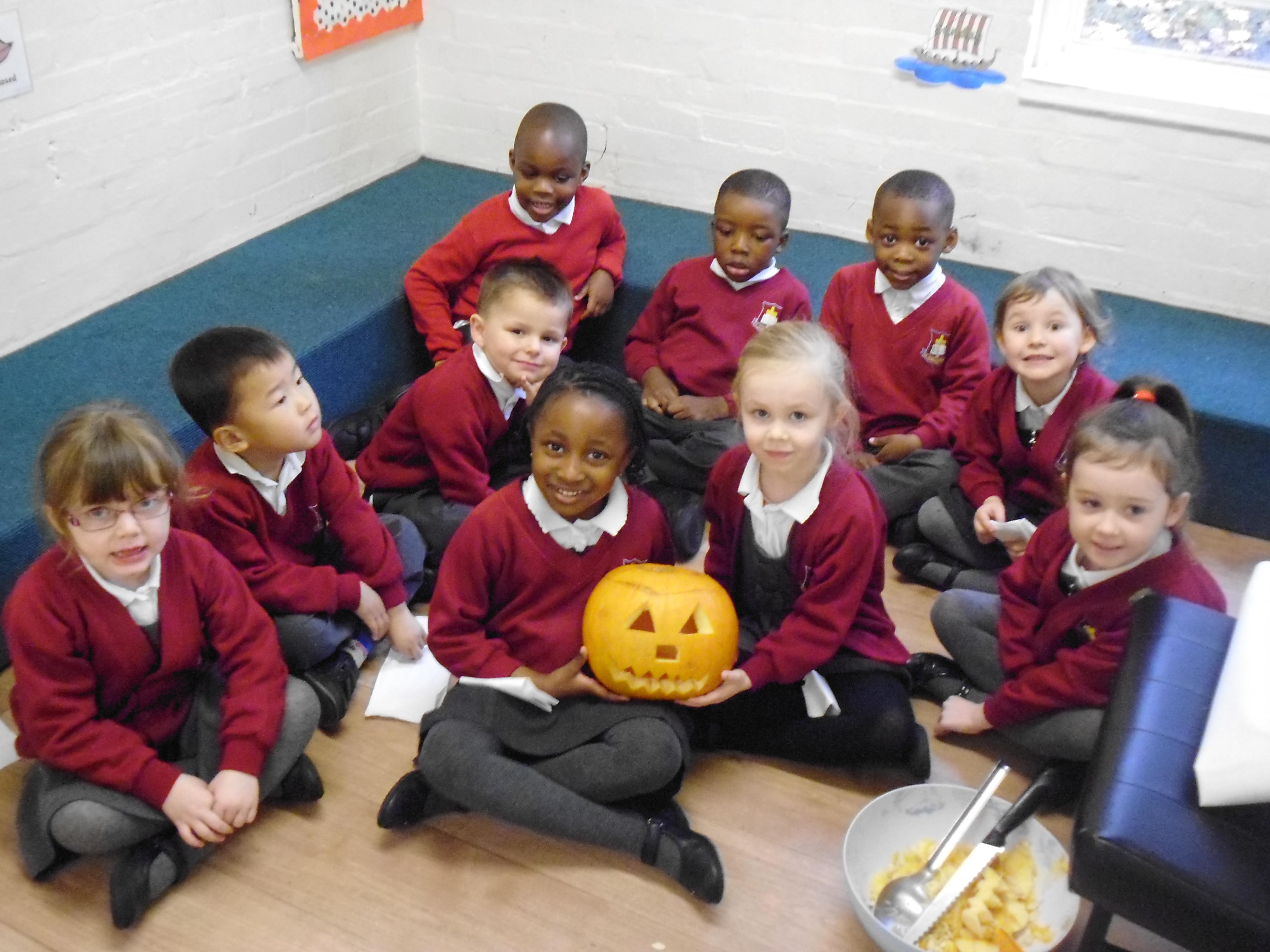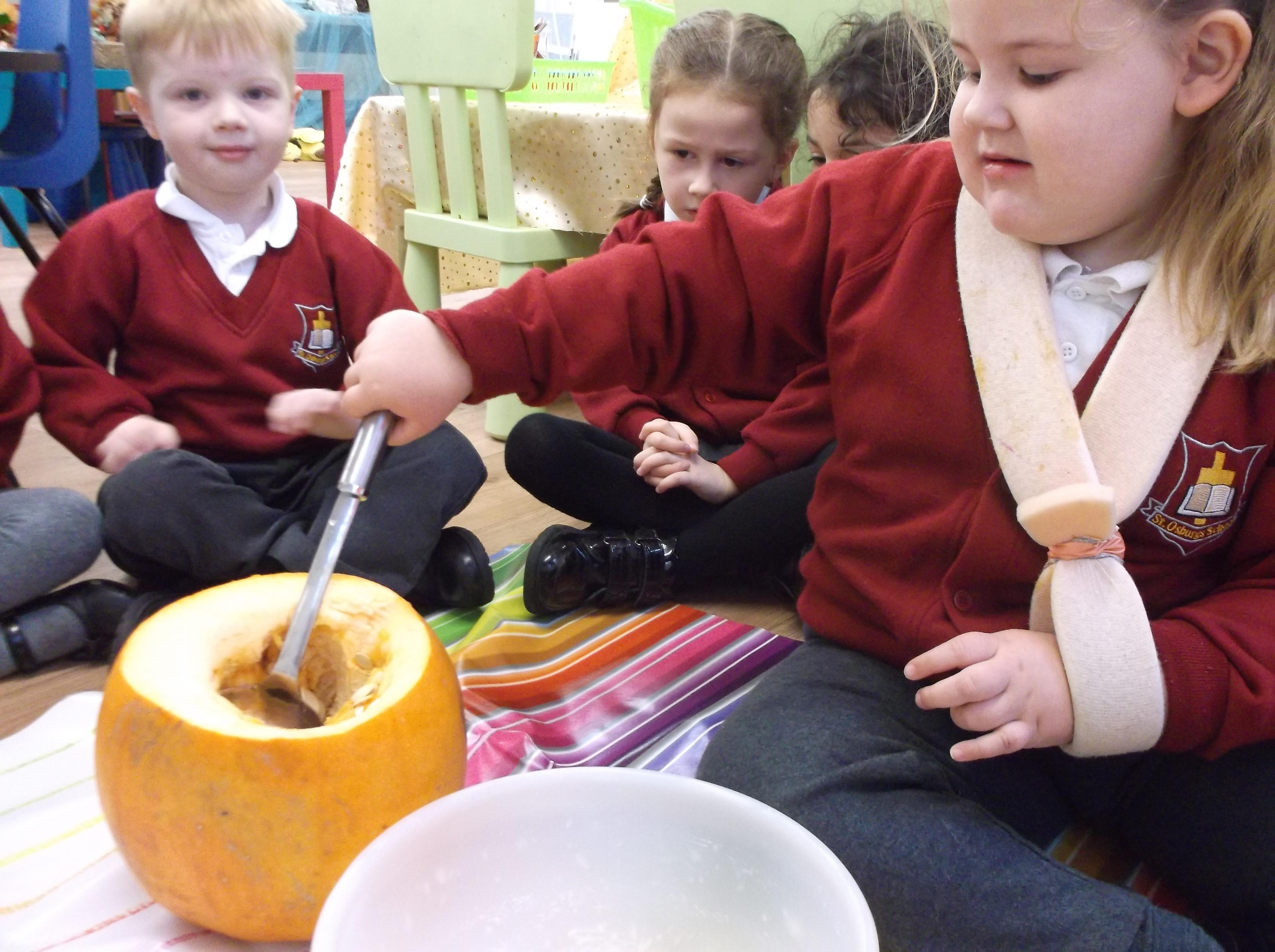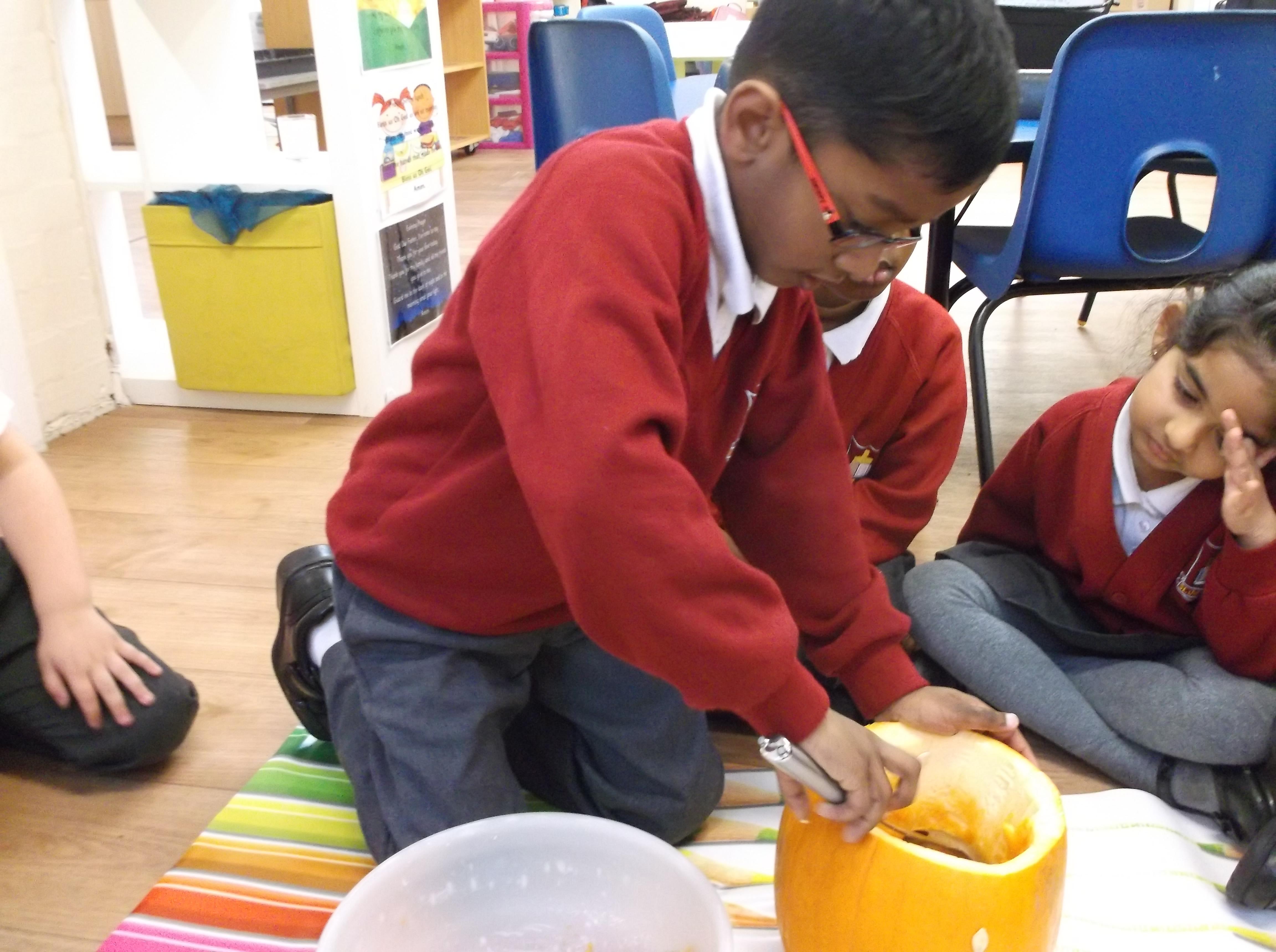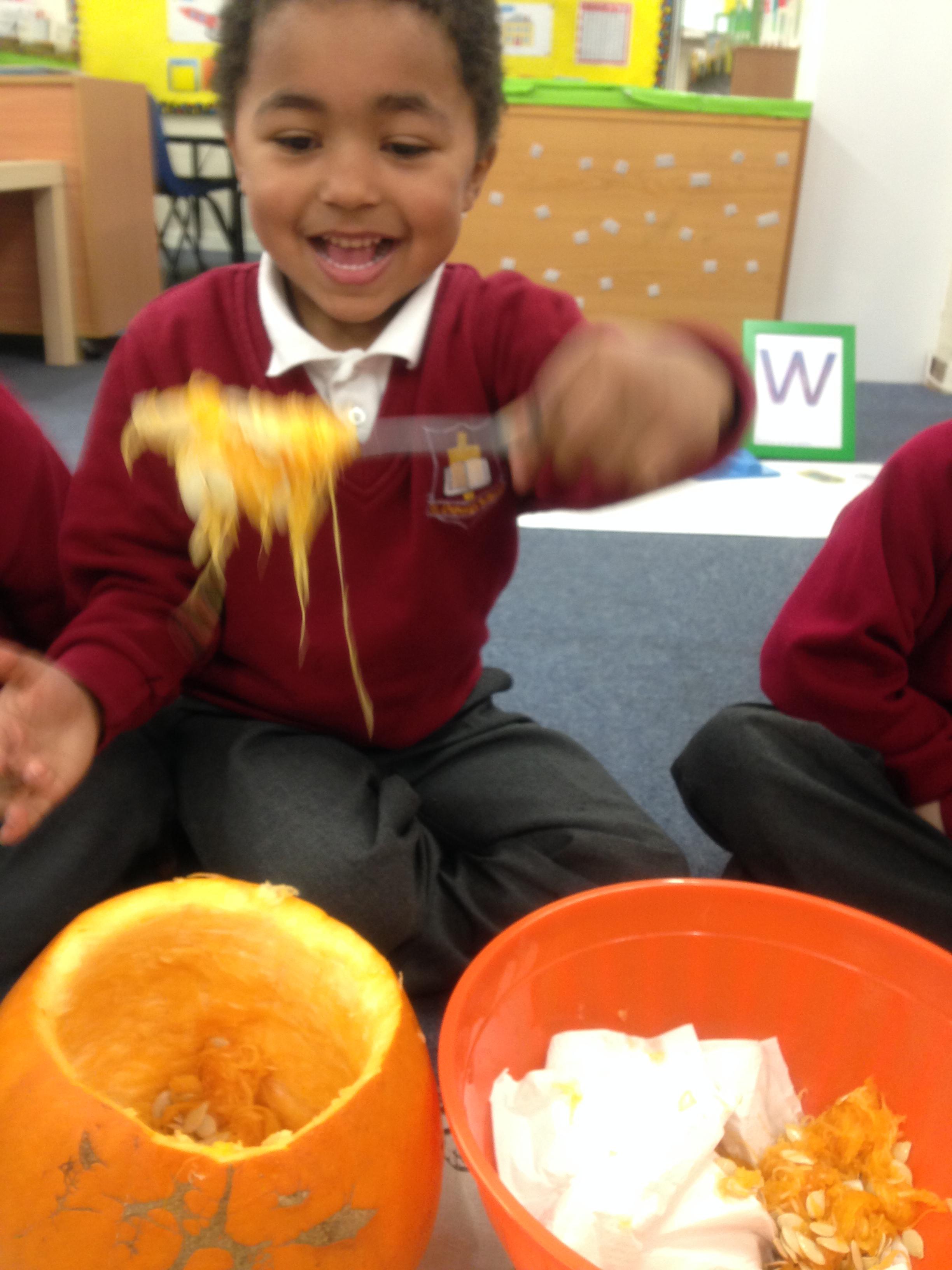The children were so excited to help carve out a pumpkin and talk about what they found inside. We have put our pumpkins on our Autumn topic table.