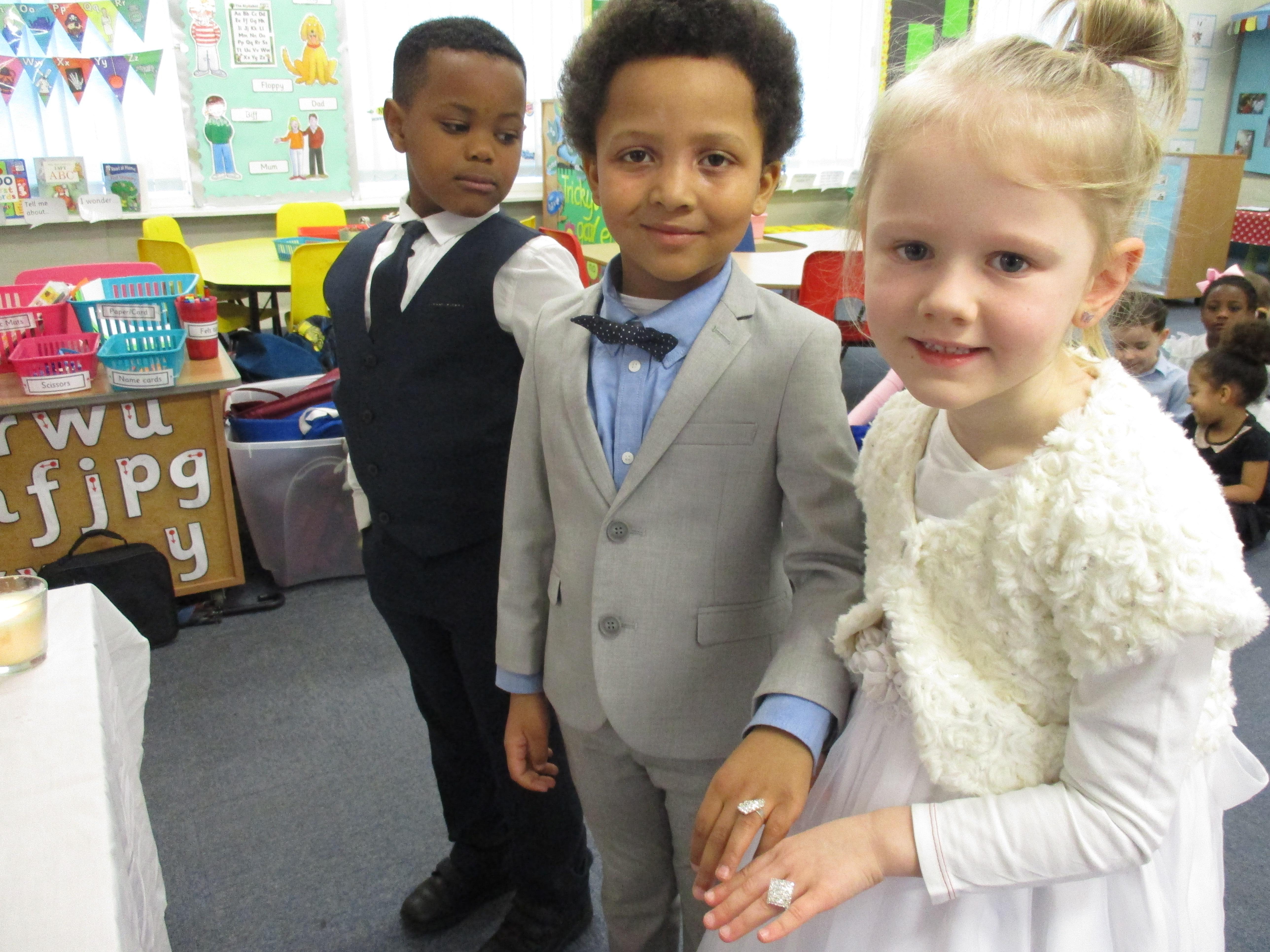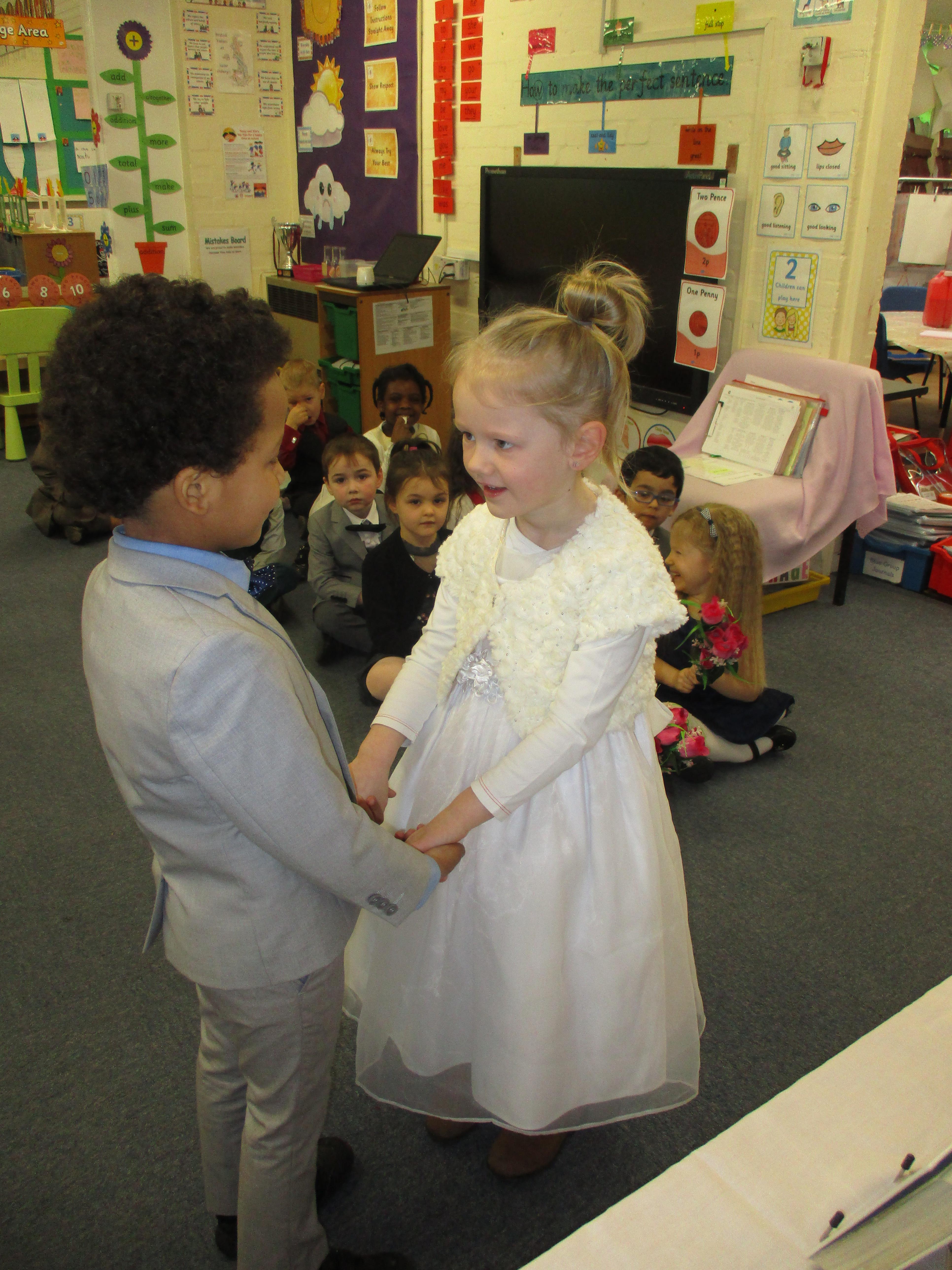 In Reception we have been learning all about marriage and today we hosted our own wedding at school. We had a bride and groom, priest, bridesmaids, best man and lots of guests. The bride and her bridesmaids walked up the aisle to 'Here Comes the Bride' - everyone was very excited. The priest made the couple say some special vows to one another and they gave each other a ring to wear to show their everlasting love. The bride and groom walked back down the aisle to the 'Wedding March'. We all celebrated by throwing confetti, eating wedding cake and dancing together. It was a brilliant wedding!