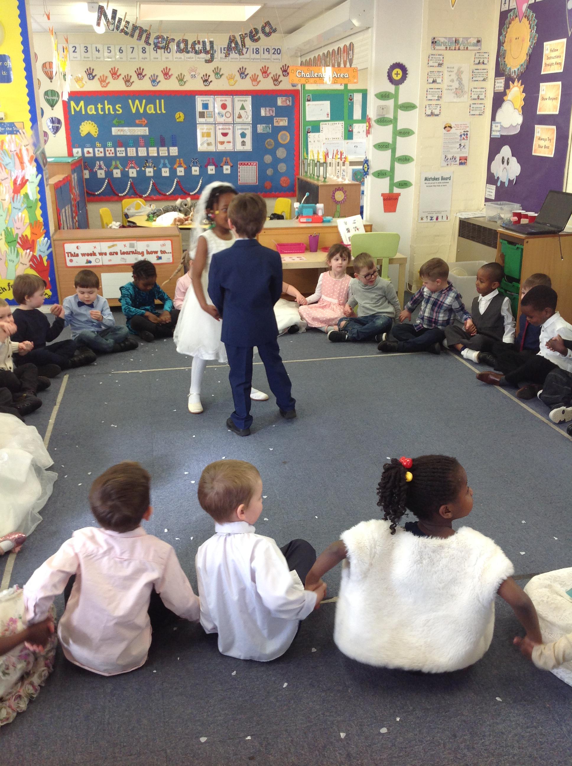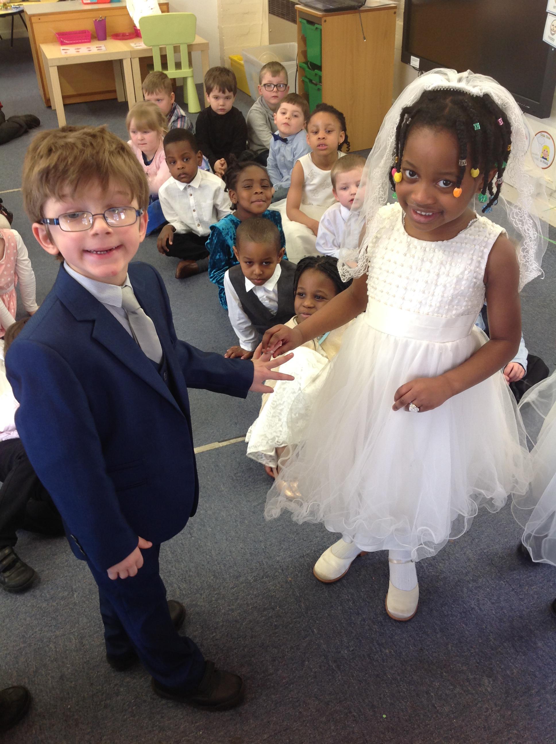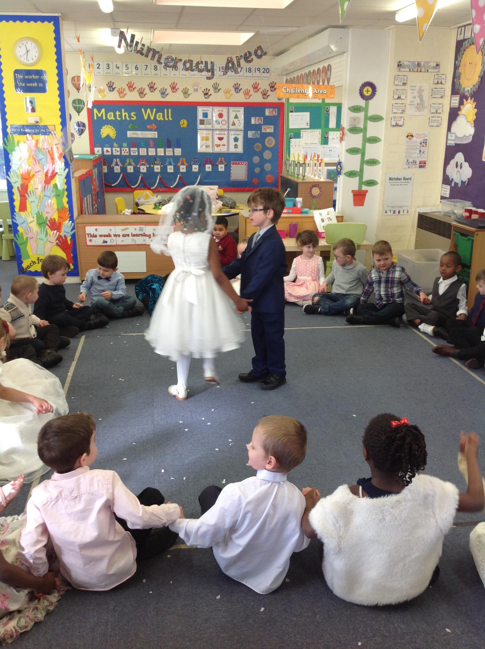 Reception acted out their very own wedding in class today. The children came to school dressed for the occasion. We had a bride and groom, a bridesmaid and best man and priest to marry the happy couple. The children learnt that people get married when they love each other. During the ceremony the bride and groom made special promises to one another and gave each other a ring as a sign of the love they have for each other. After the service the children celebrated by throwing confetti, eating cake and having a party. What a brilliant wedding it was!