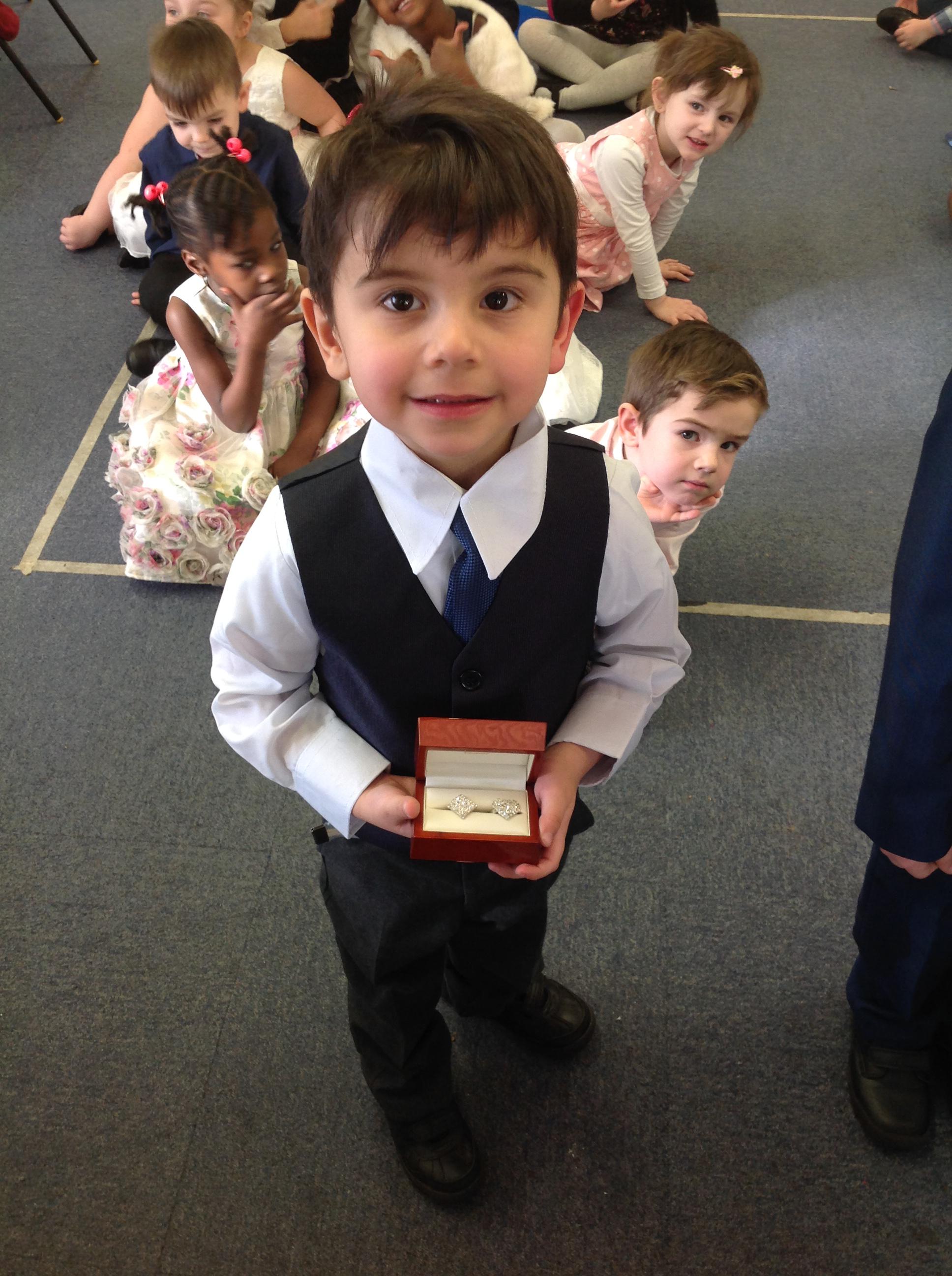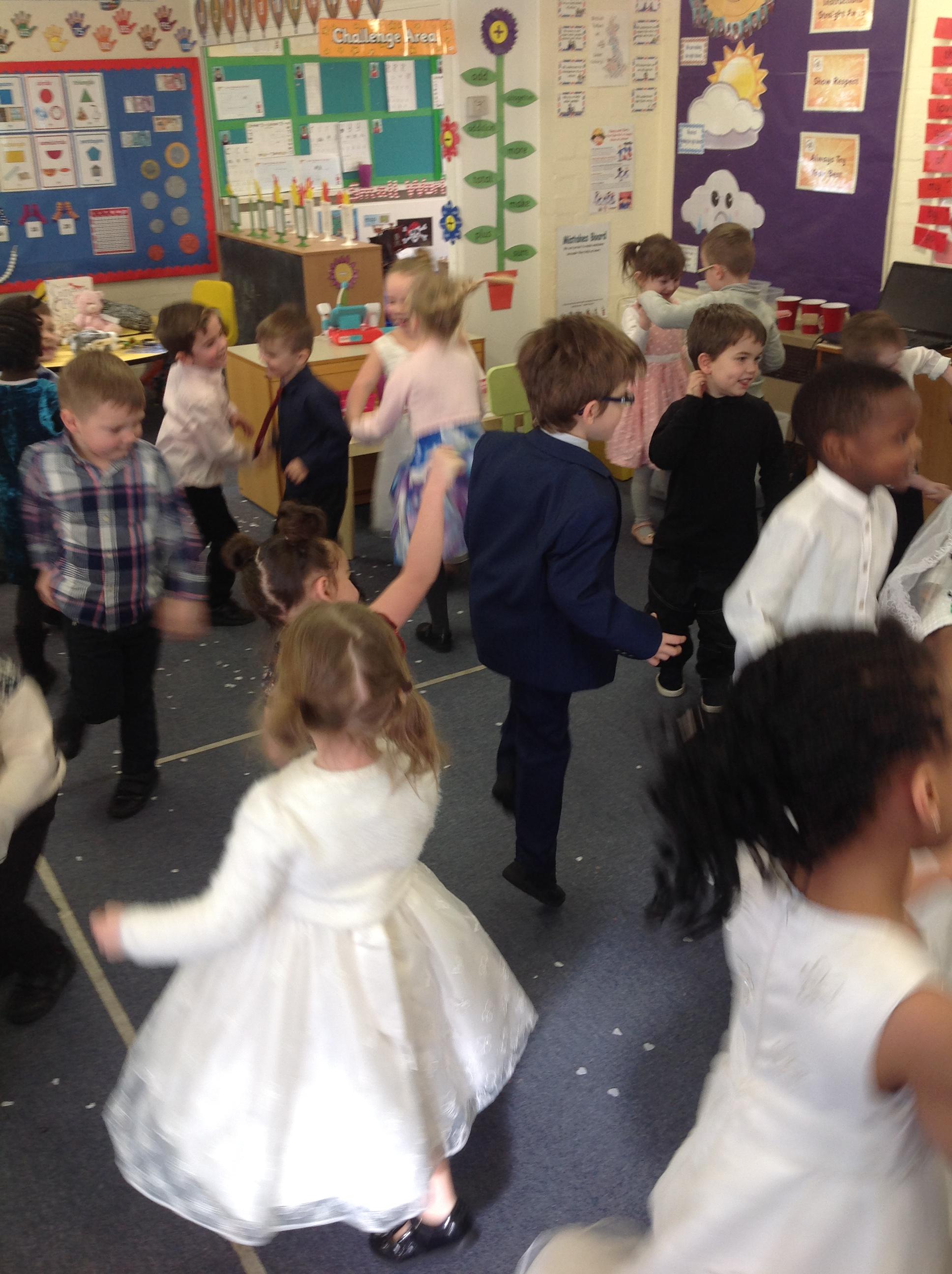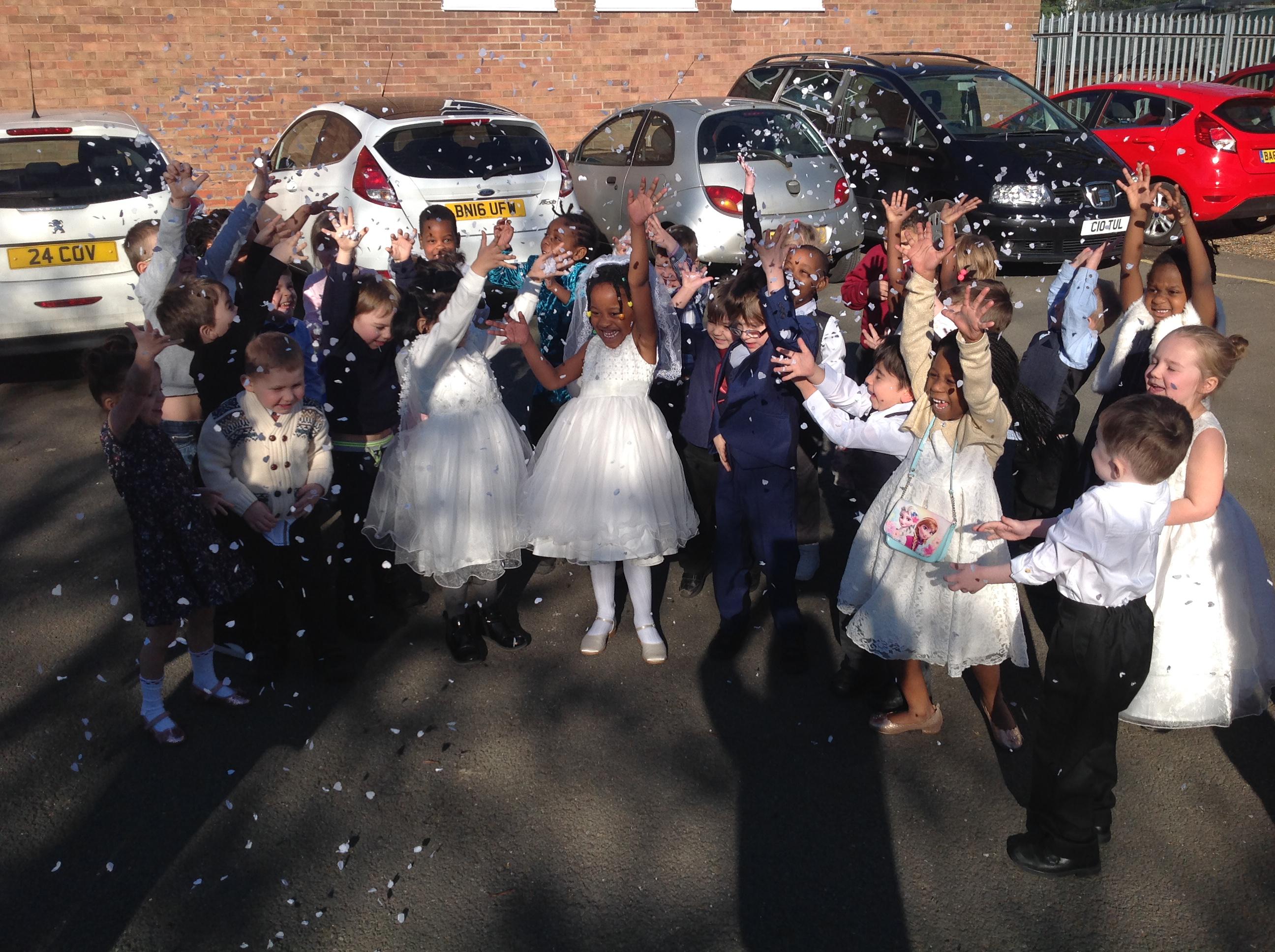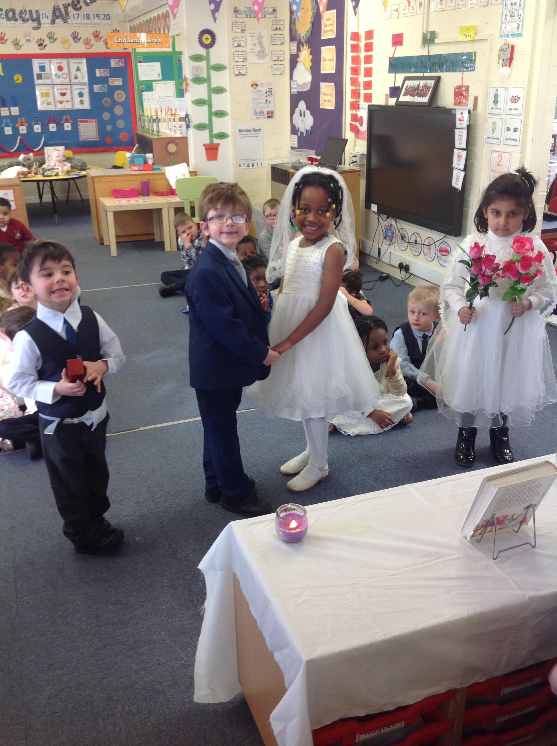 Reception acted out their very own wedding in class today. The children came to school dressed for the occasion. We had a bride and groom, a bridesmaid and best man and priest to marry the happy couple. The children learnt that people get married when they love each other. During the ceremony the bride and groom made special promises to one another and gave each other a ring as a sign of the love they have for each other. After the service the children celebrated by throwing confetti, eating cake and having a party. What a brilliant wedding it was!