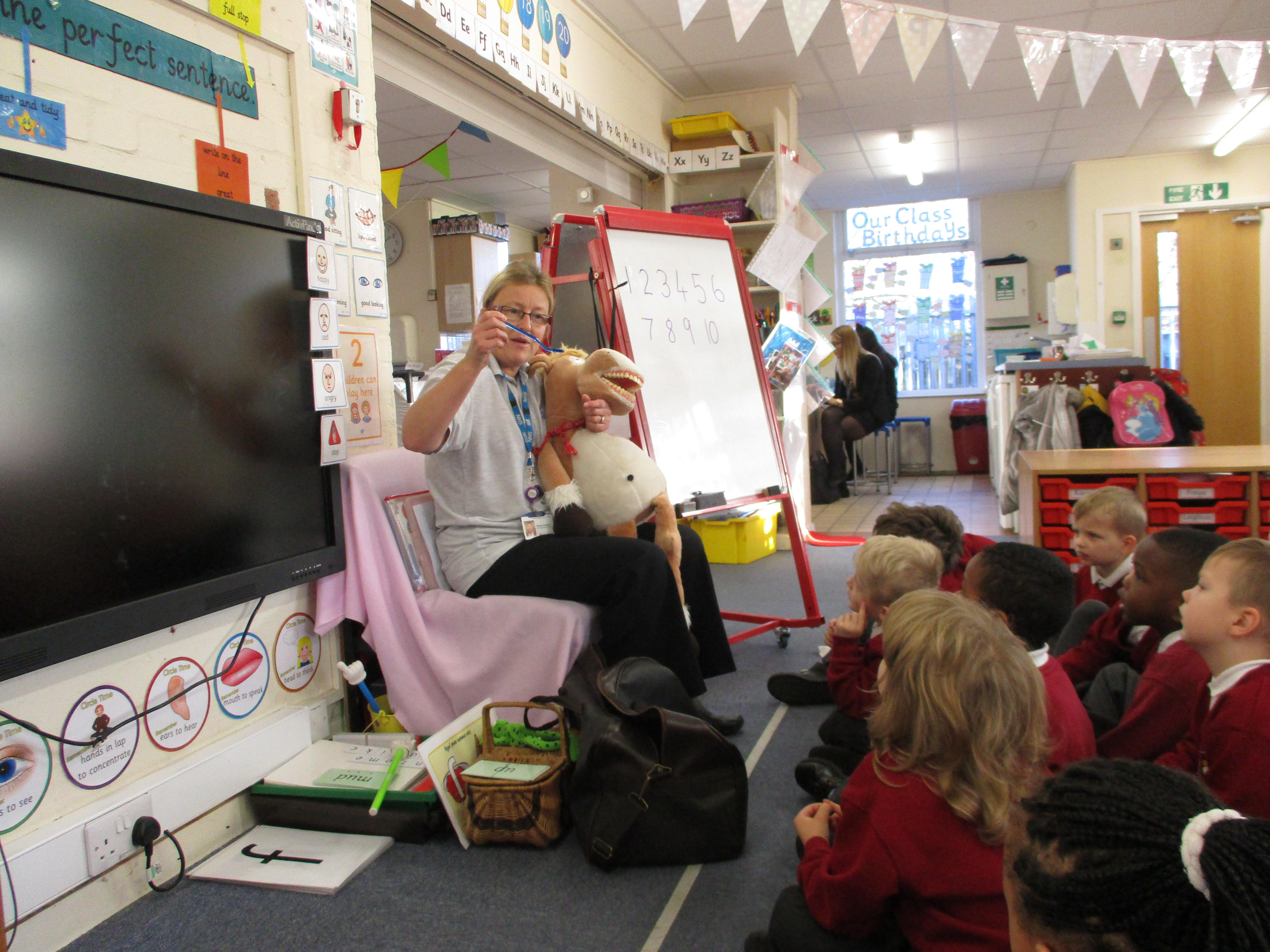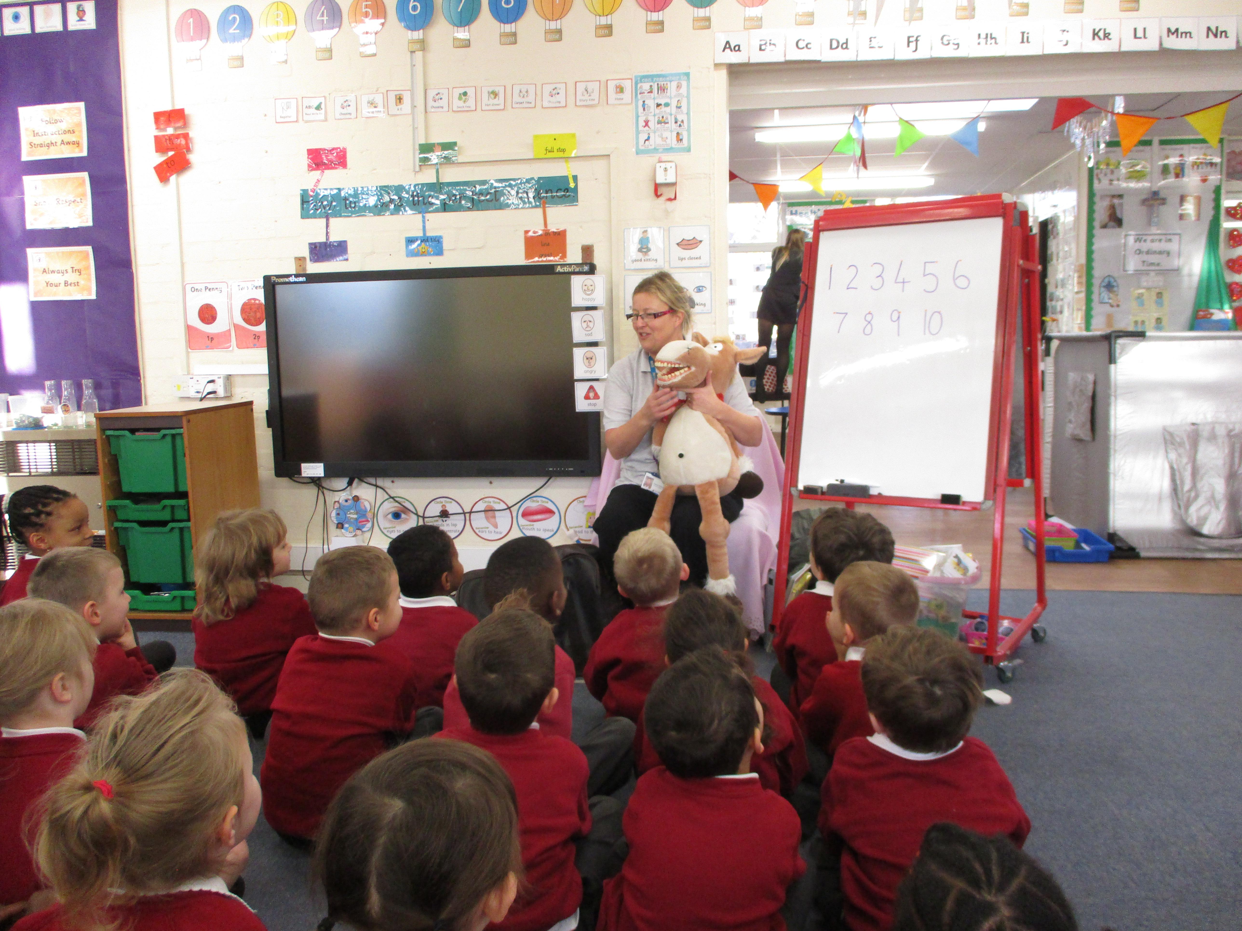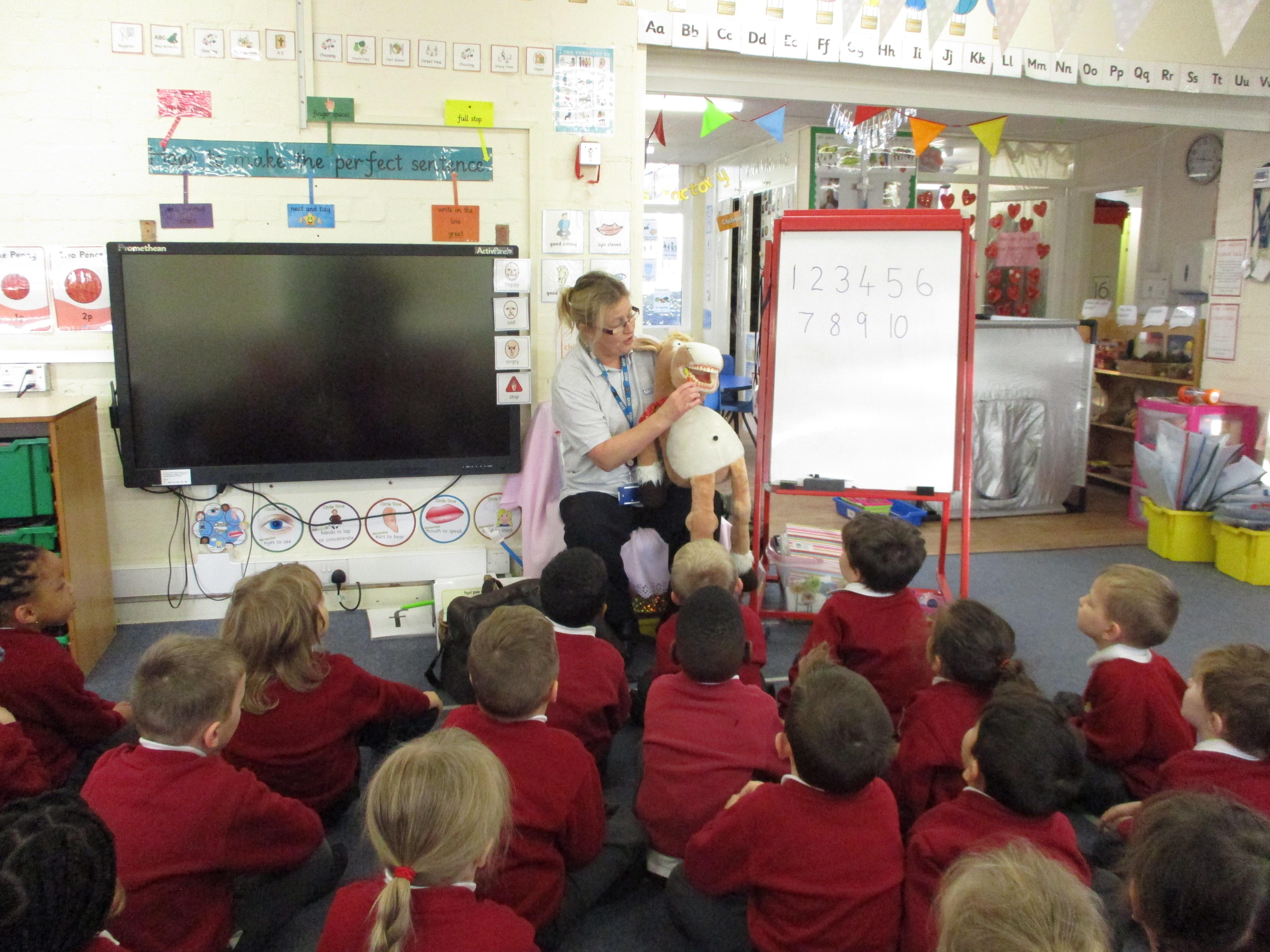 Reception had a visit from the school dental nurse and her friend Horris the Horse. Debbie talked to the children about their teeth and what they need their teeth for. Debbie used Horris to show the children how the dentist looks at the children's teeth and how to brush their teeth to make sure each one of them was cleaned properly. She also reminded the children of the types of food they should eat and how to keep their teeth healthy.
