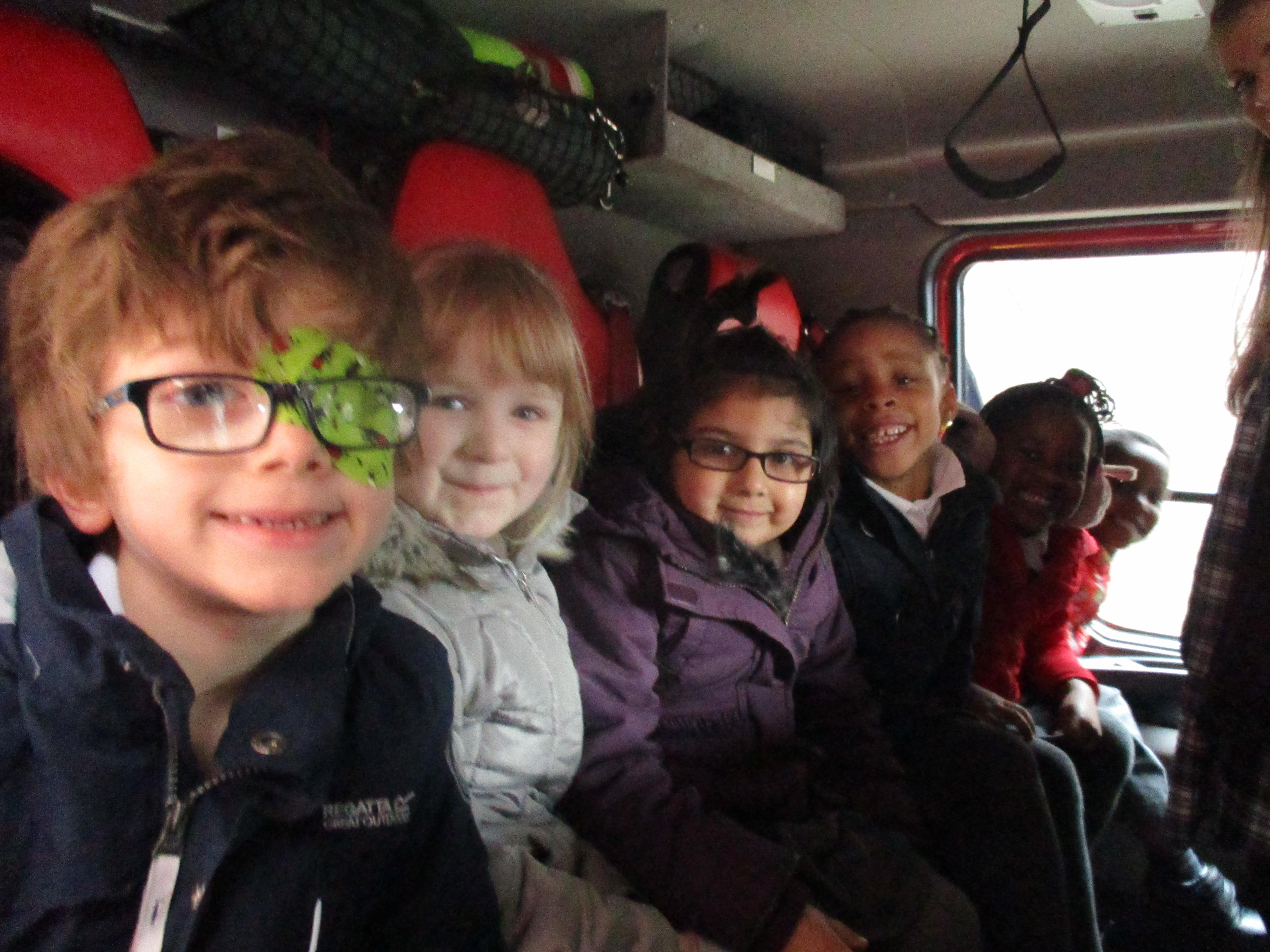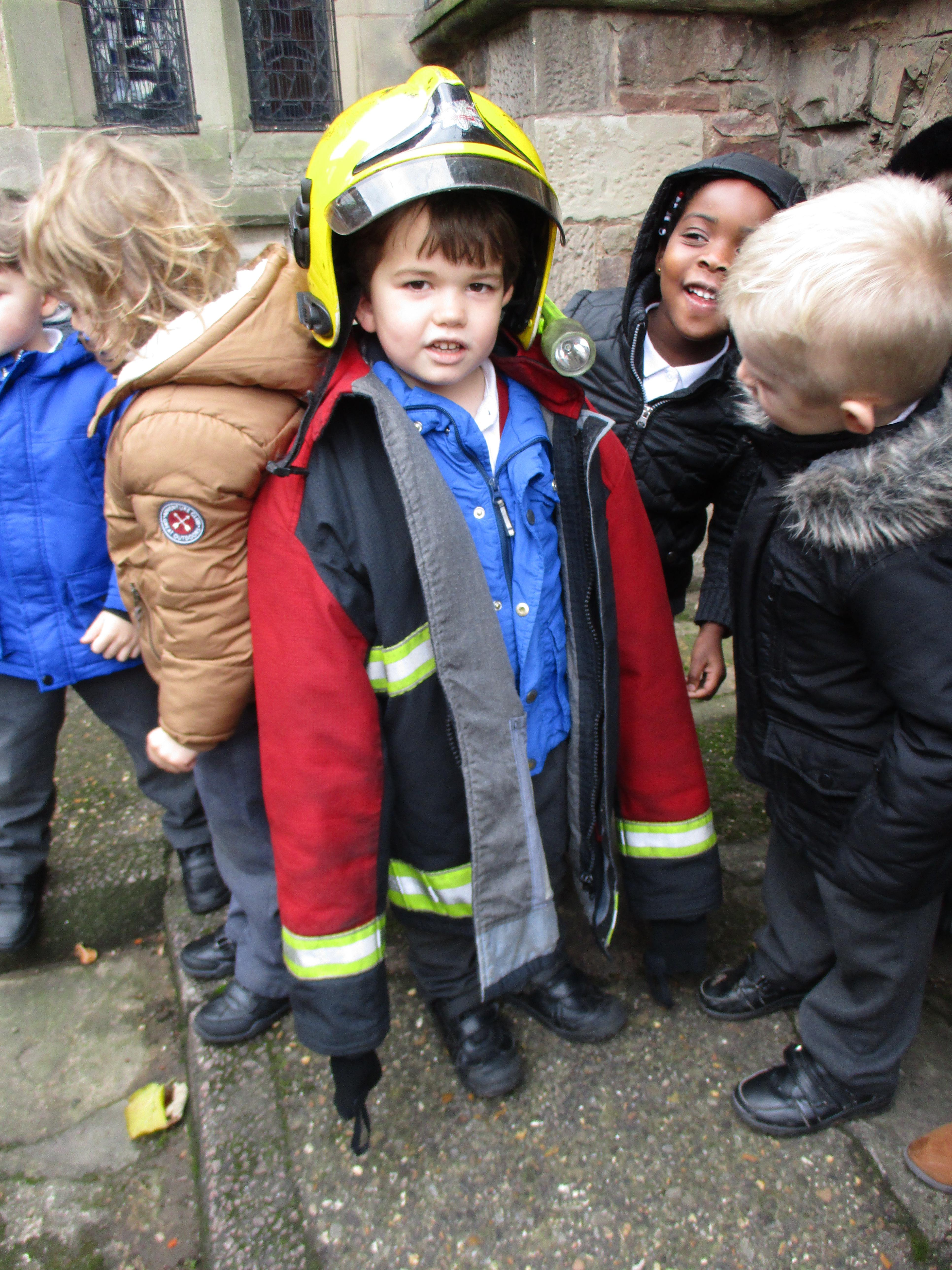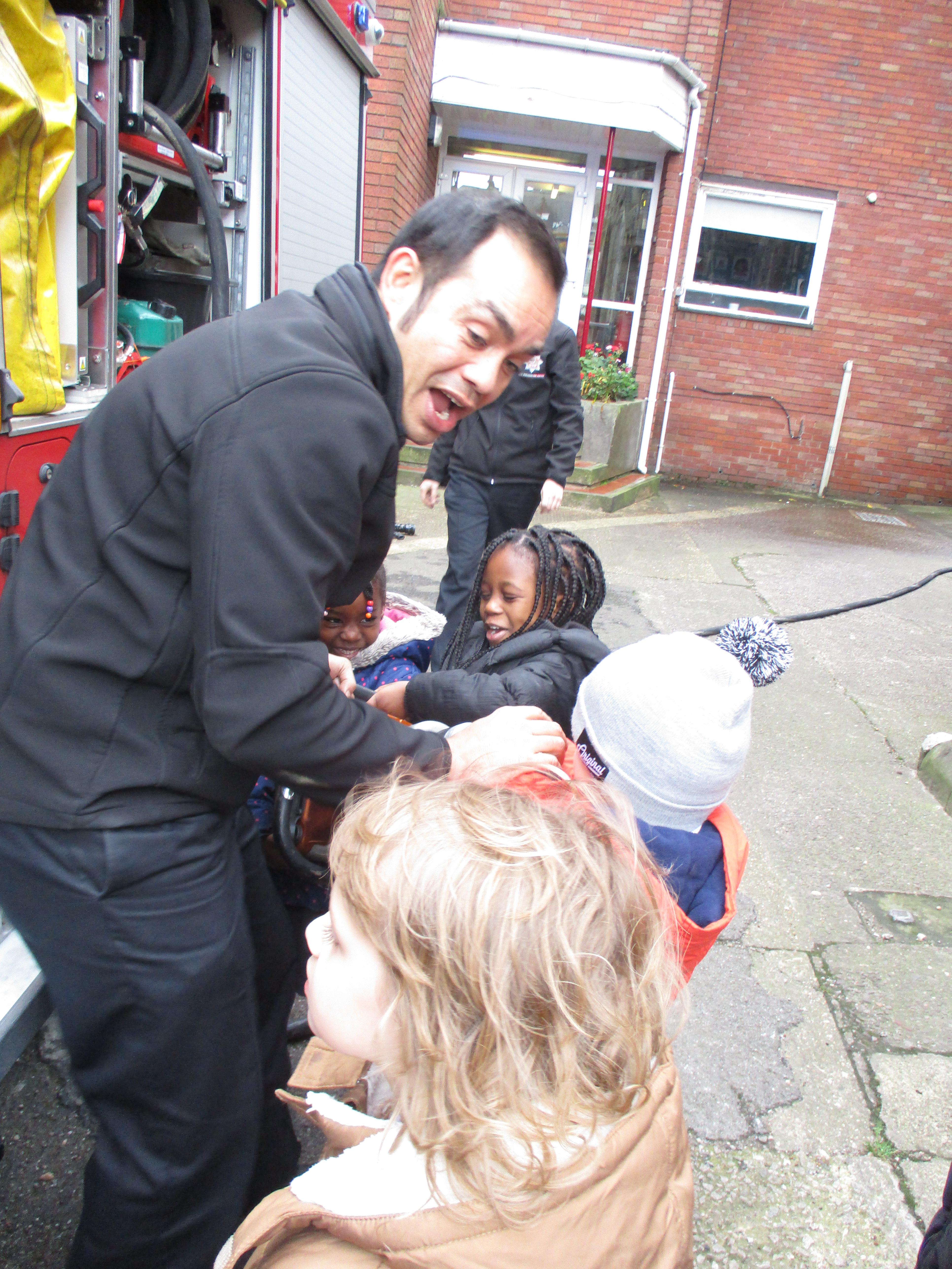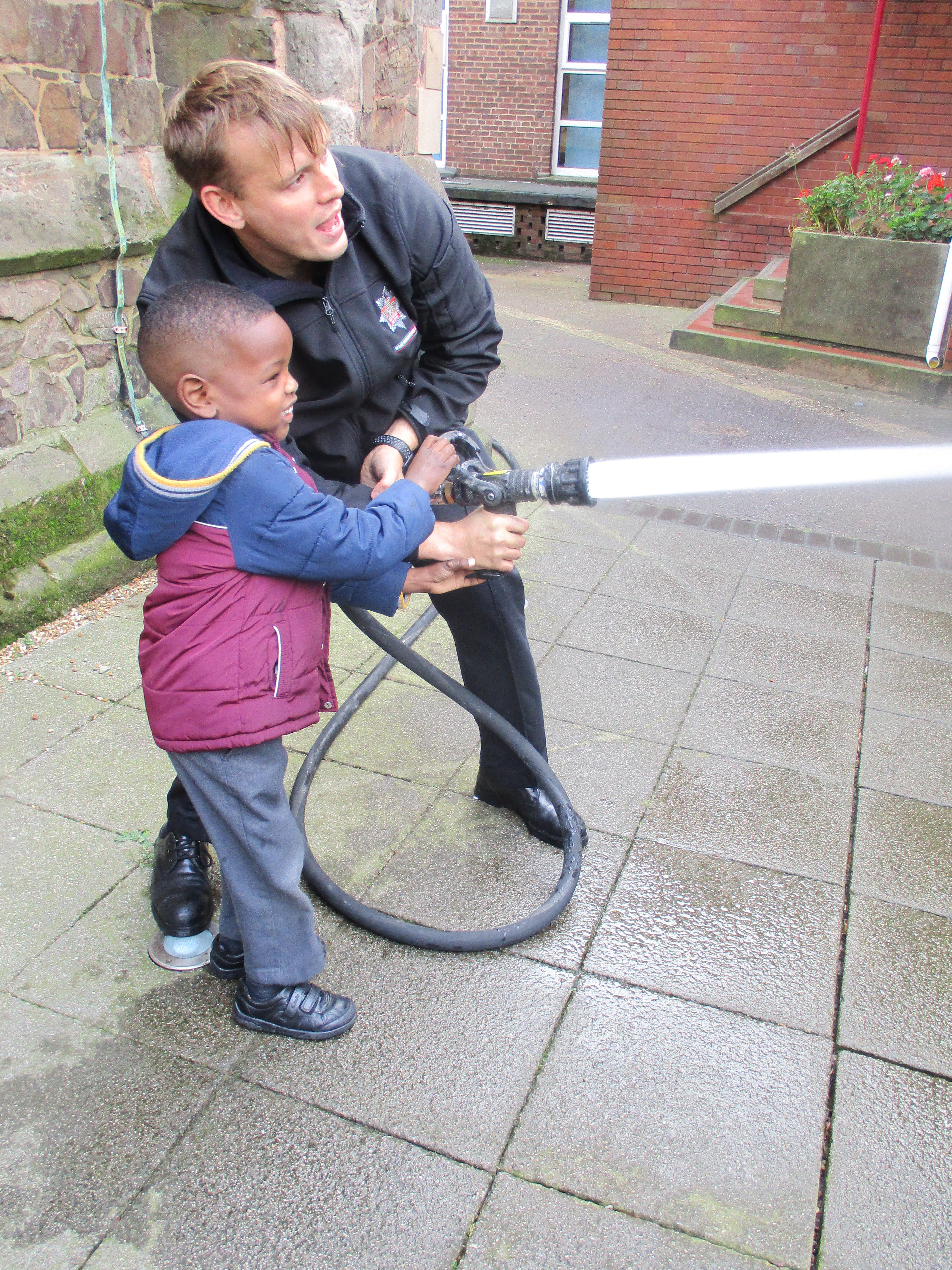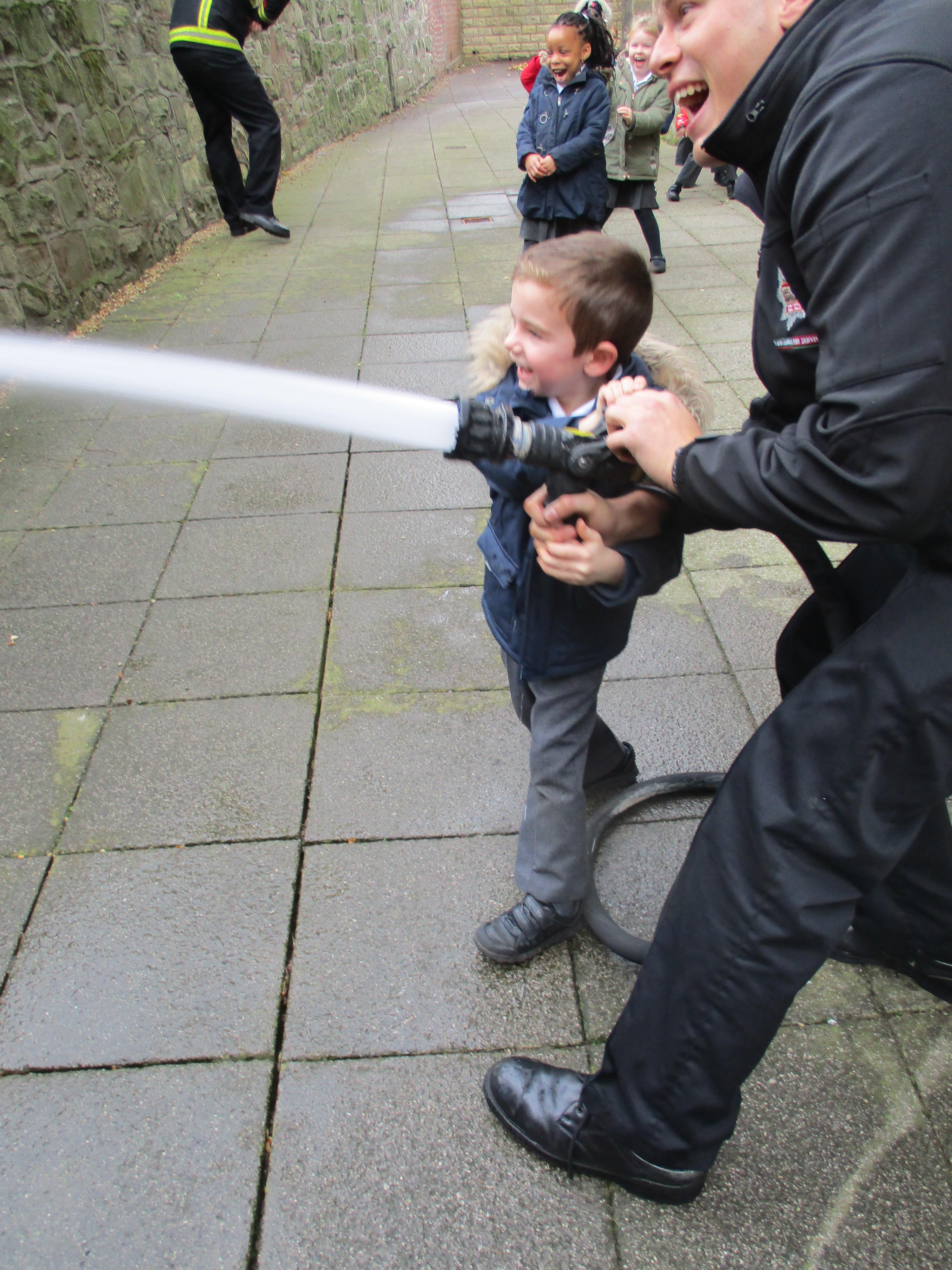 Reception had a very exciting morning when the firemen came to visit. They all had a go at using the firemen's hose, trying on the special fire fighter uniform and all had a turn at sitting in the fire engine with the blue flashing lights on!The firemen told the children all about their job and what they need to do if they ever needed to call the firemen.
