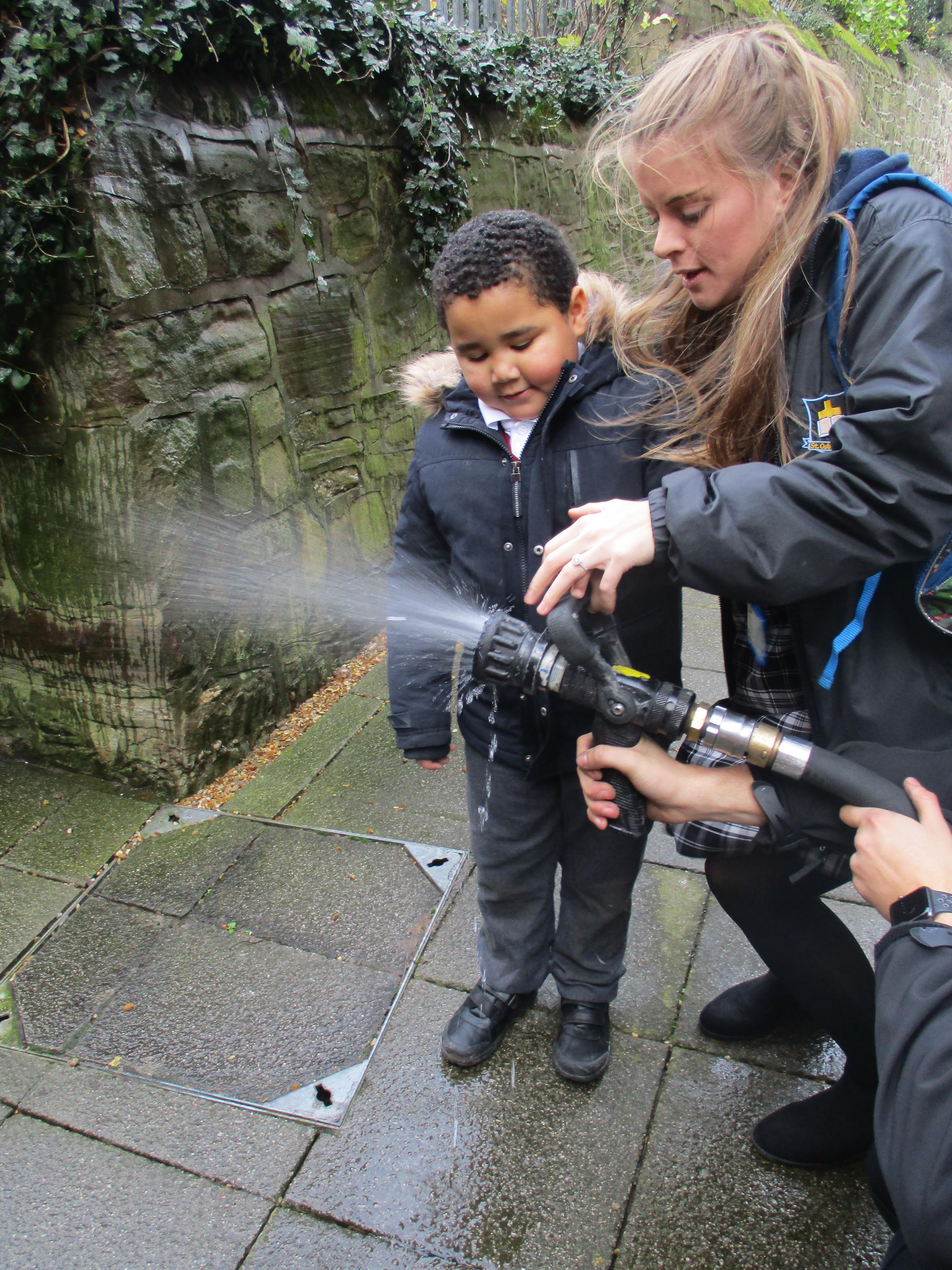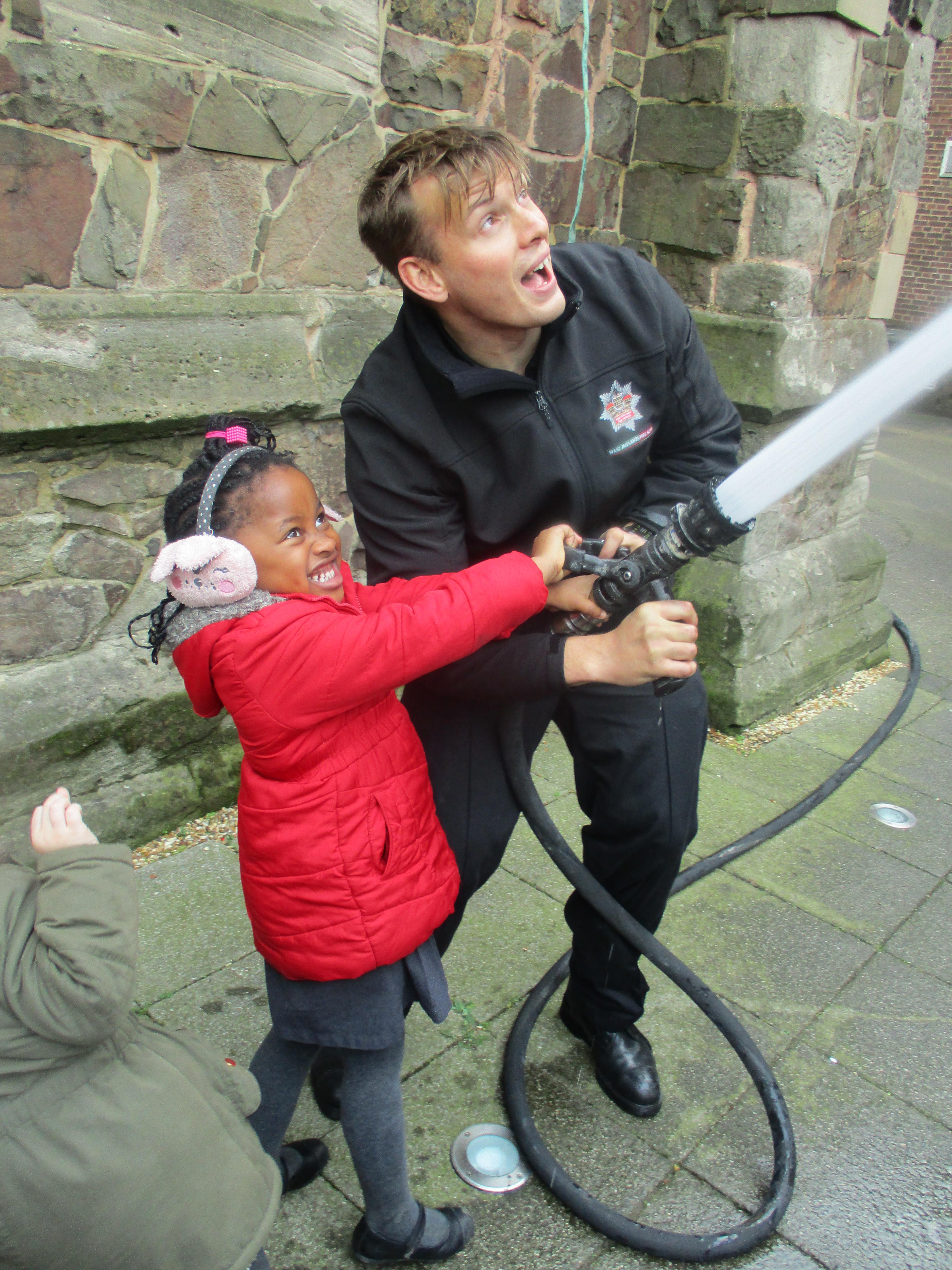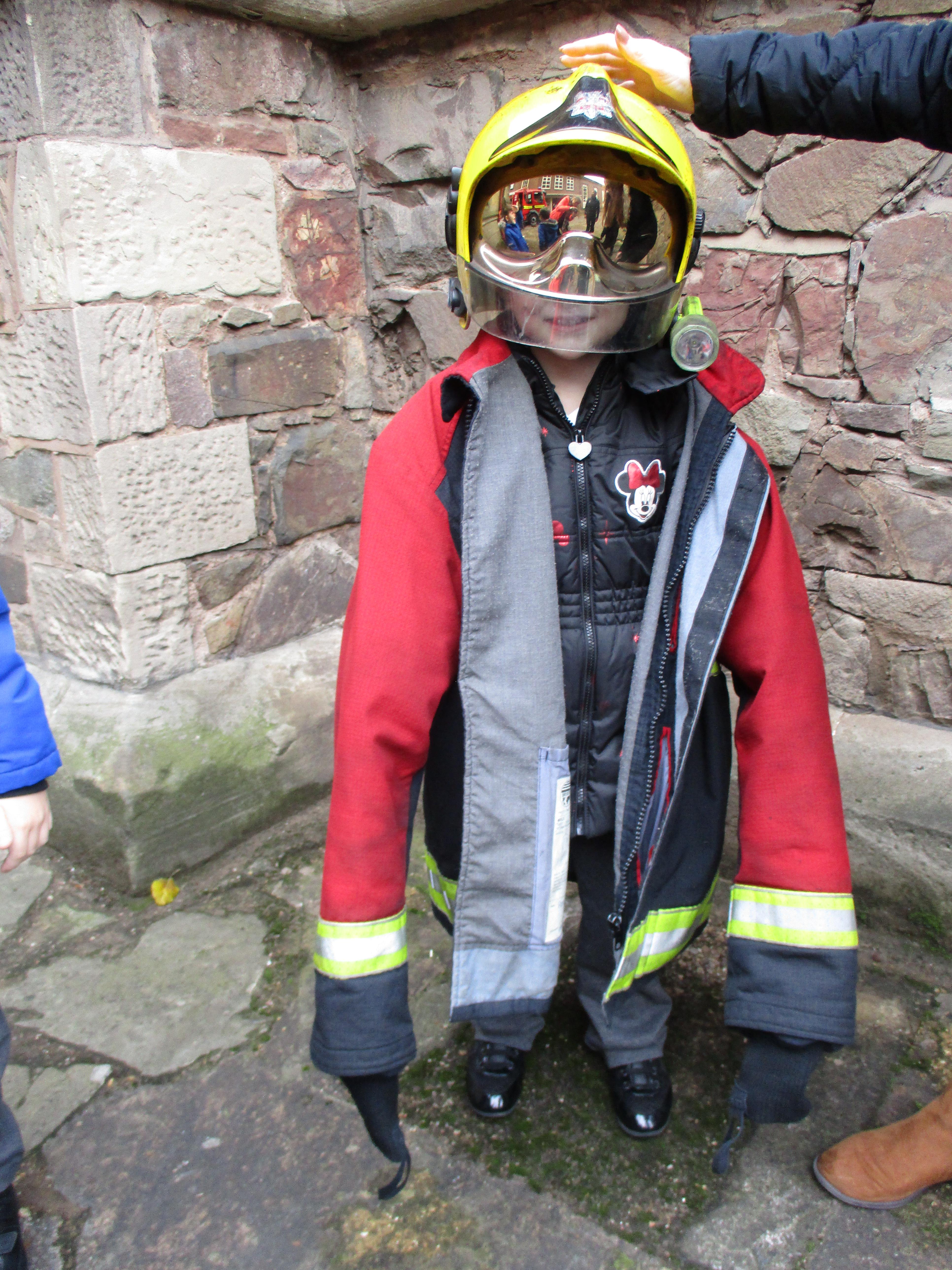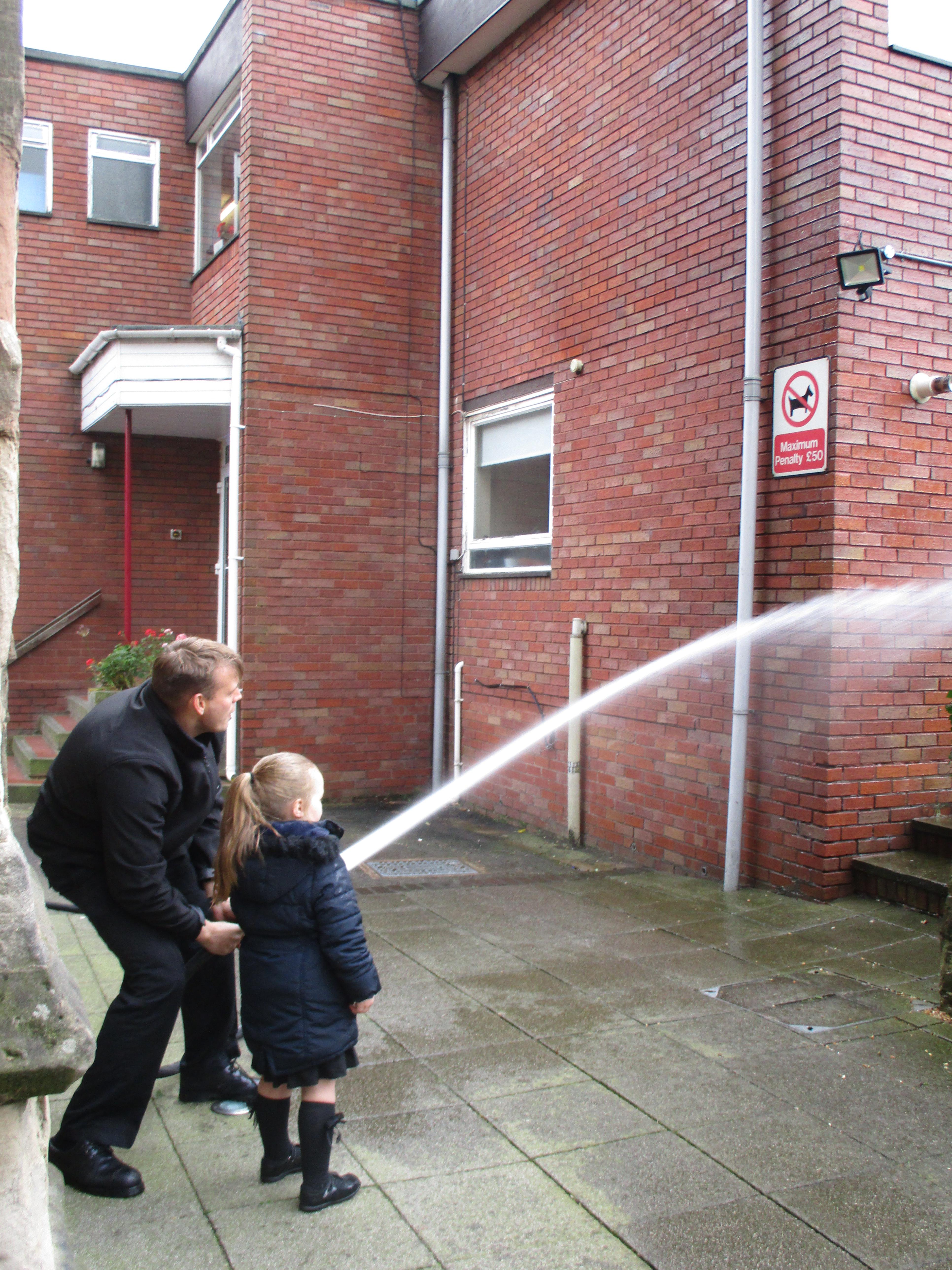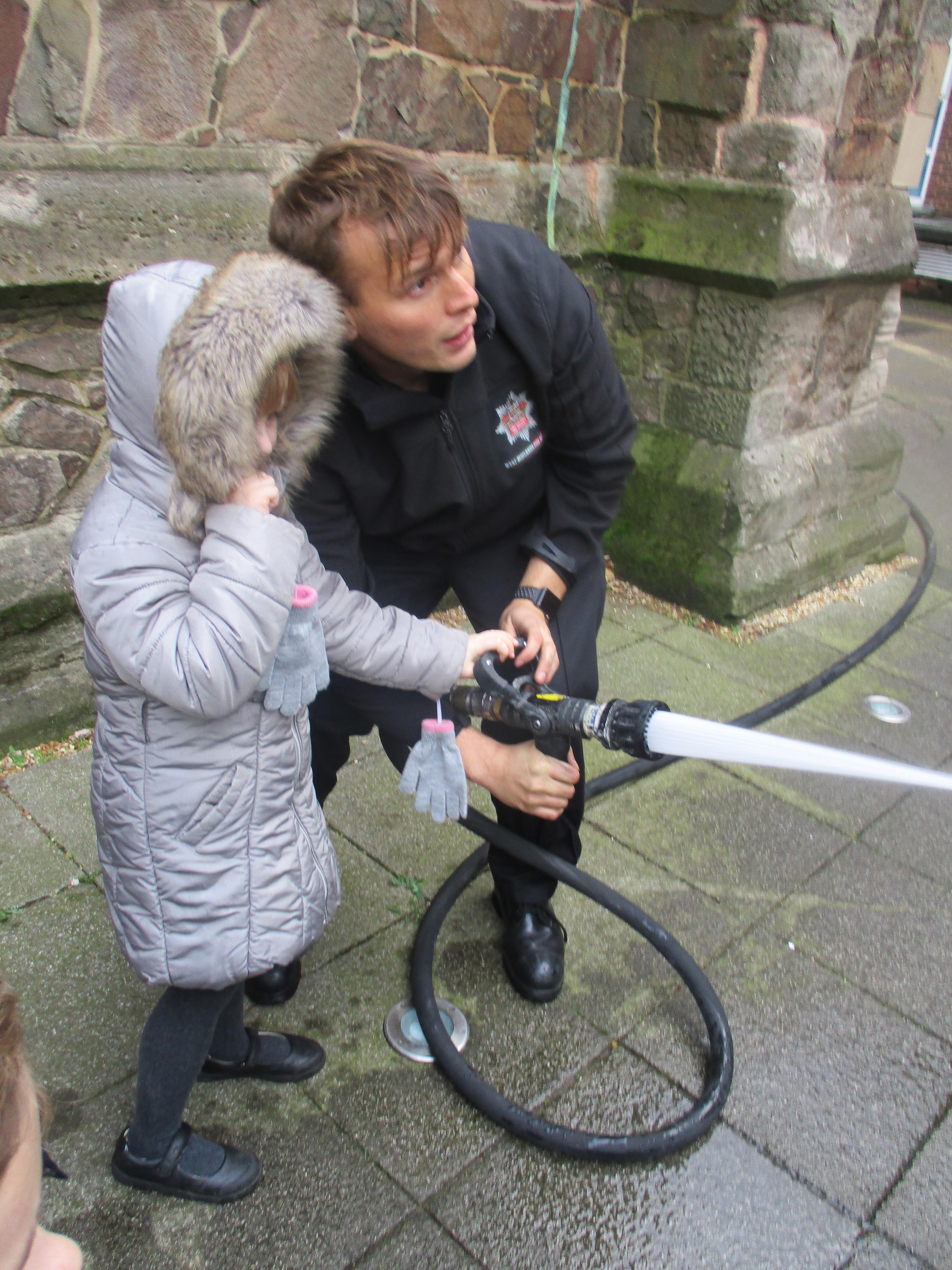Reception had a very exciting morning when the firemen came to visit. They all had a go at using the firemen's hose, trying on the special fire fighter uniform and all had a turn at sitting in the fire engine with the blue flashing lights on!The firemen told the children all about their job and what they need to do if they ever needed to call the firemen.
