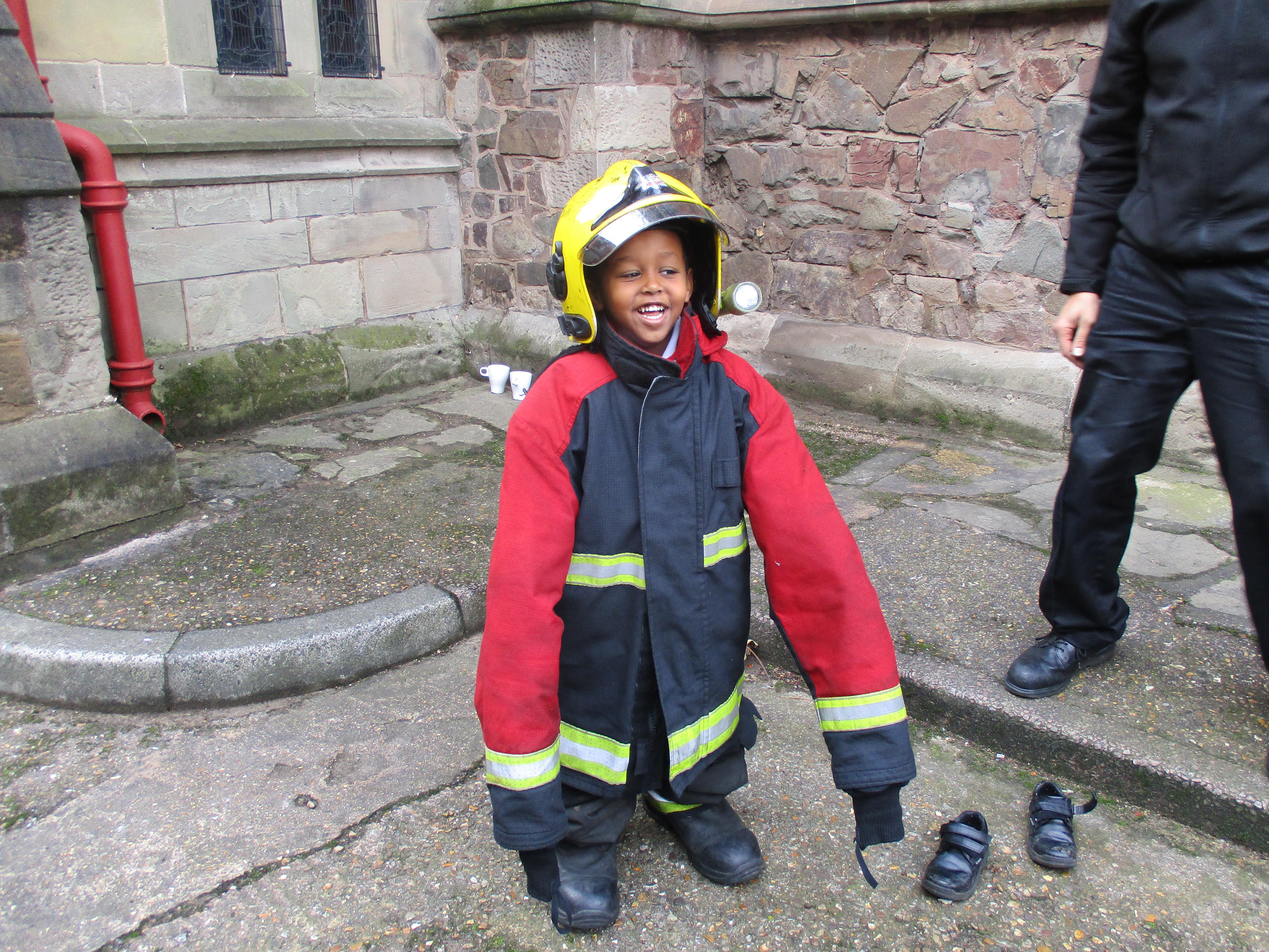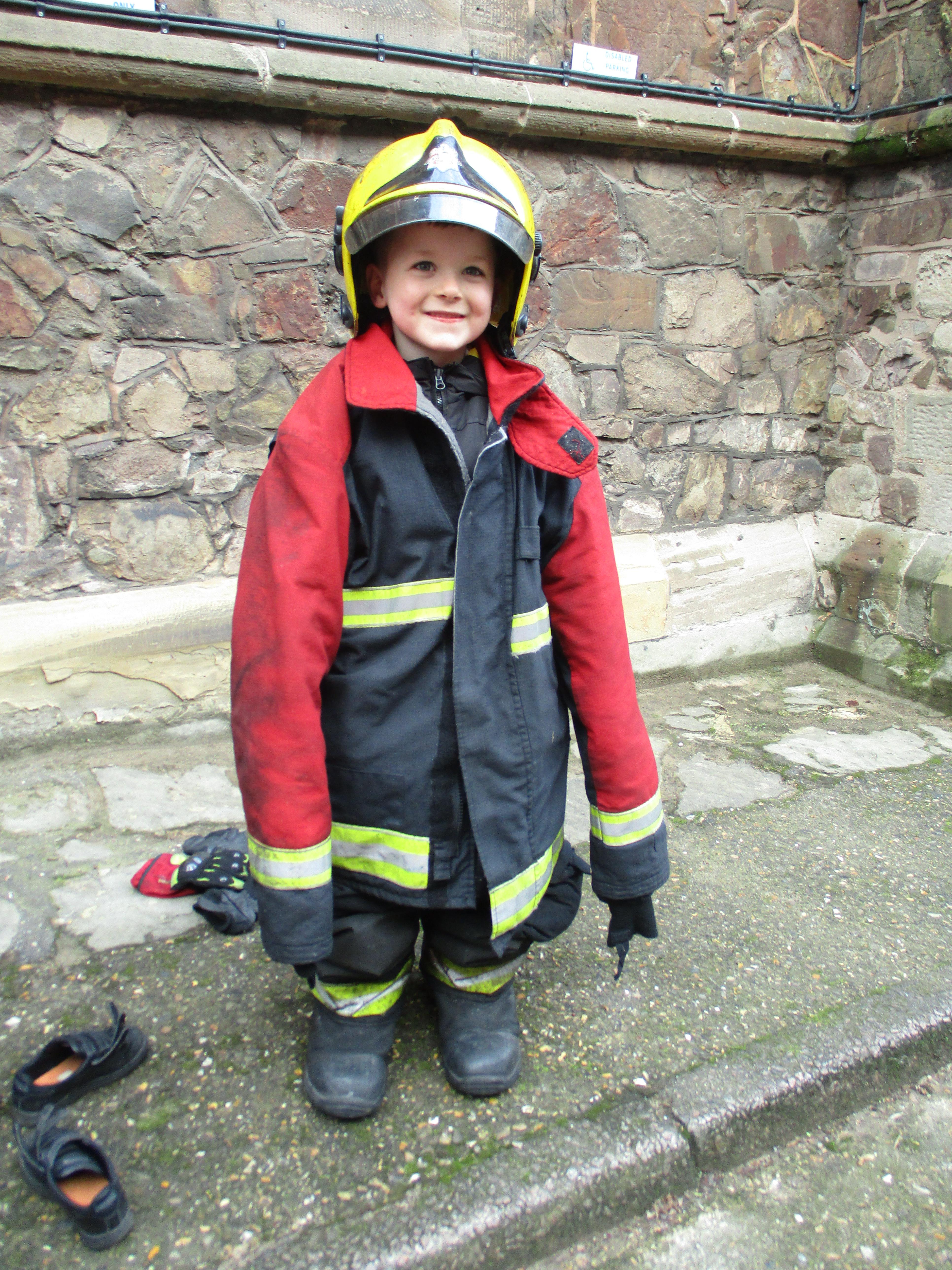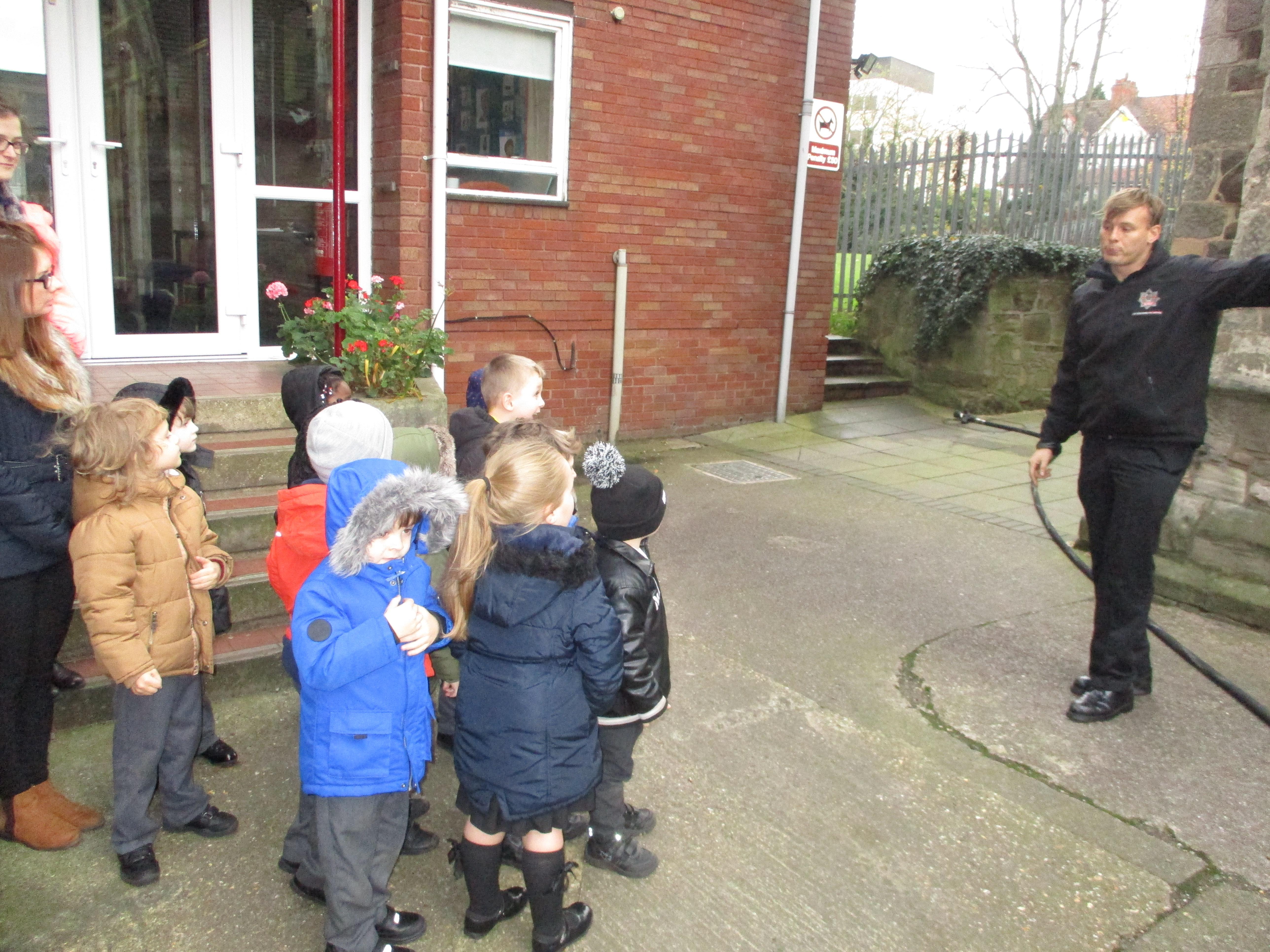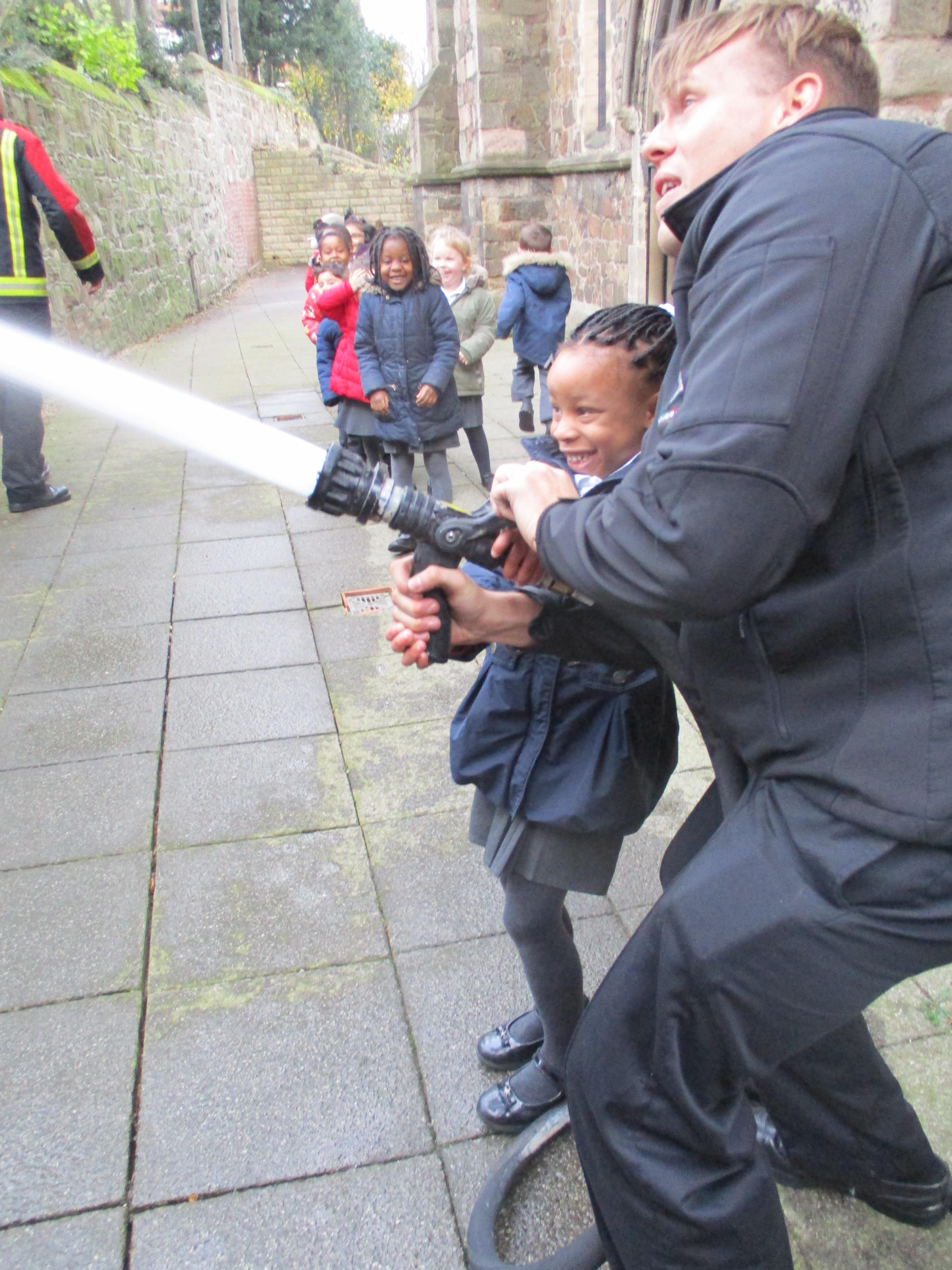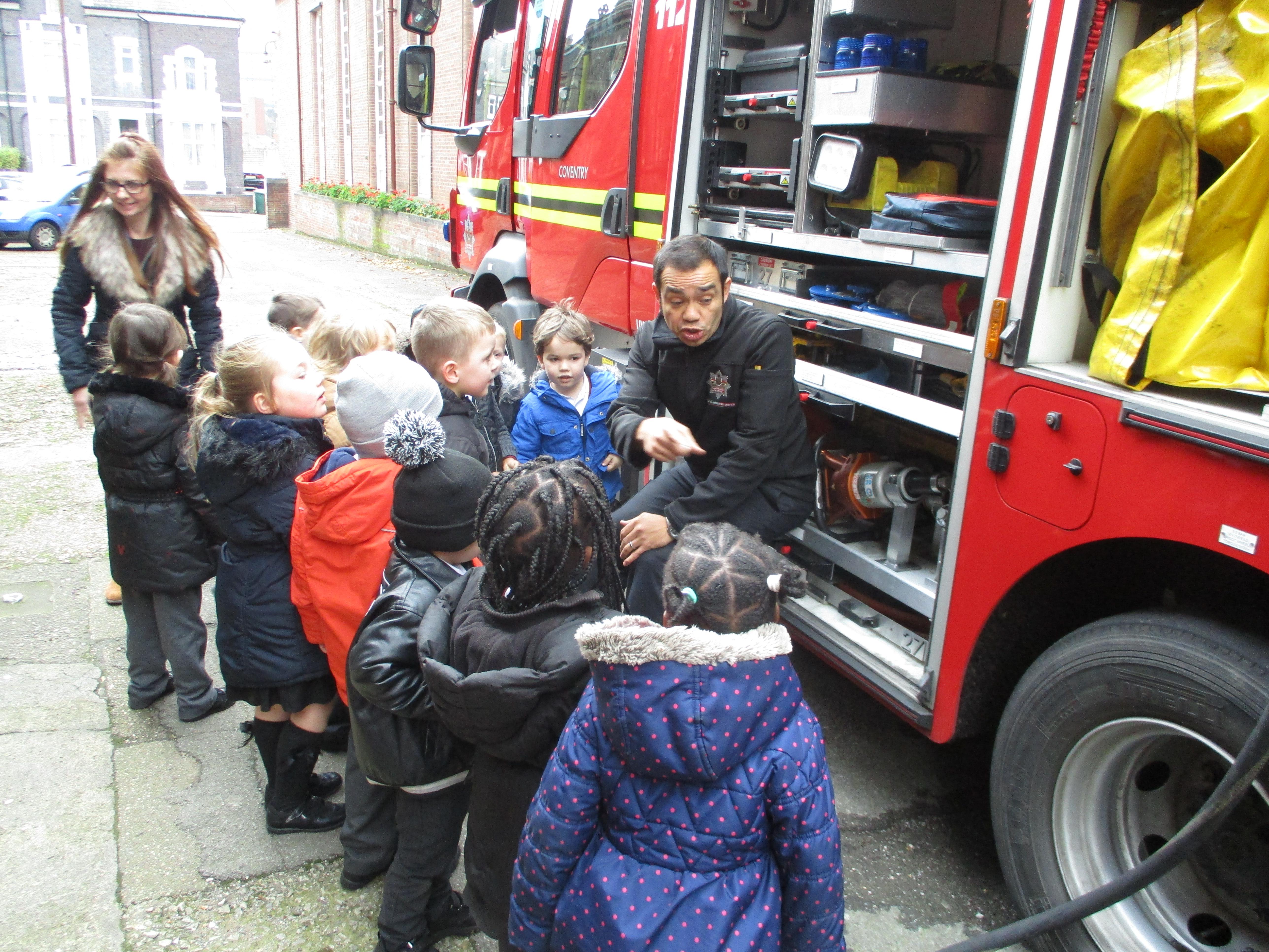 Reception had a very exciting morning when the firemen came to visit. They all had a go at using the firemen's hose, trying on the special fire fighter uniform and all had a turn at sitting in the fire engine with the blue flashing lights on!The firemen told the children all about their job and what they need to do if they ever needed to call the firemen.