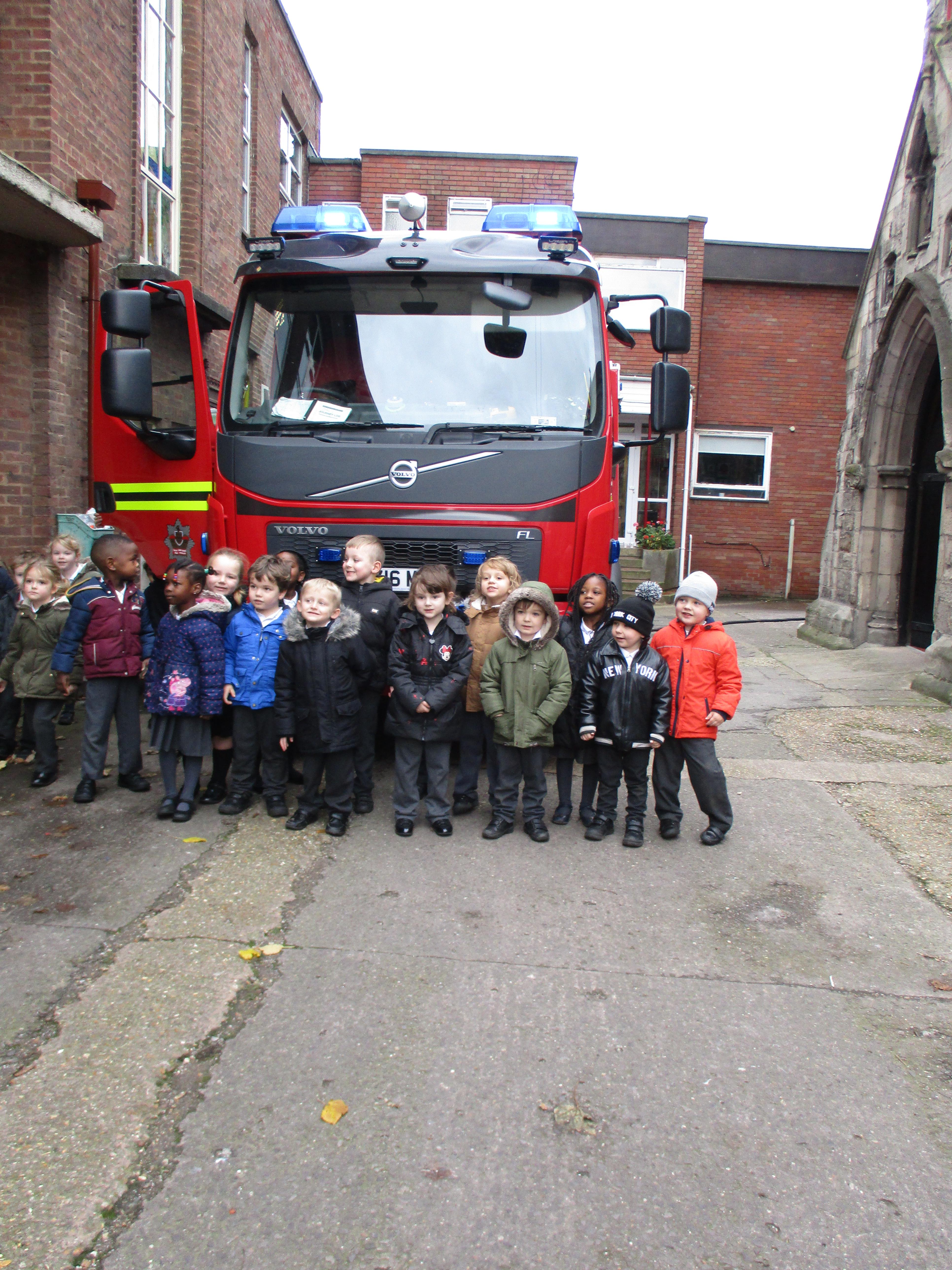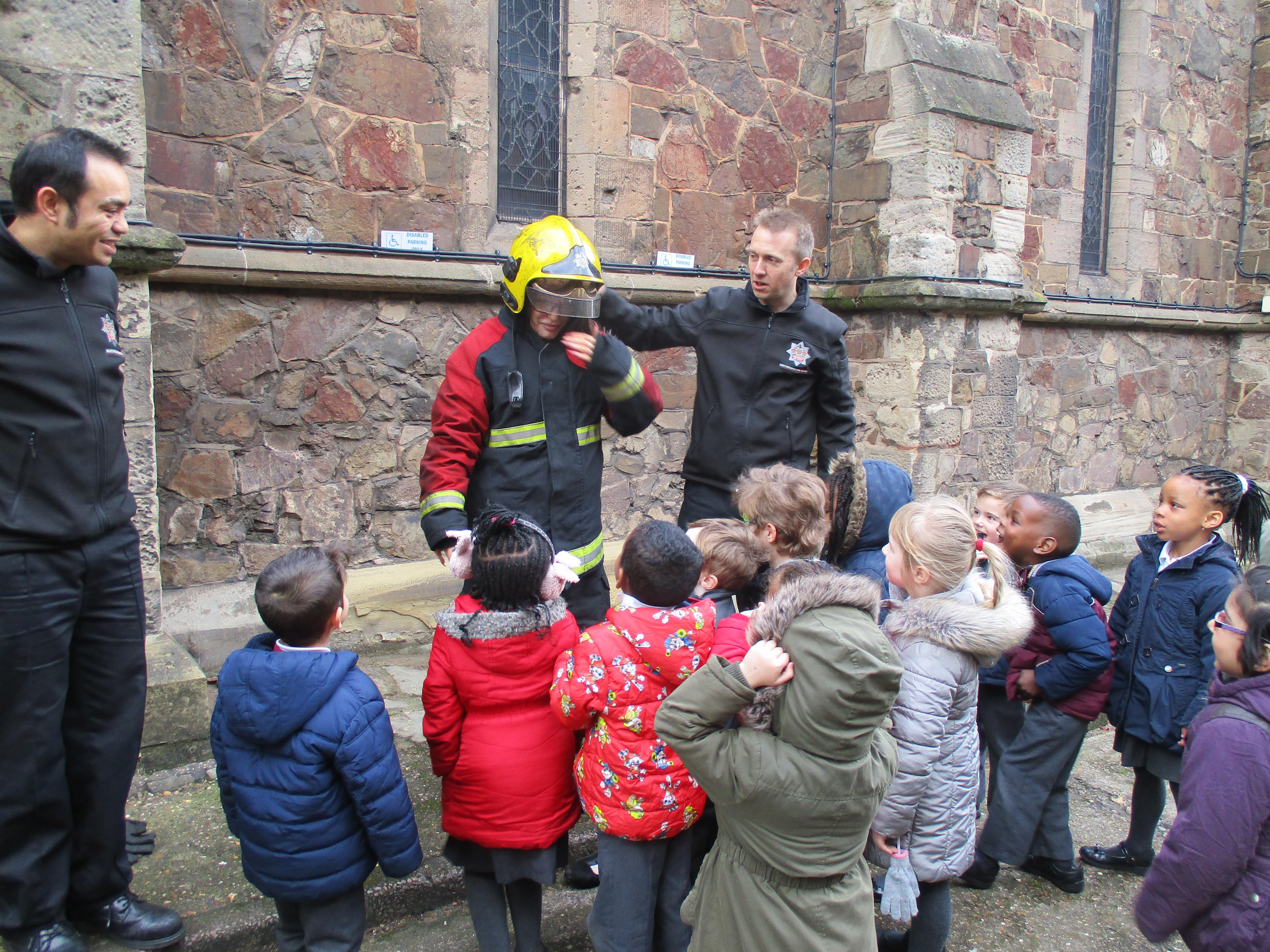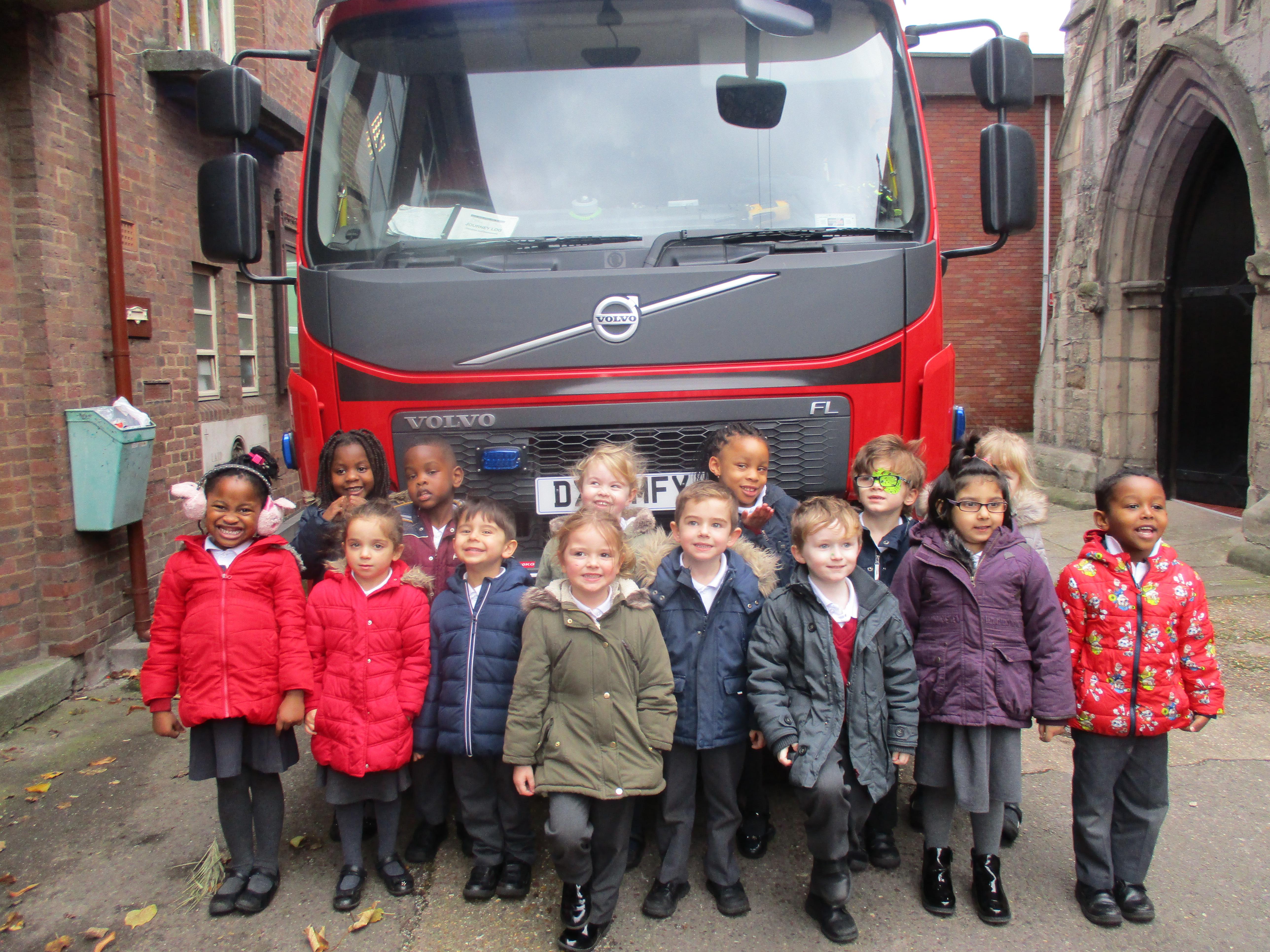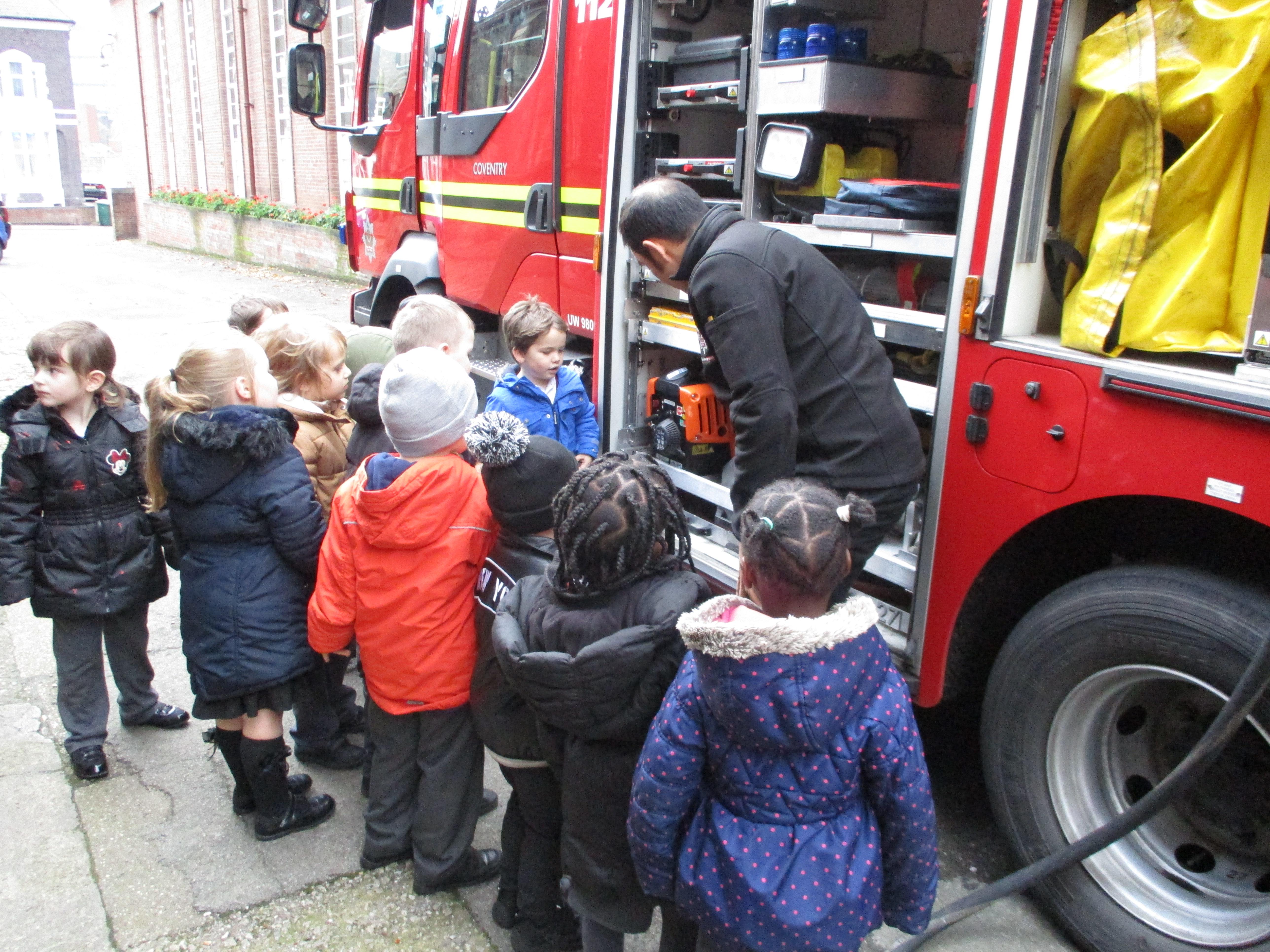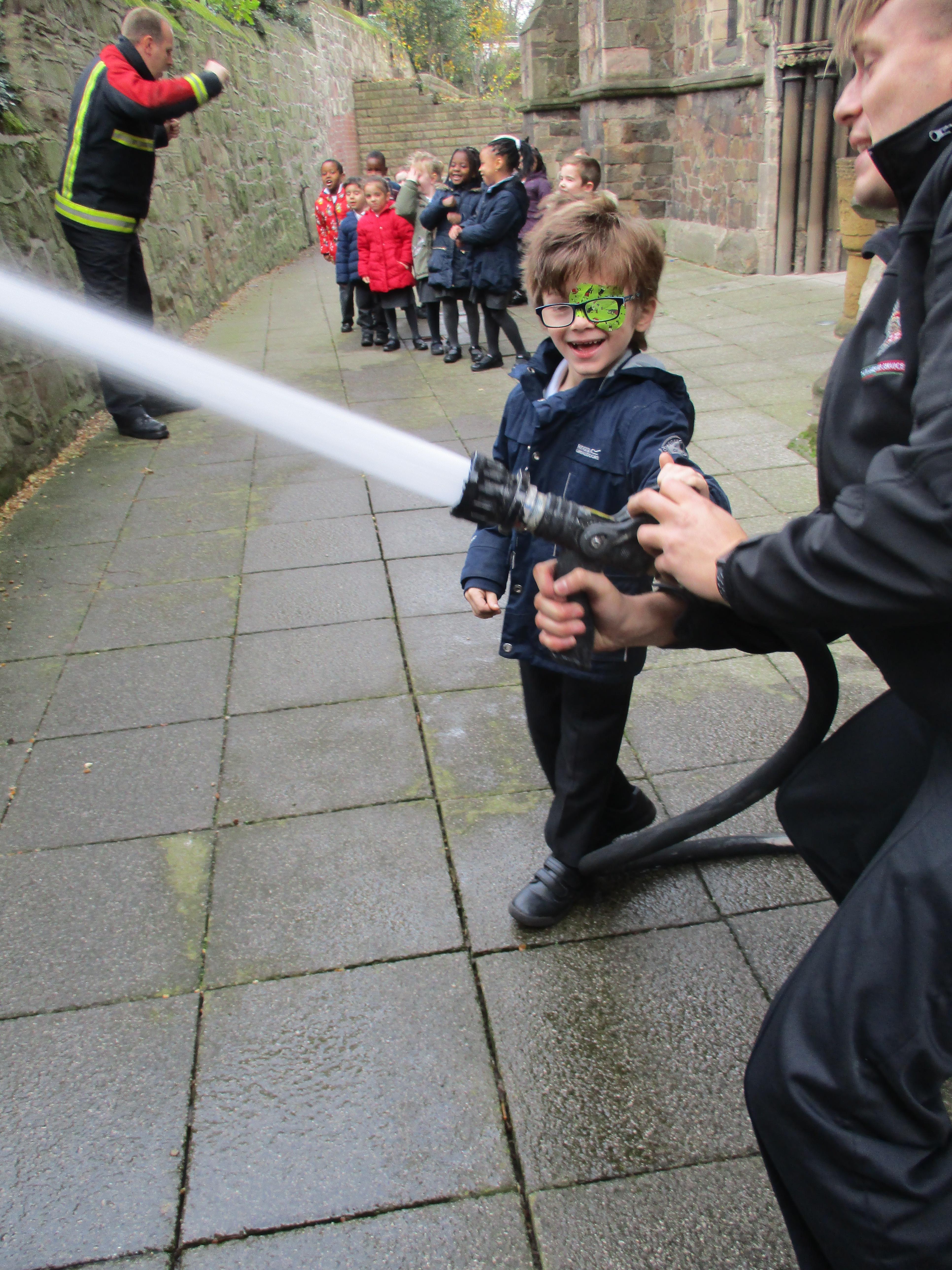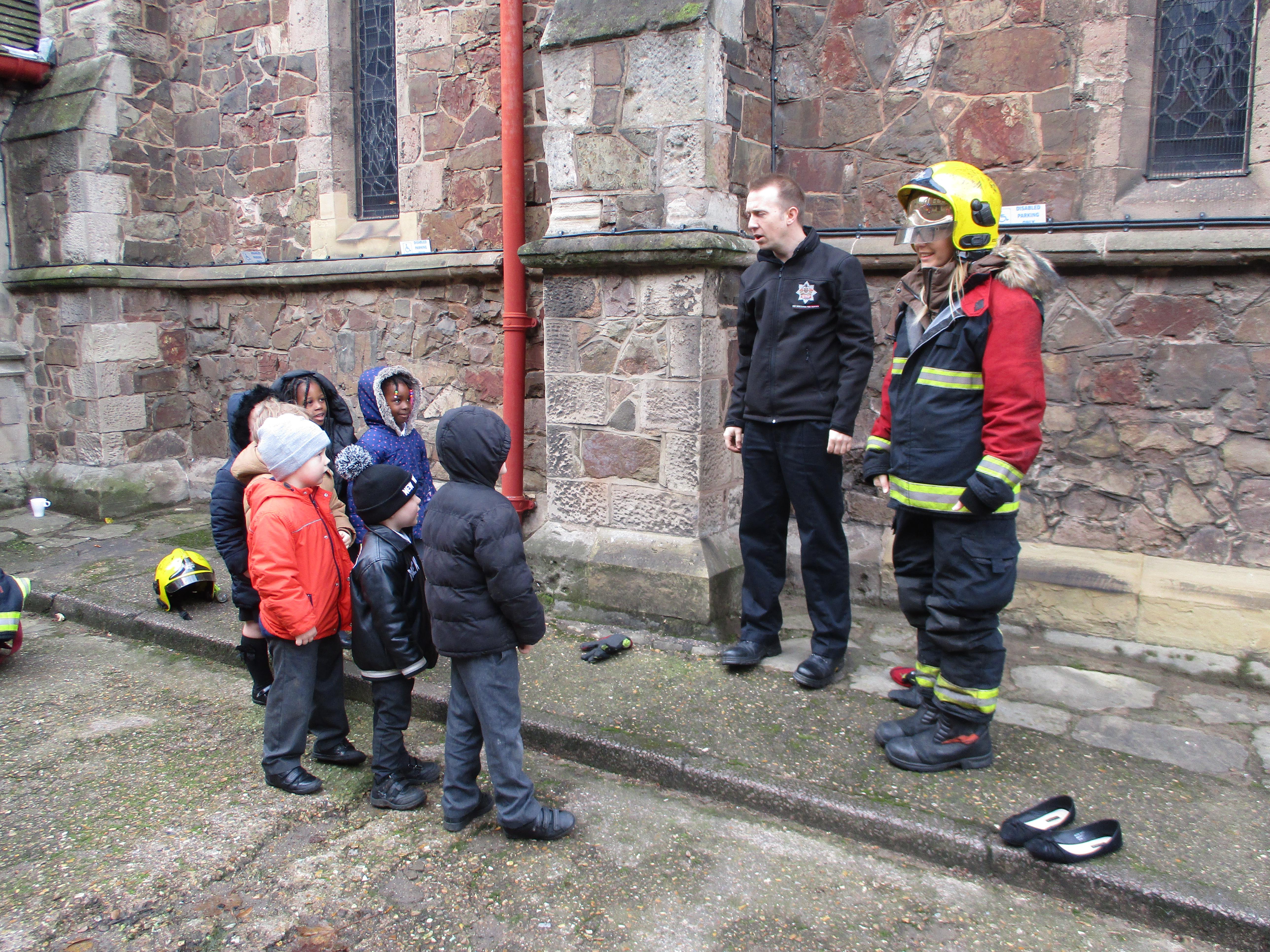 Reception had a very exciting morning when the firemen came to visit. They all had a go at using the firemen's hose, trying on the special fire fighter uniform and all had a turn at sitting in the fire engine with the blue flashing lights on!The firemen told the children all about their job and what they need to do if they ever needed to call the firemen.