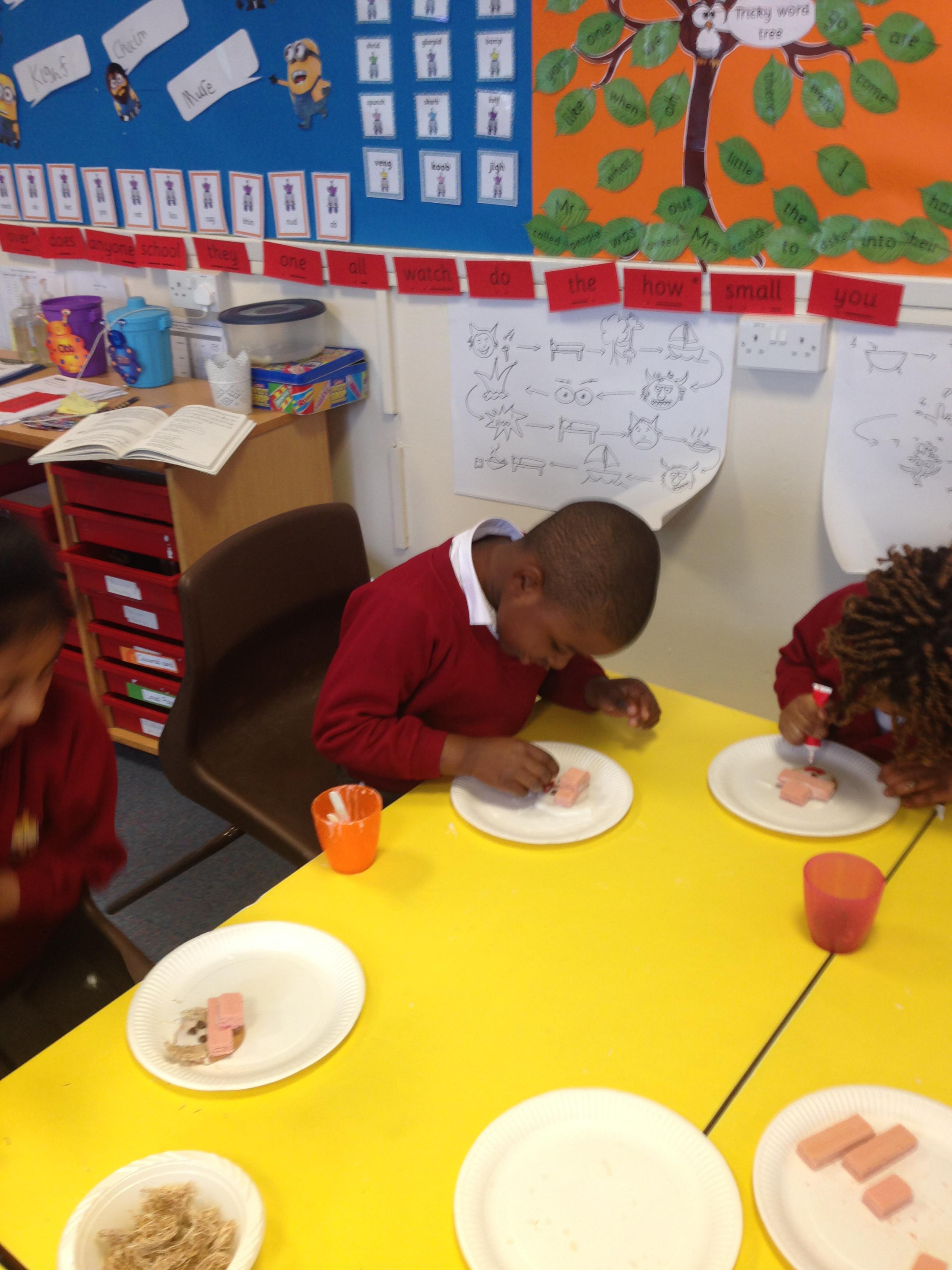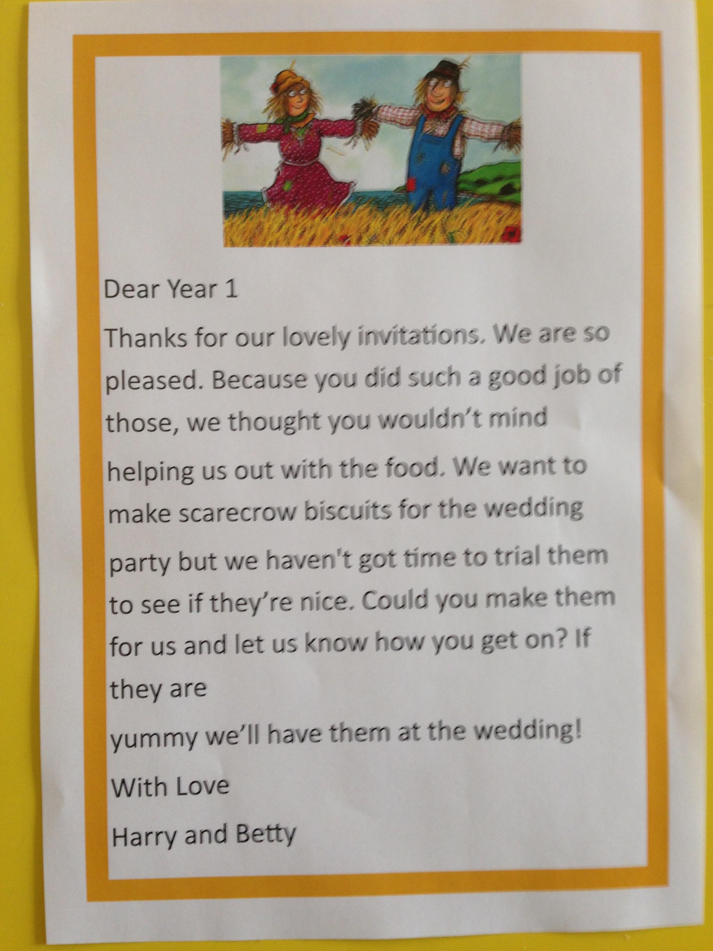 We have had a lovely morning this morning- Harry and Betty from The Scarecrows' Wedding had written us a letter asking for our help in making Scarecrow biscuits for their wedding. The children had to carefully follow the instructions to make them- they were yummy! Miss Doran will be letting Harry and Betty know they were a success!