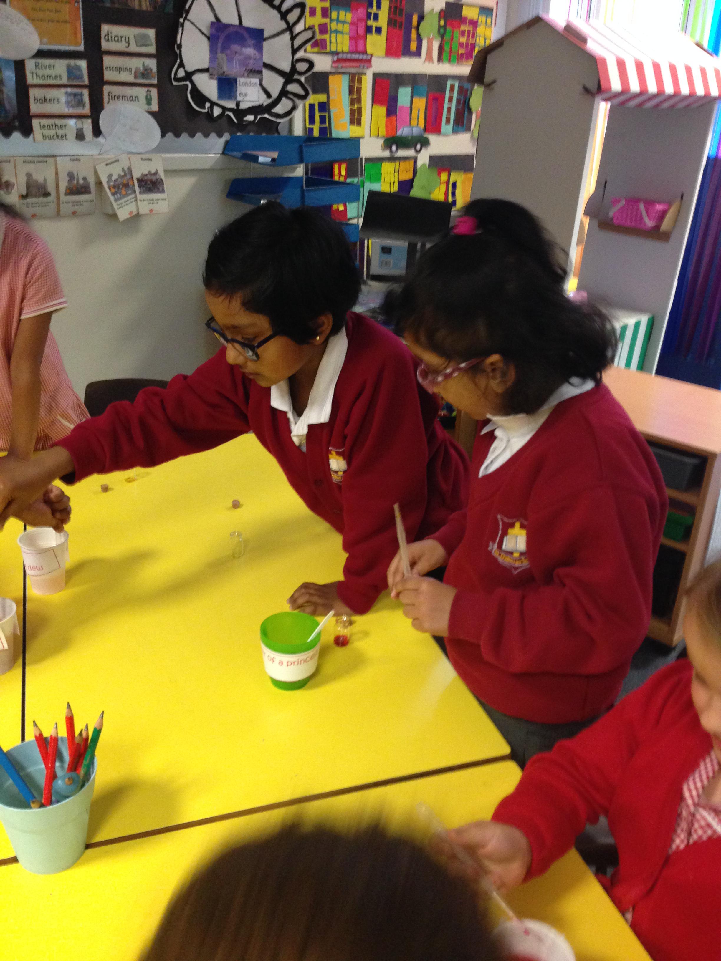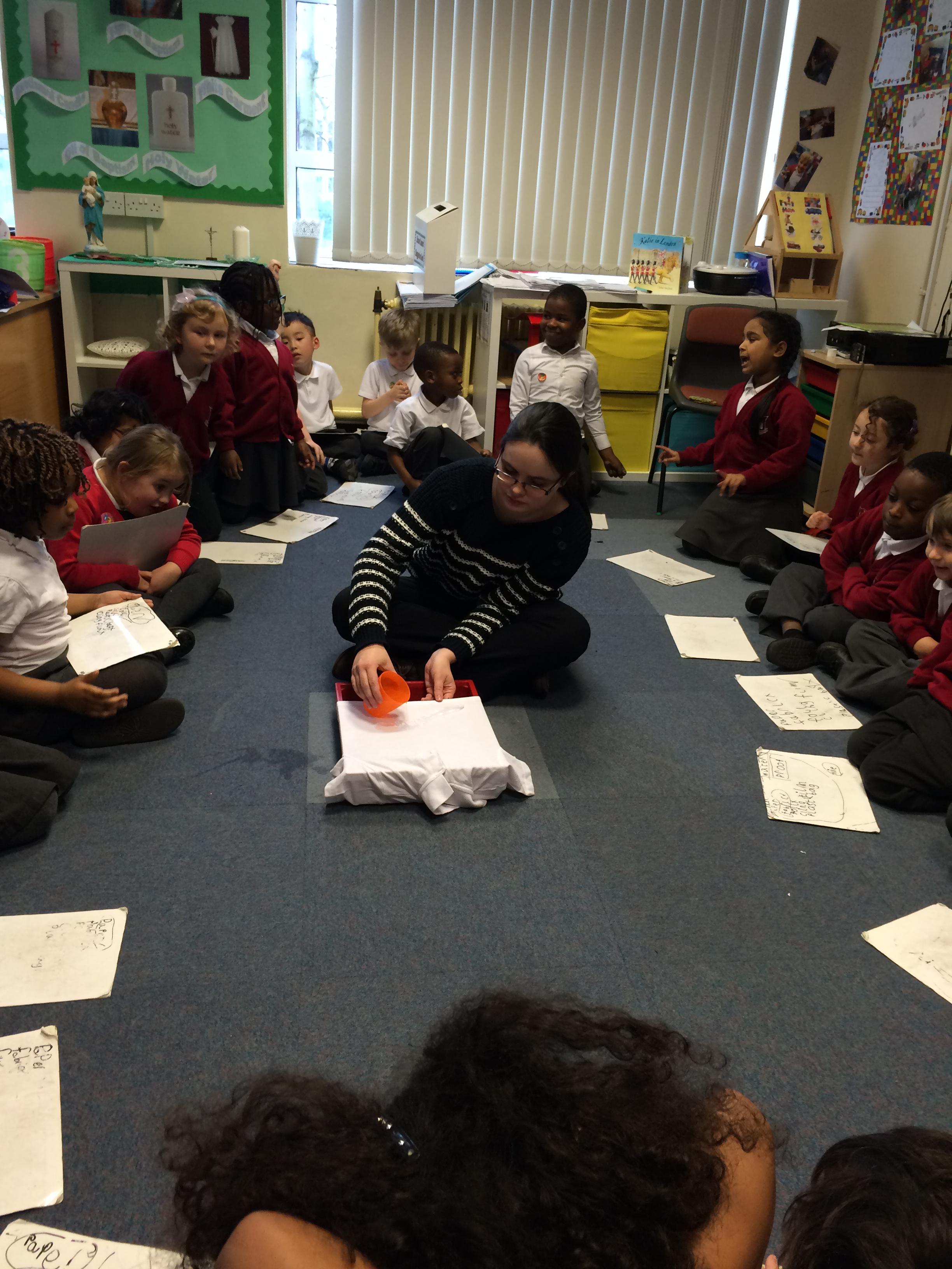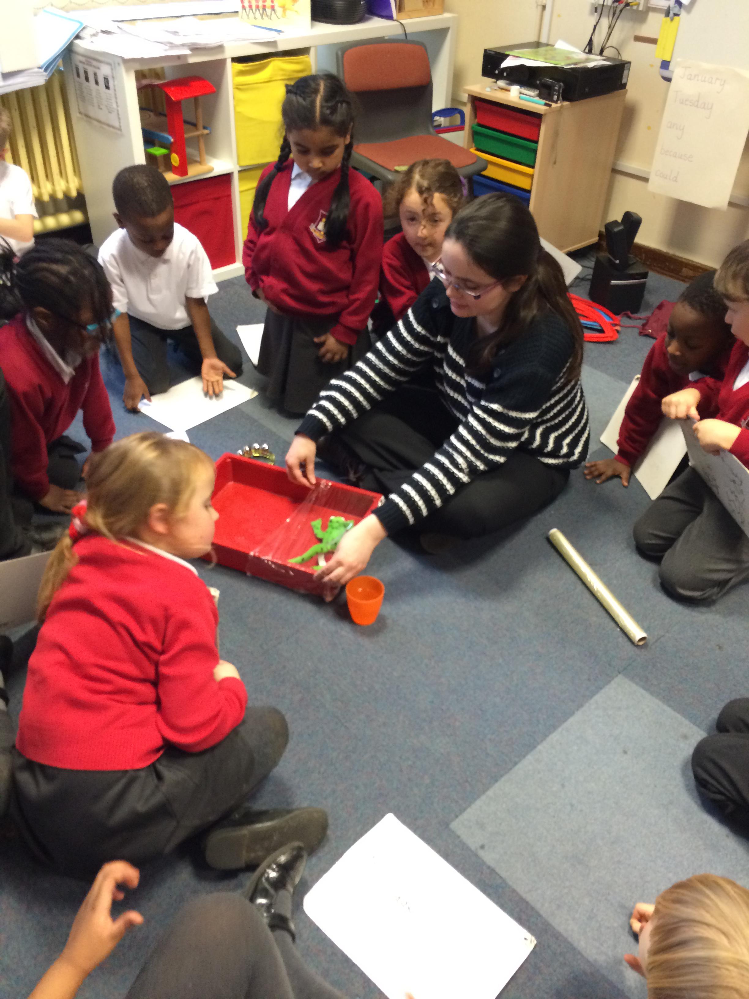 The children investigated which material would be best to make an umbrella to keep Fred Frog dry,