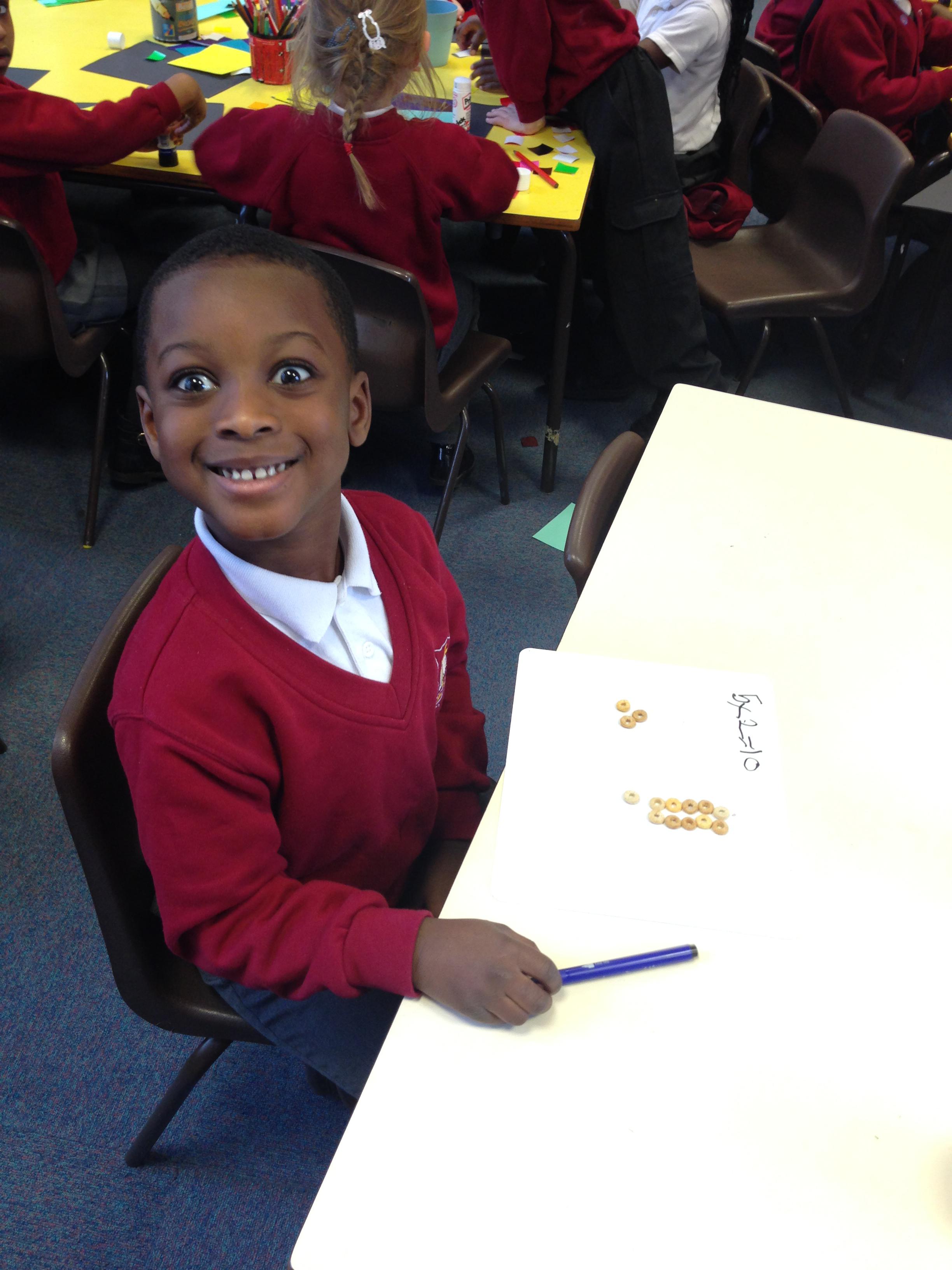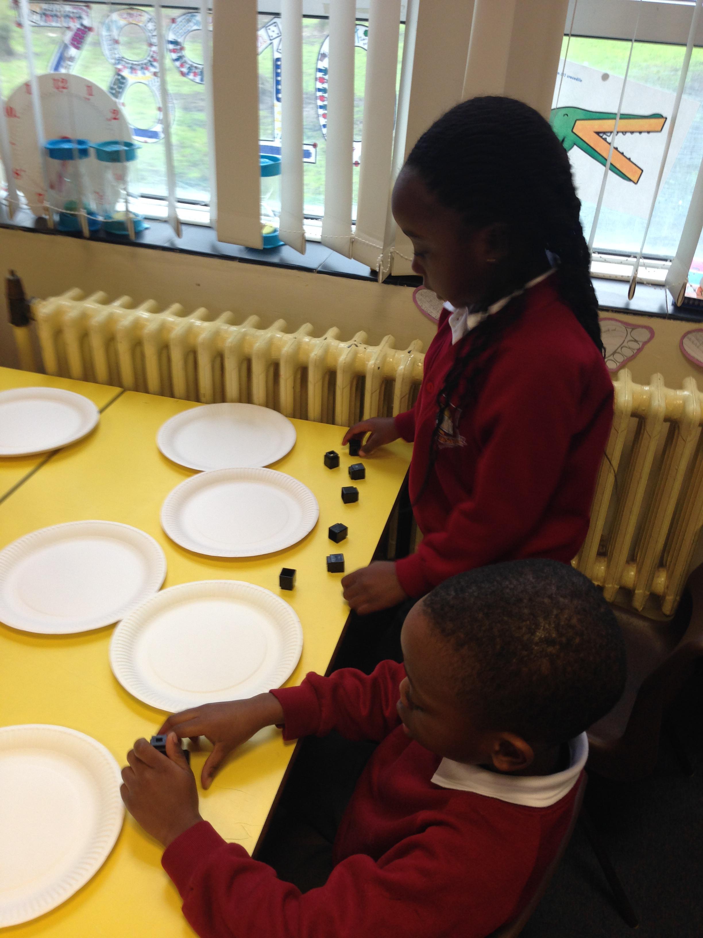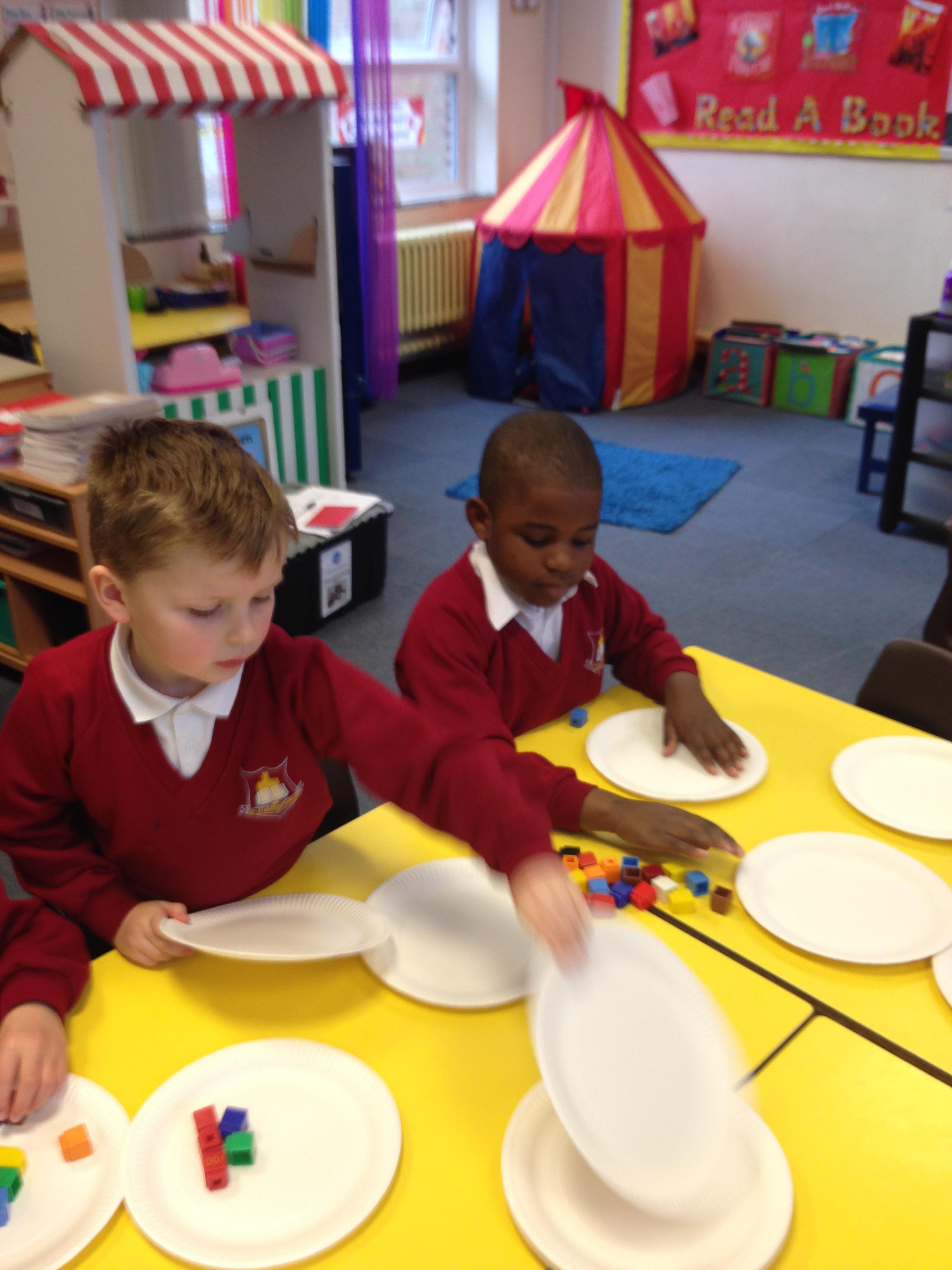 In maths this week we have been learning about multiplication and division. We looked at groups of 2s, 5s and 10s and we also learnt about arrays to represent multiplication calculations. Some children made pictures for our Array City display (photos to follow) and some children made arrays using Cheerios....yes they did get to eat them! We looked at sharing for 2 days. The children had experience of sharing cubes between plates to see what happens when we share.