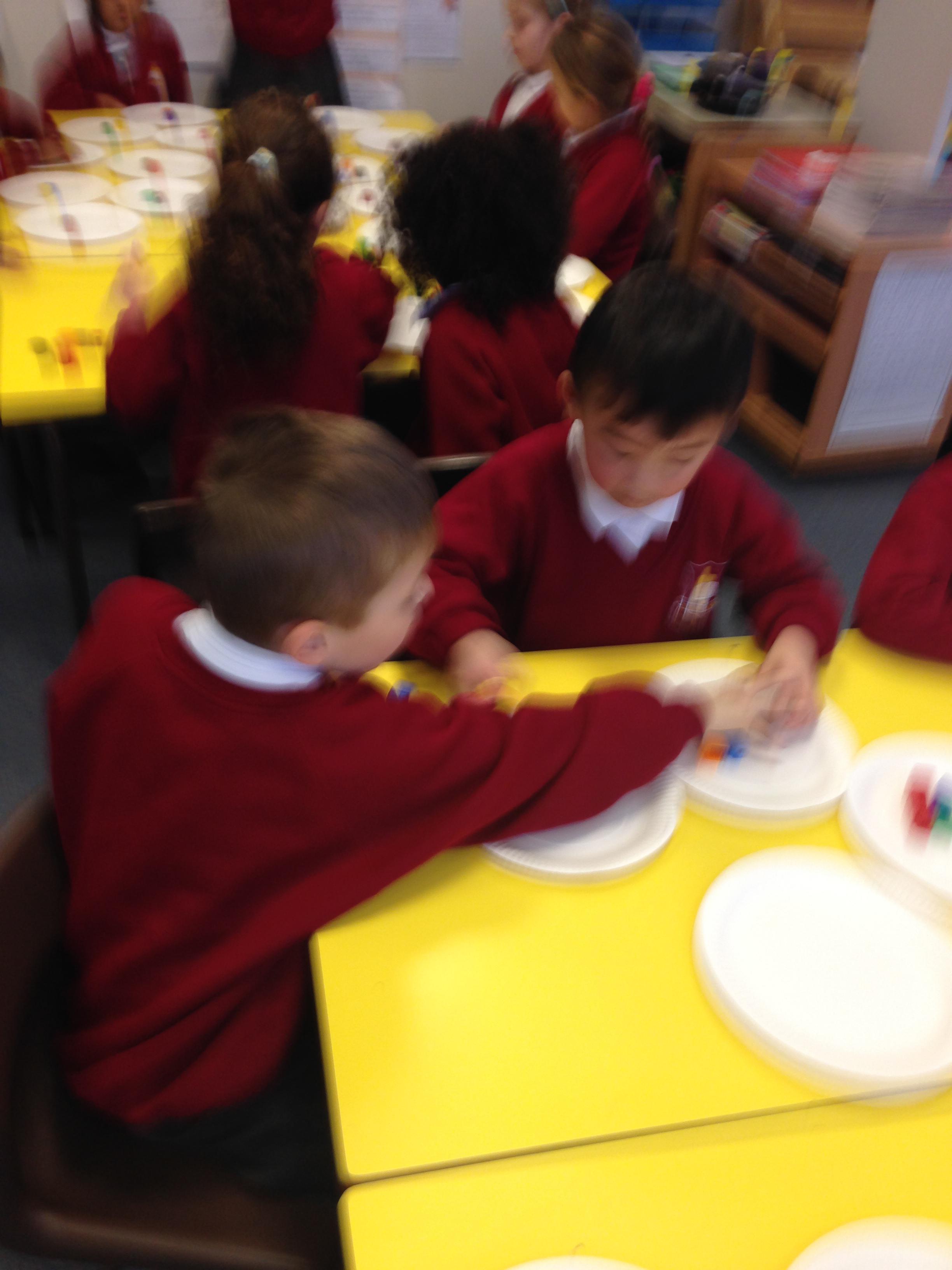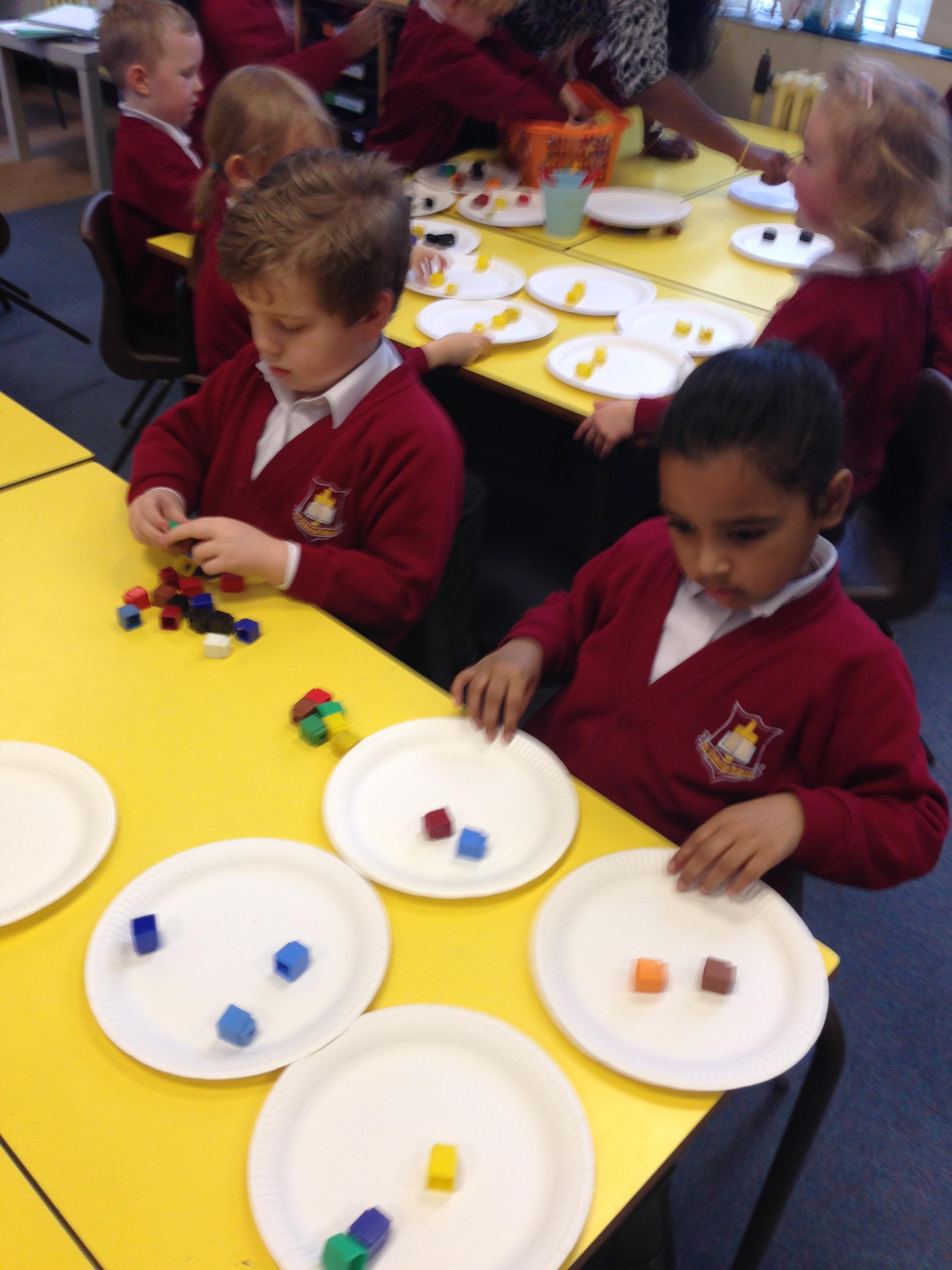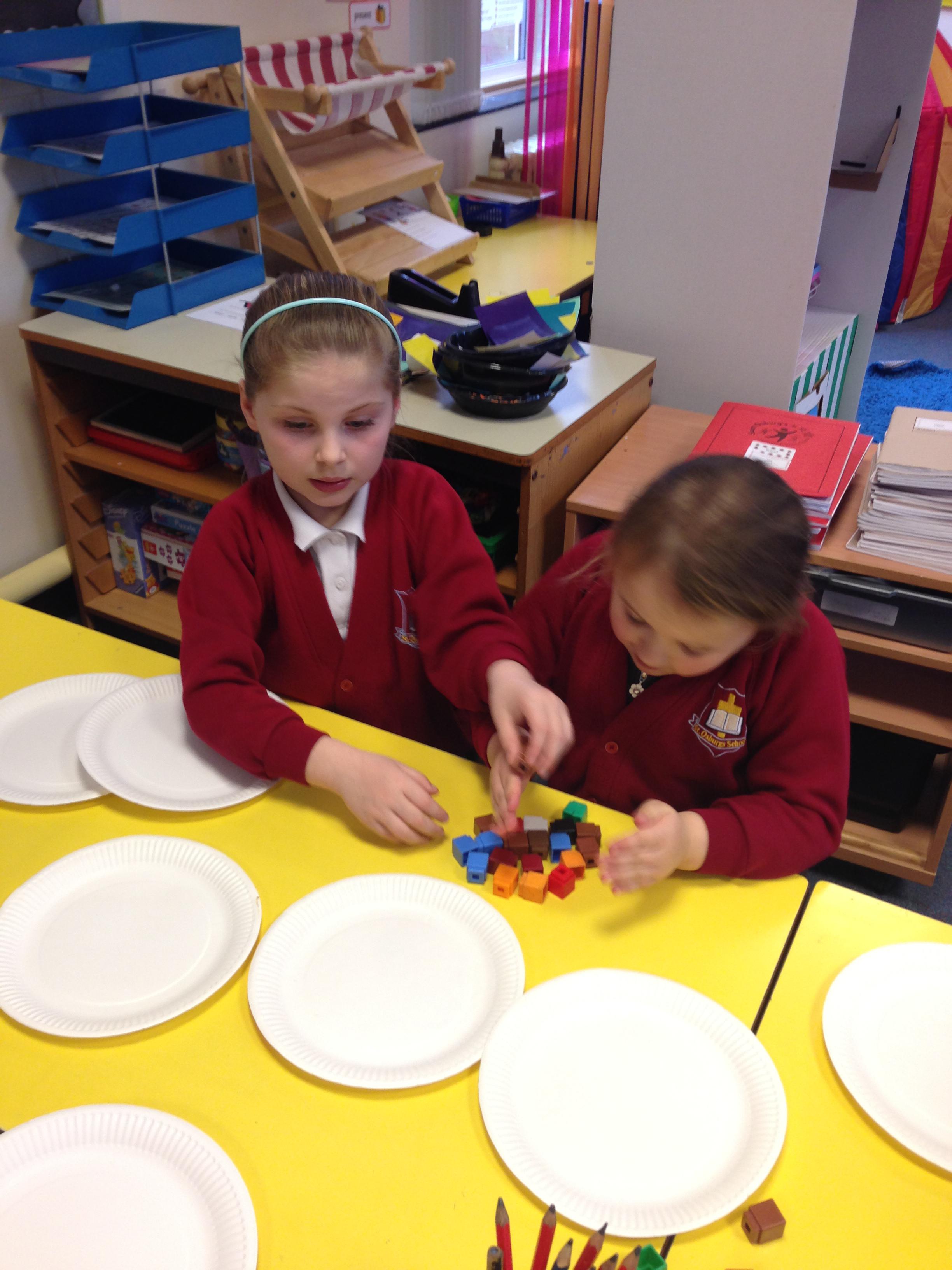 In maths this week we have been learning about multiplication and division. We looked at groups of 2s, 5s and 10s and we also learnt about arrays to represent multiplication calculations. Some children made pictures for our Array City display (photos to follow) and some children made arrays using Cheerios....yes they did get to eat them! We looked at sharing for 2 days. The children had experience of sharing cubes between plates to see what happens when we share.