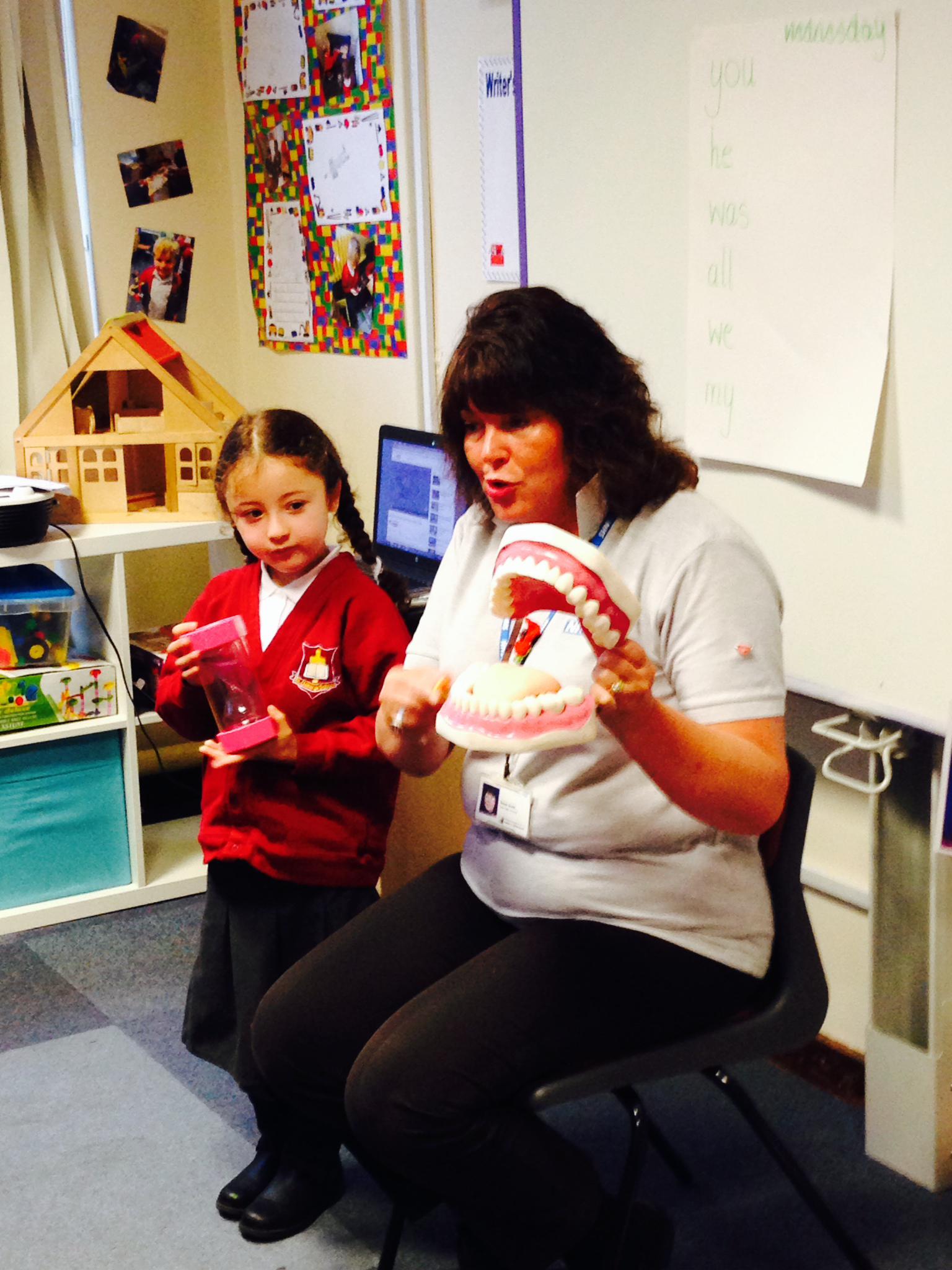 Today we had a visit from the school nurse which was very informative. She advised the children on how often to brush their teeth (once in the morning and once before bed), how to brush their teeth, gums and tongue as well as informing the children about sugary snacks and drinks. A Fruit Shoot has 6 teaspoons of sugar in, a box of raisins has 5 teaspoons of sugar and a large bag of Haribo has 40 teaspoons of sugar in! Treats are ok as long as they are in moderation and eaten with a meal.