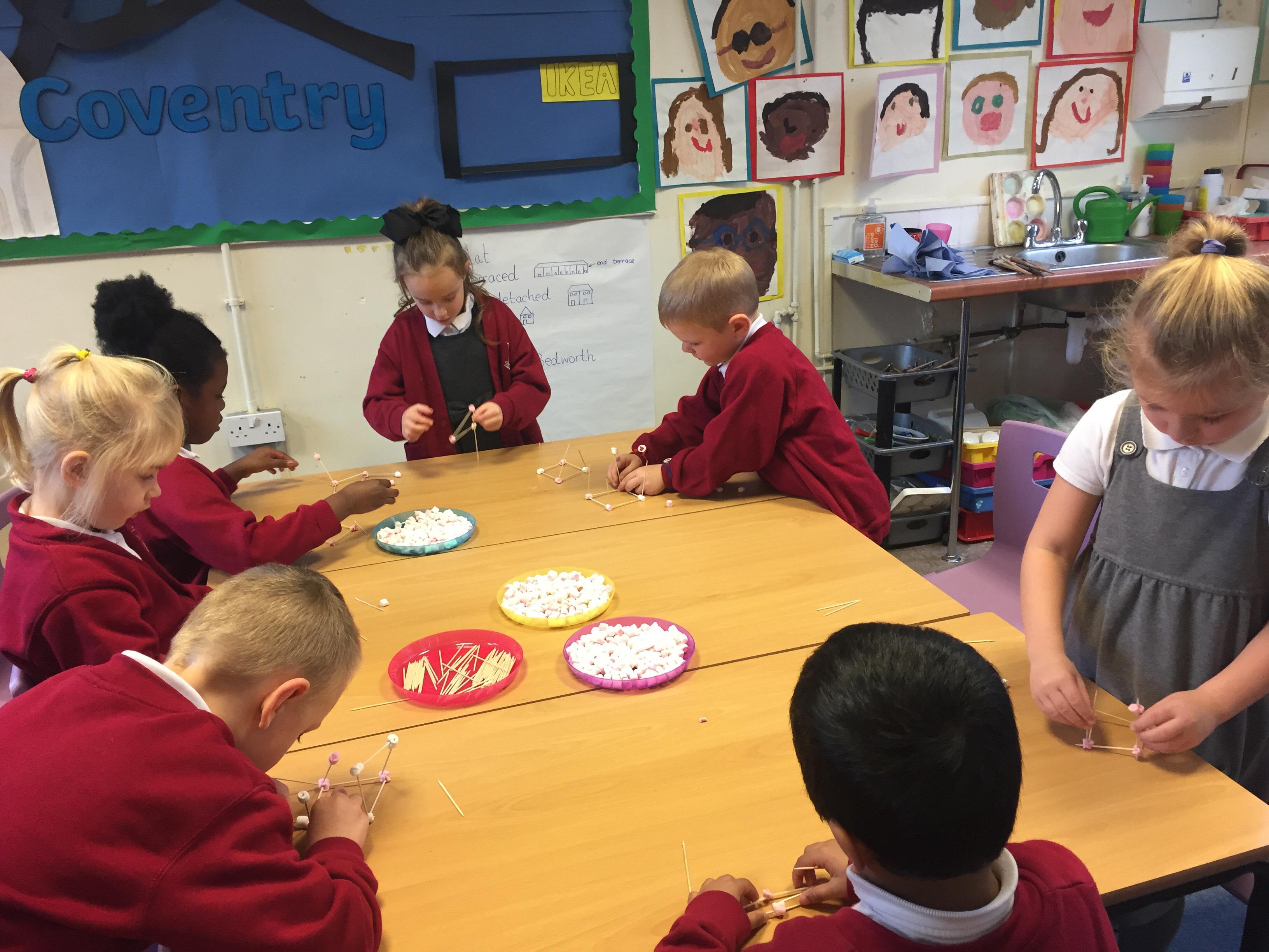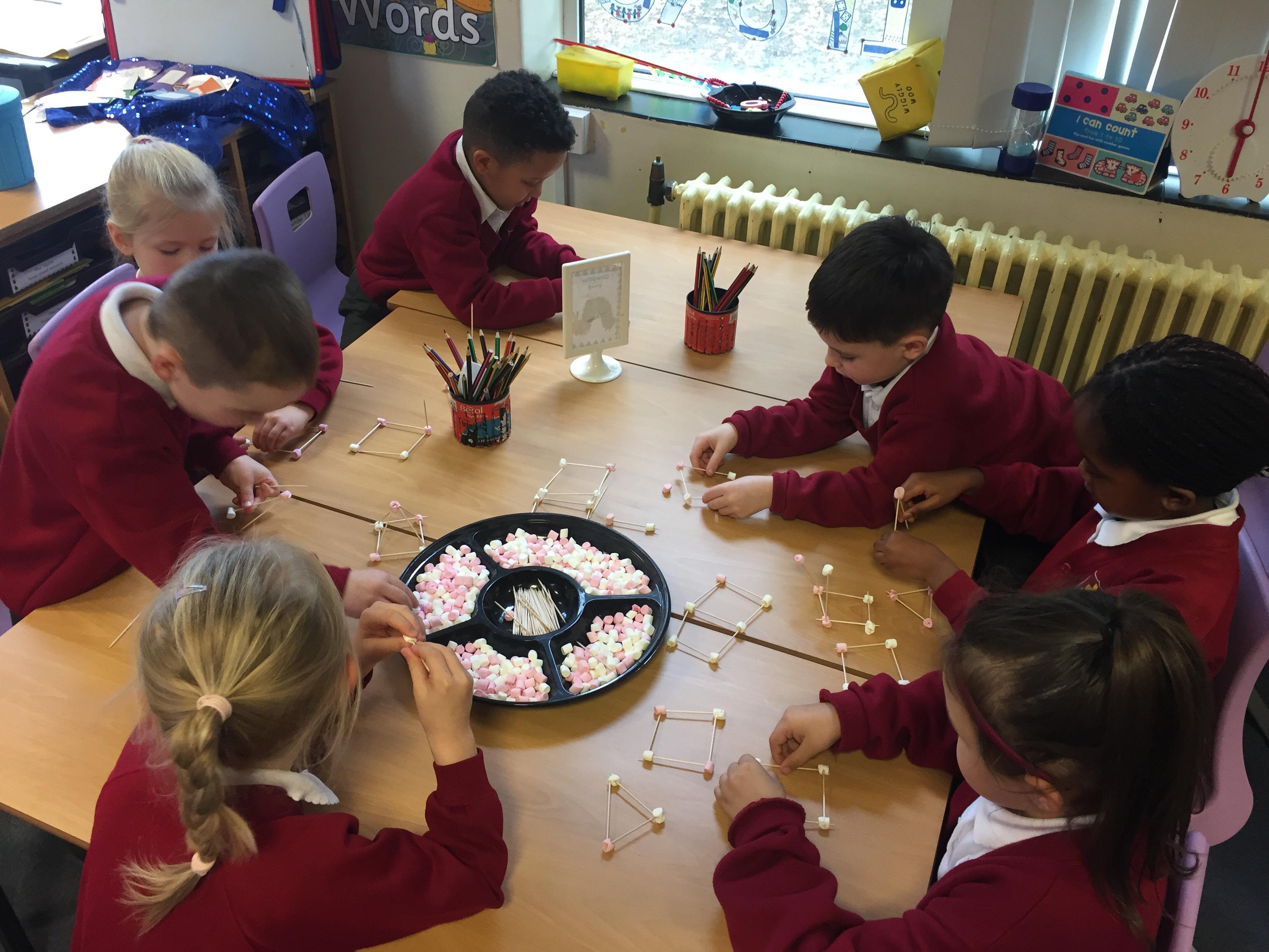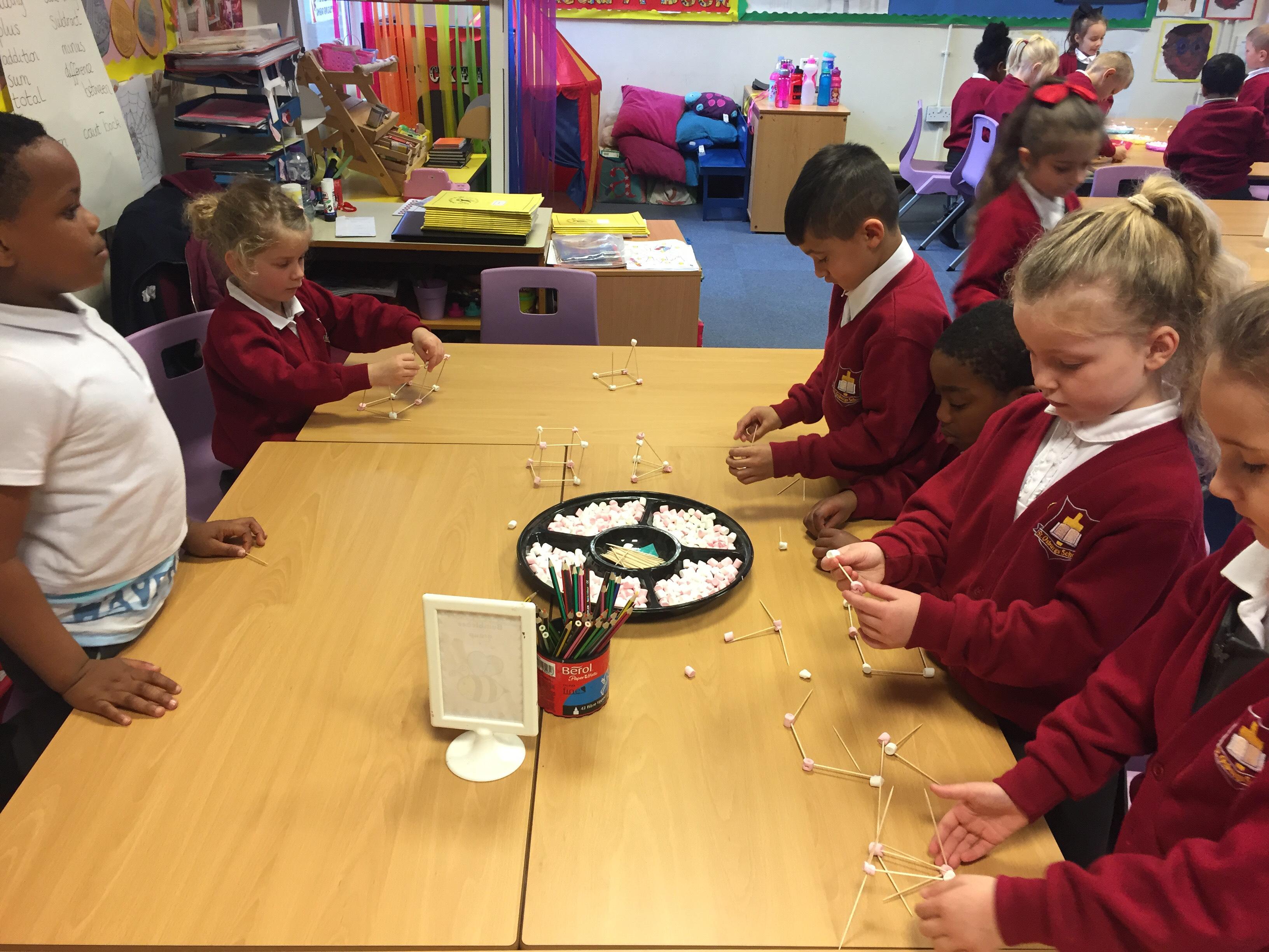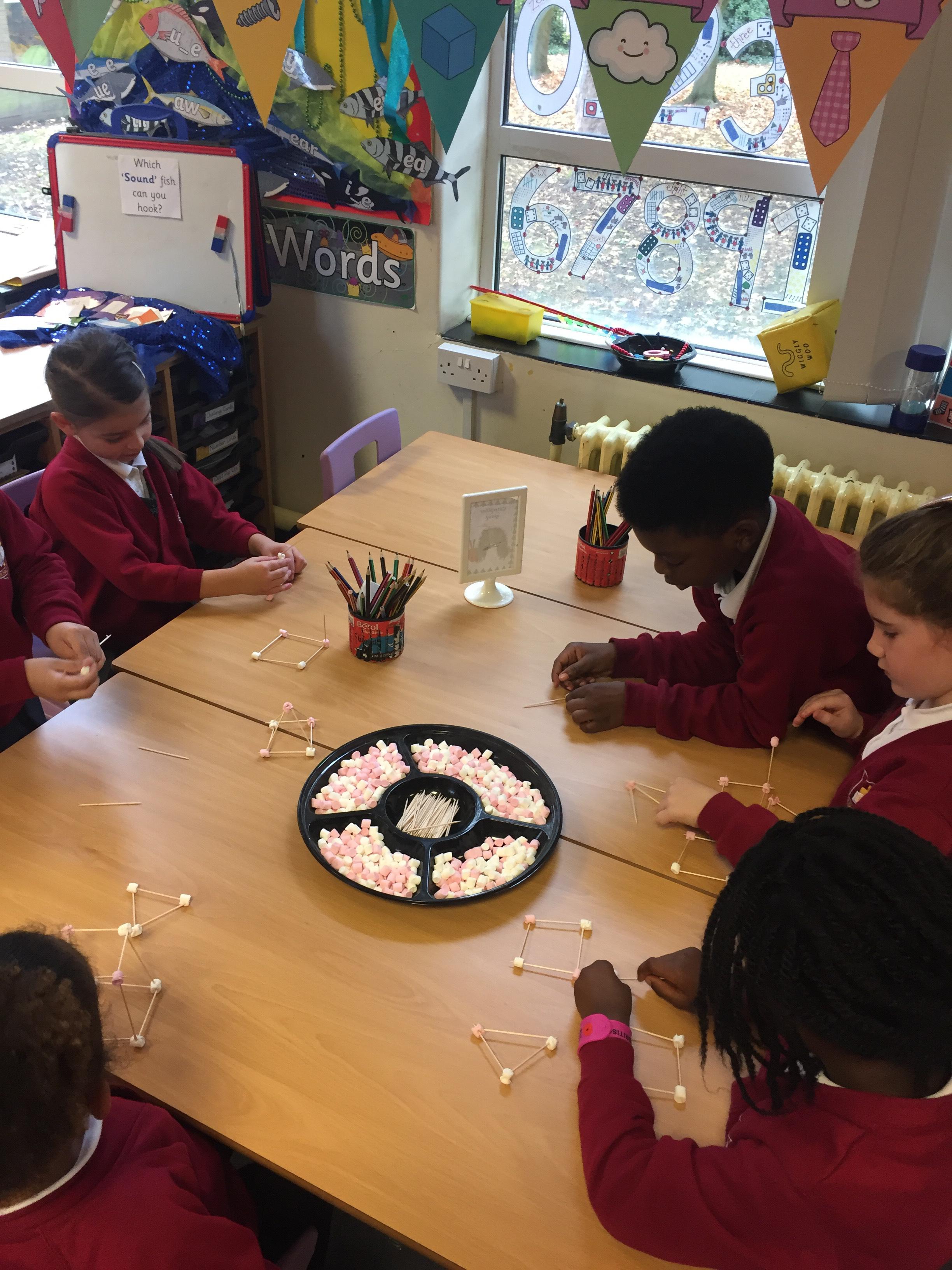 In maths we have been learning about 3D shapes. We even got to make some using cocktail sticks and marshmallows!