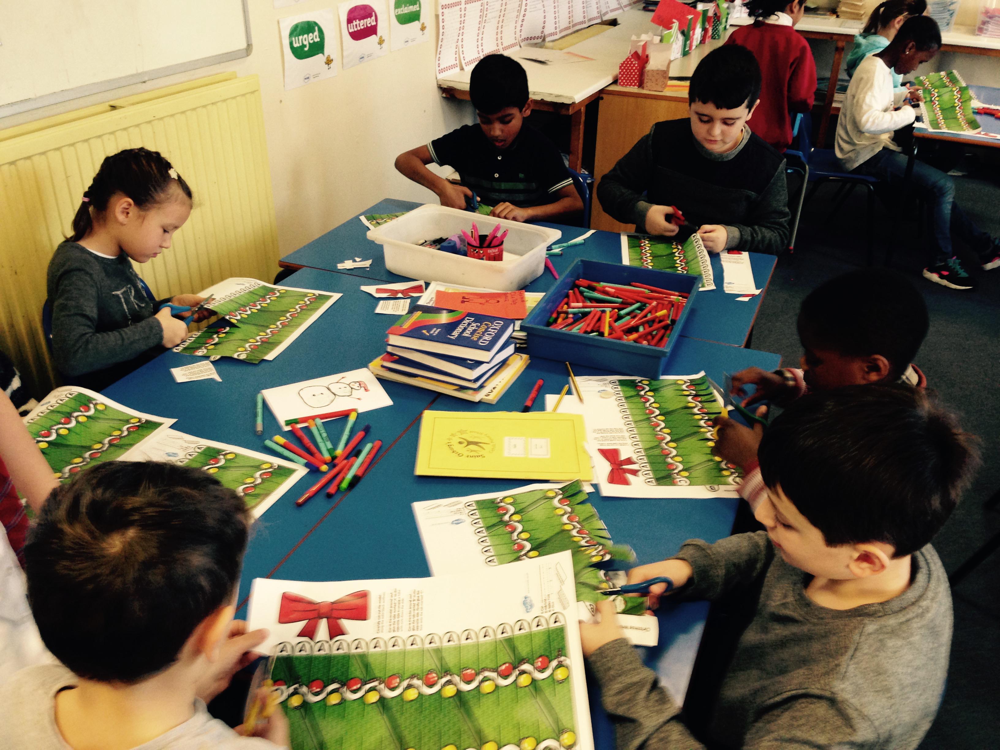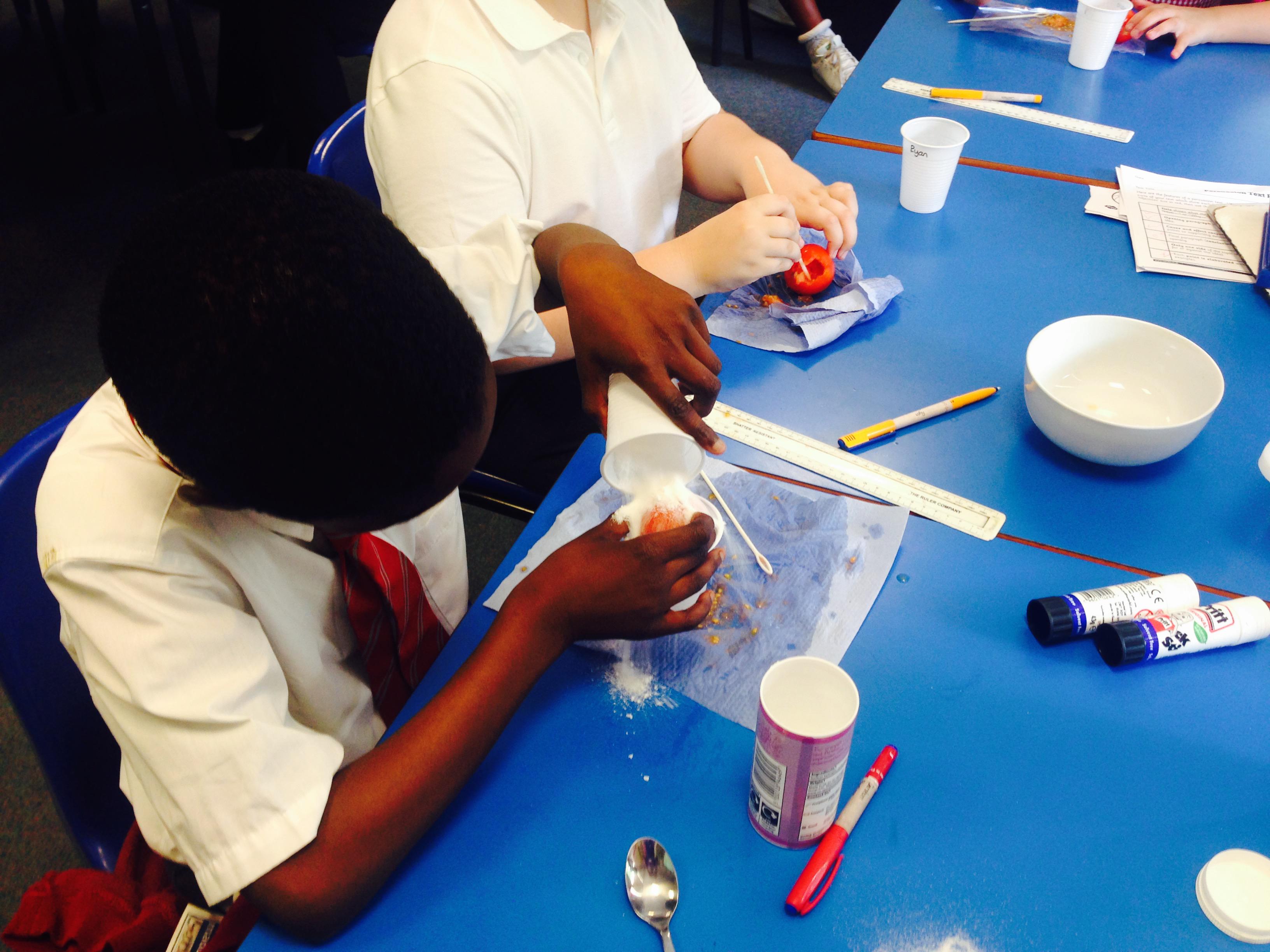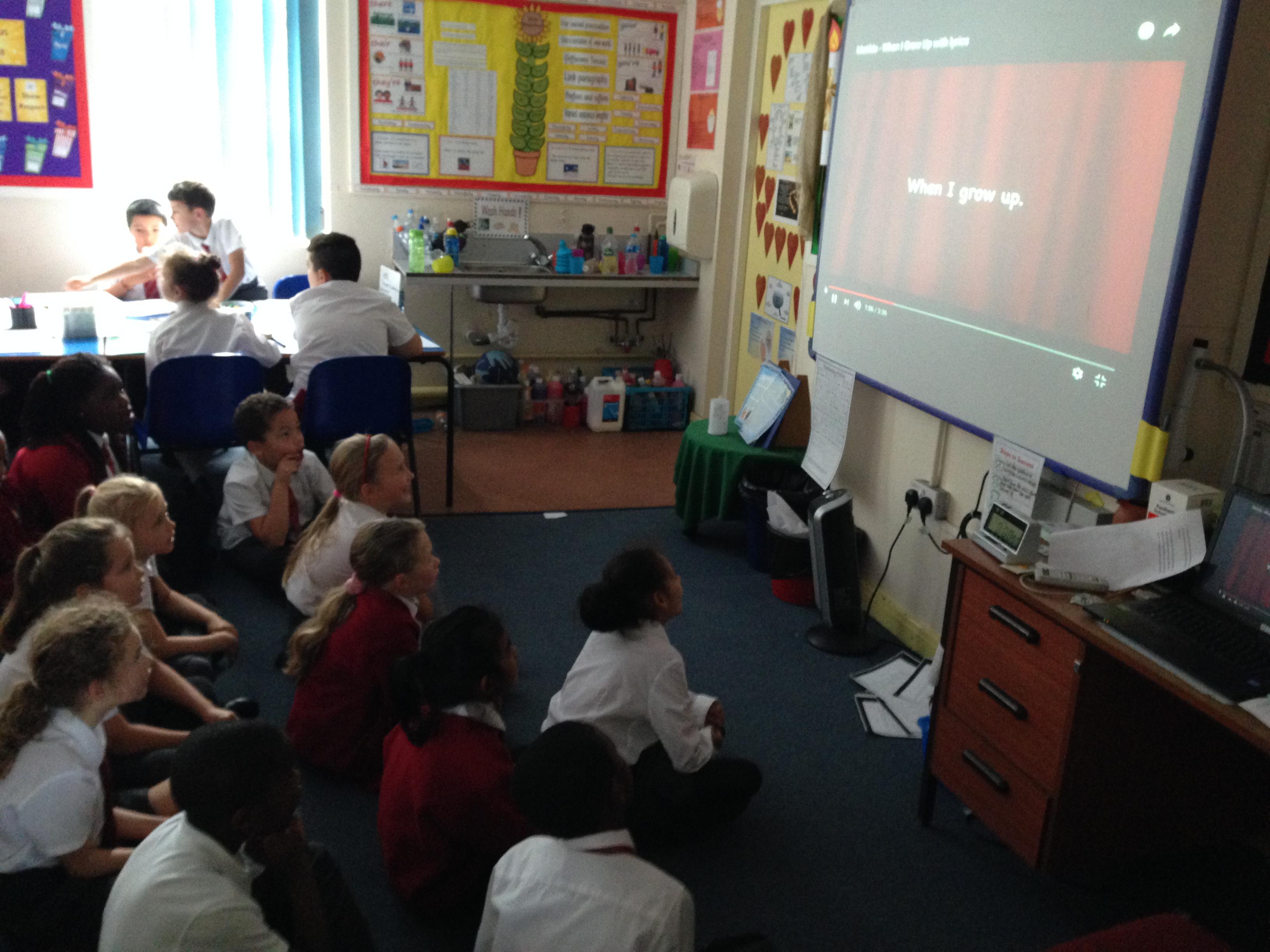 Children worked in pairs to prepare and perform a news report about an alien invasion.