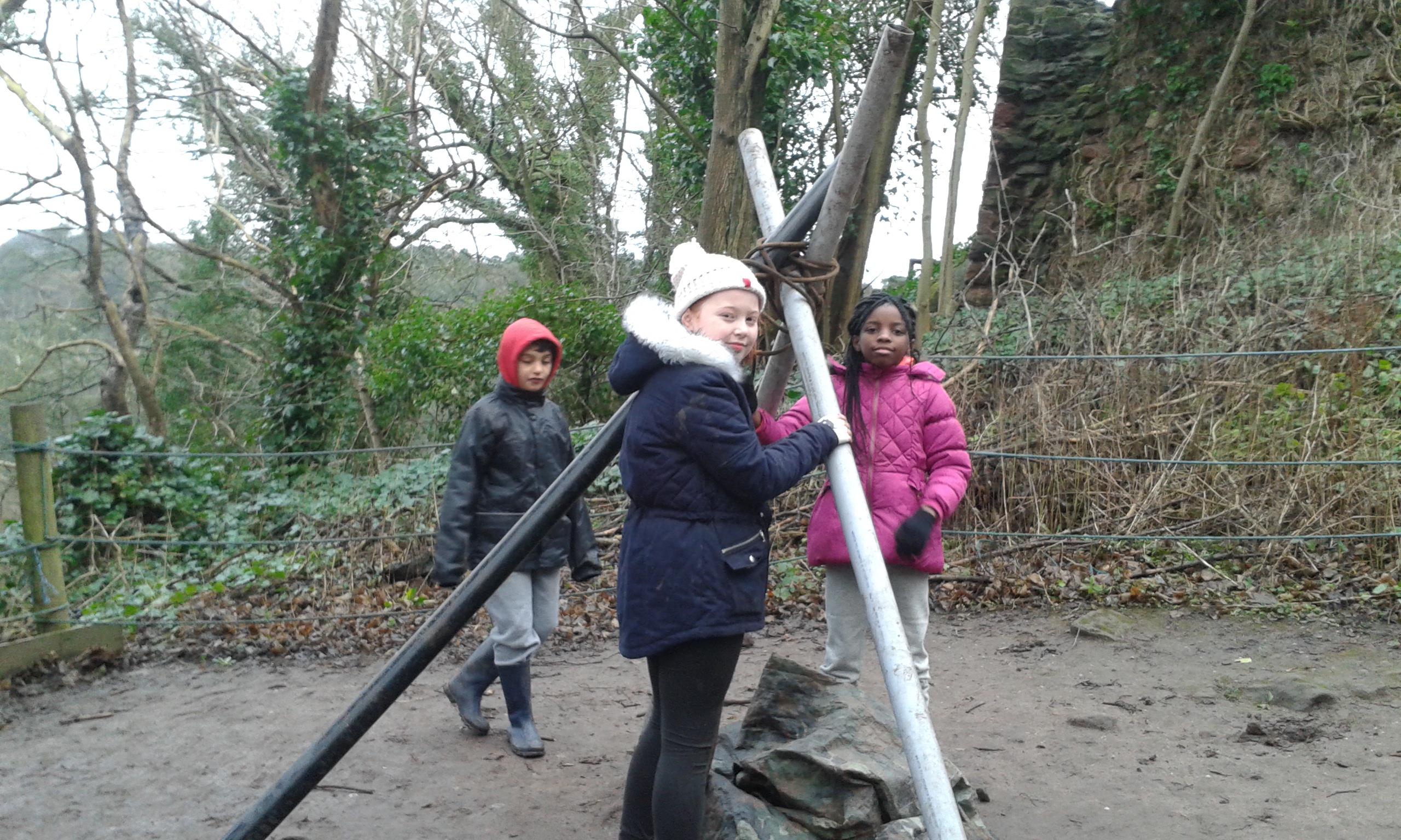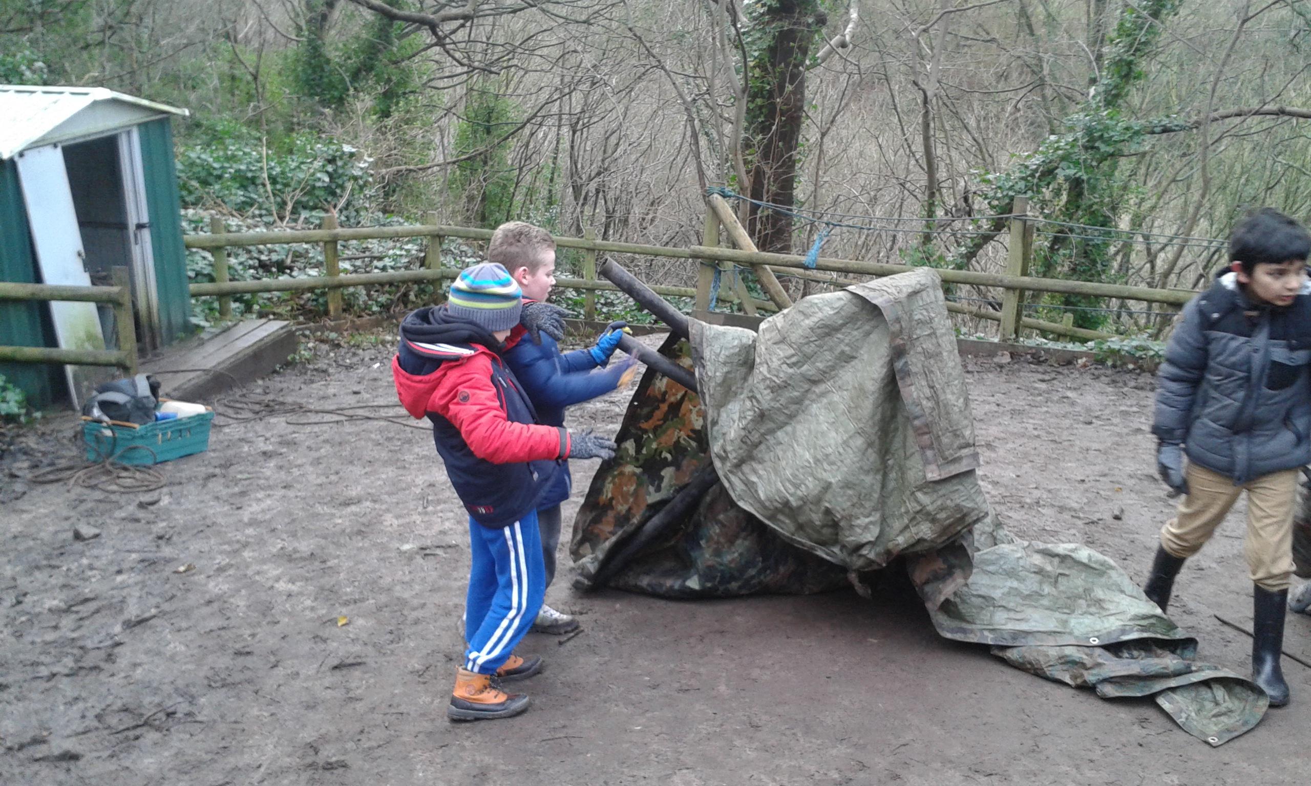 On our survival course, first we built a shelter. We got the equipment, tied the poles together, then put the tarpaulin over the top....success!!