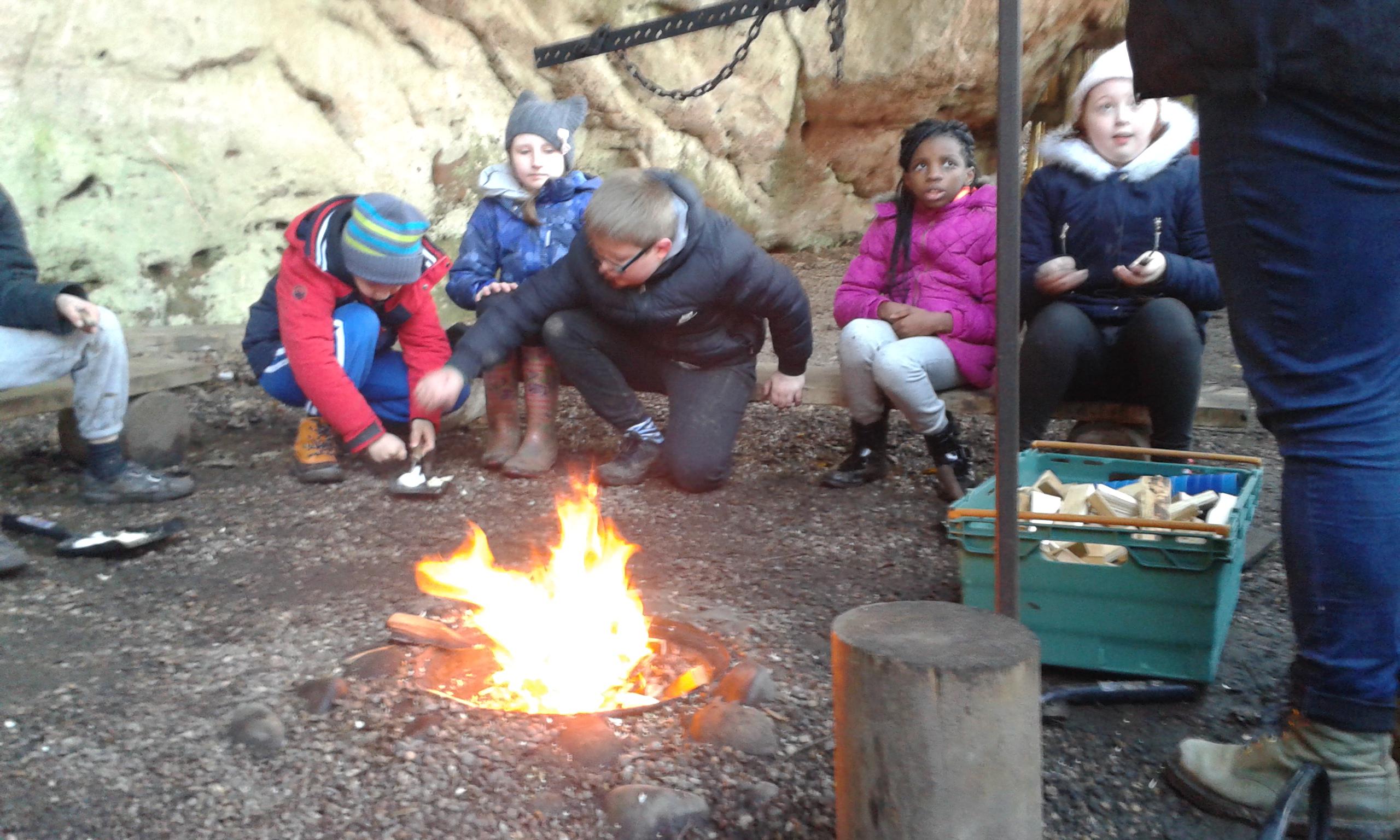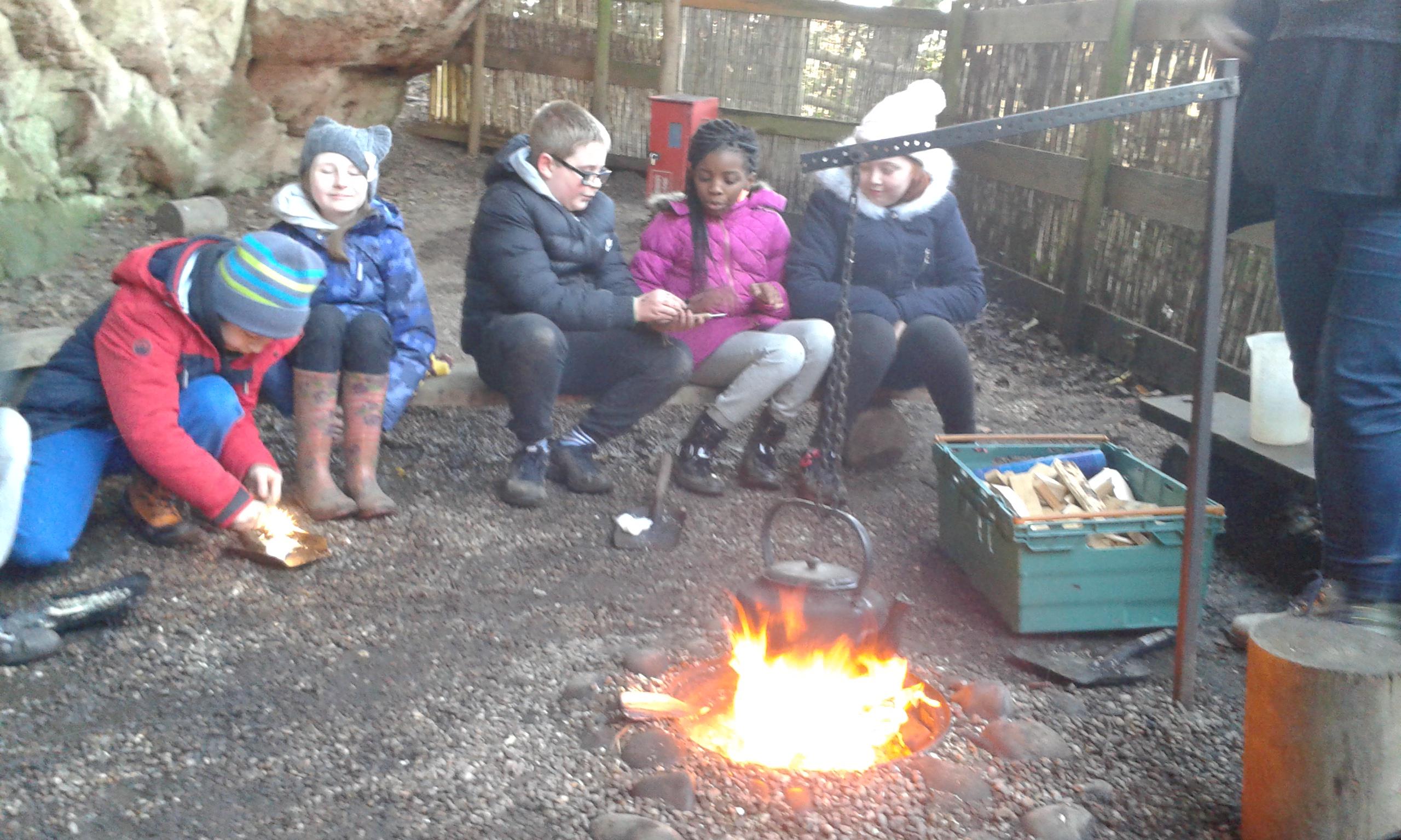 Next we made a fire, using steel and flint to light some cotton wool & wood shavings to start the fire. The fire was used to boil our water for water for hot chocolate and toasting marshmallows.