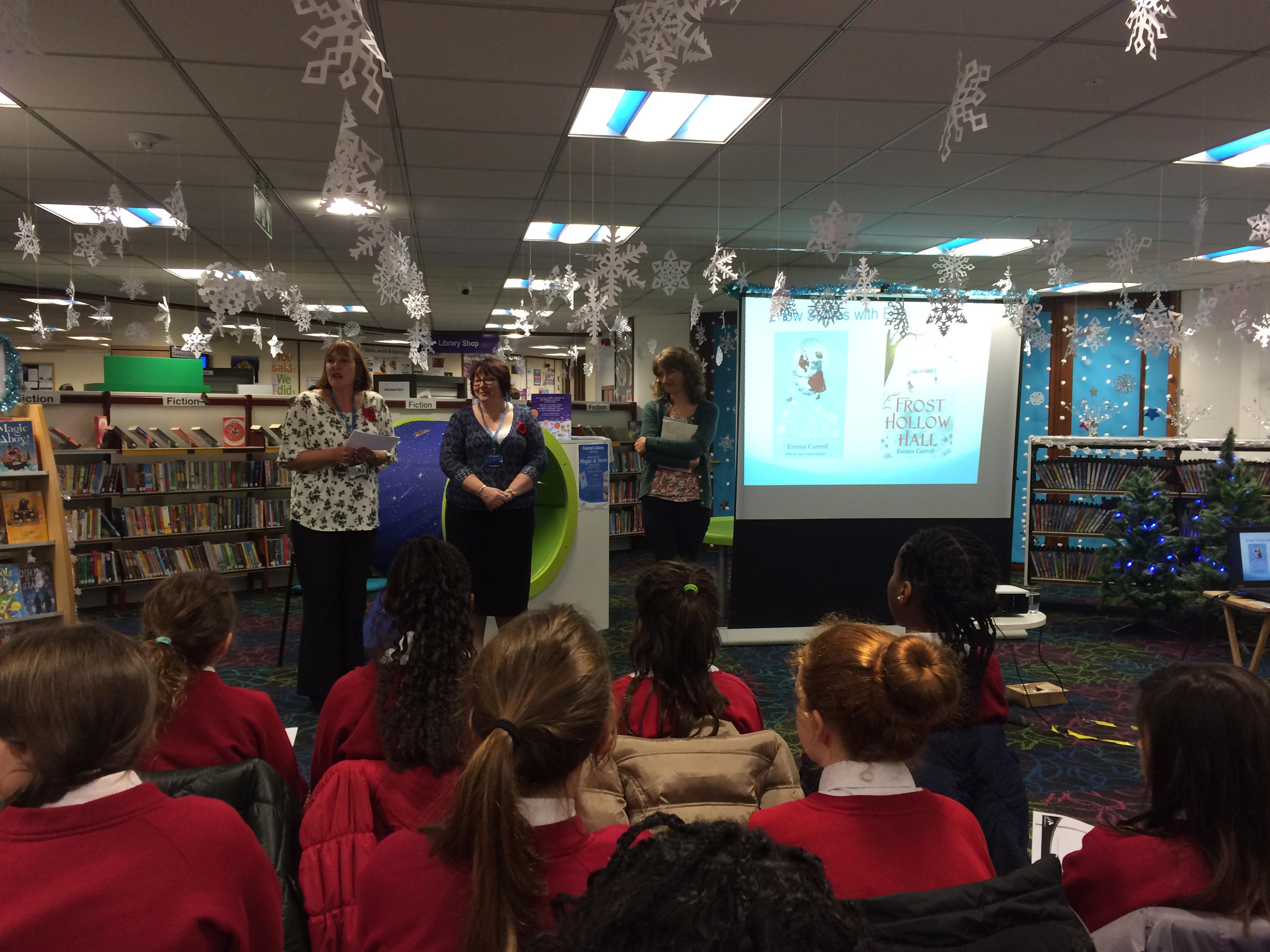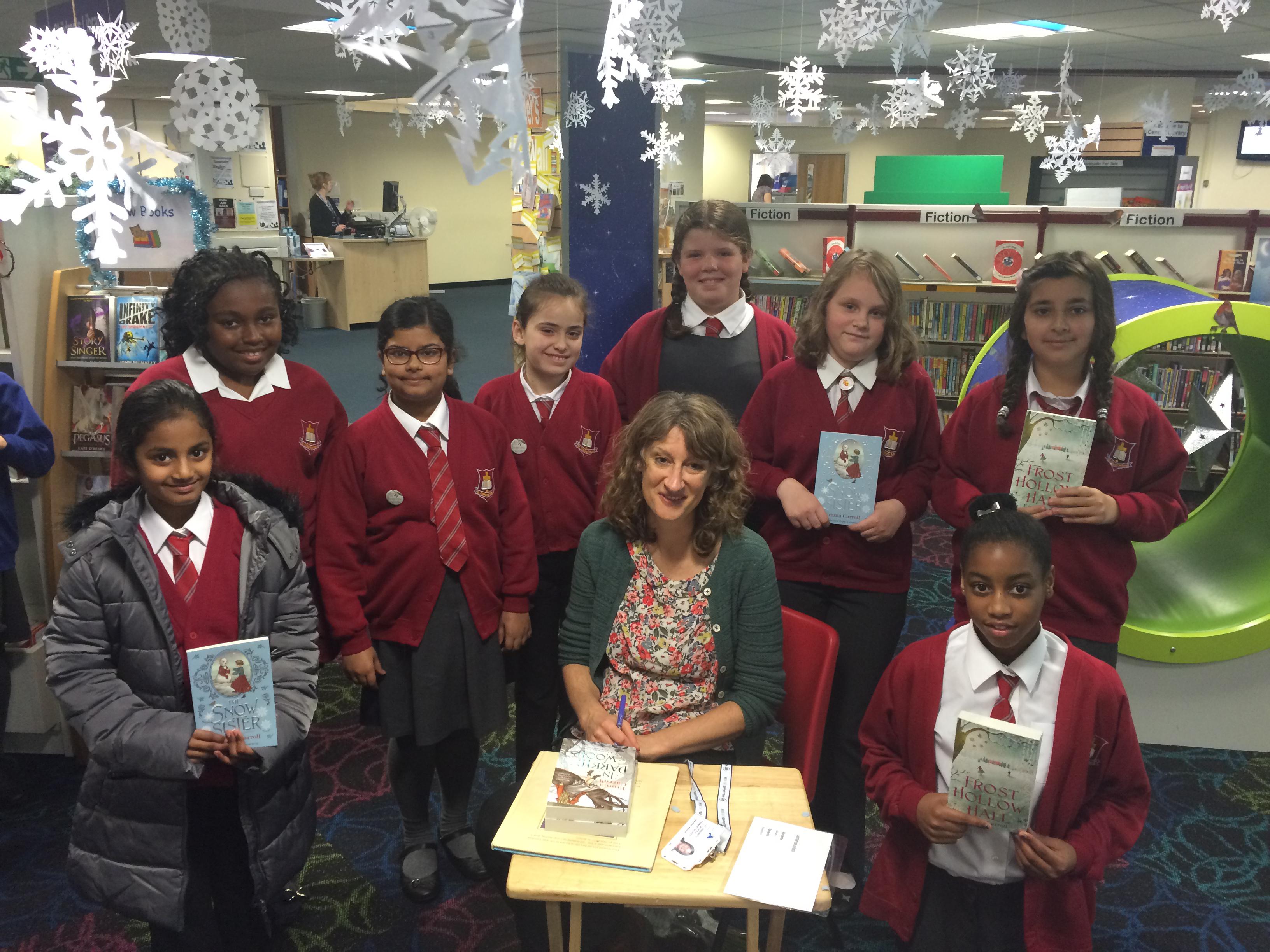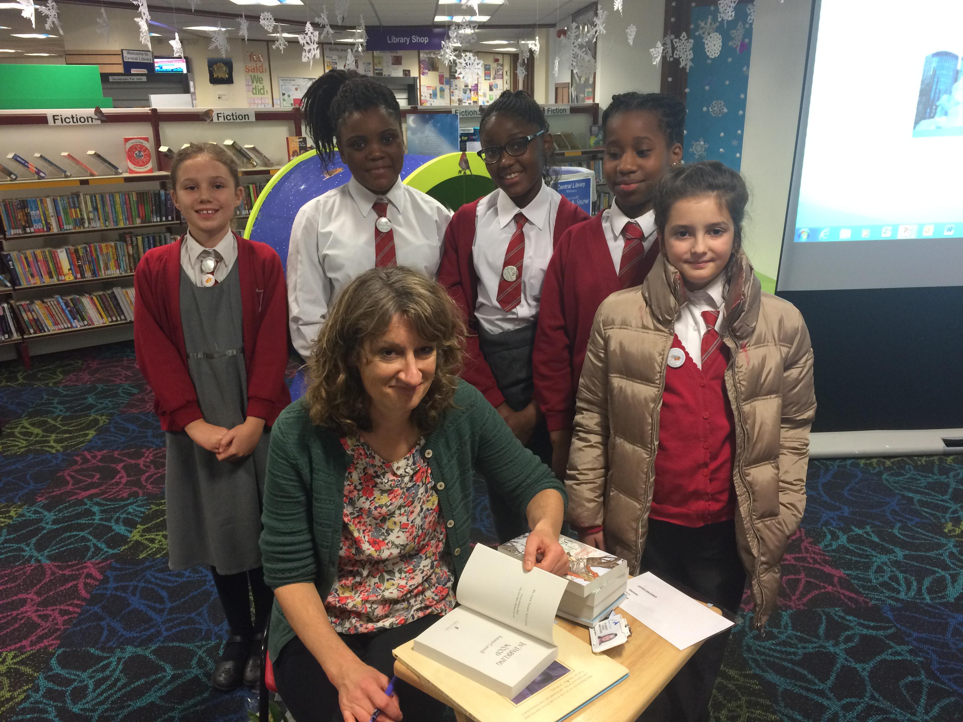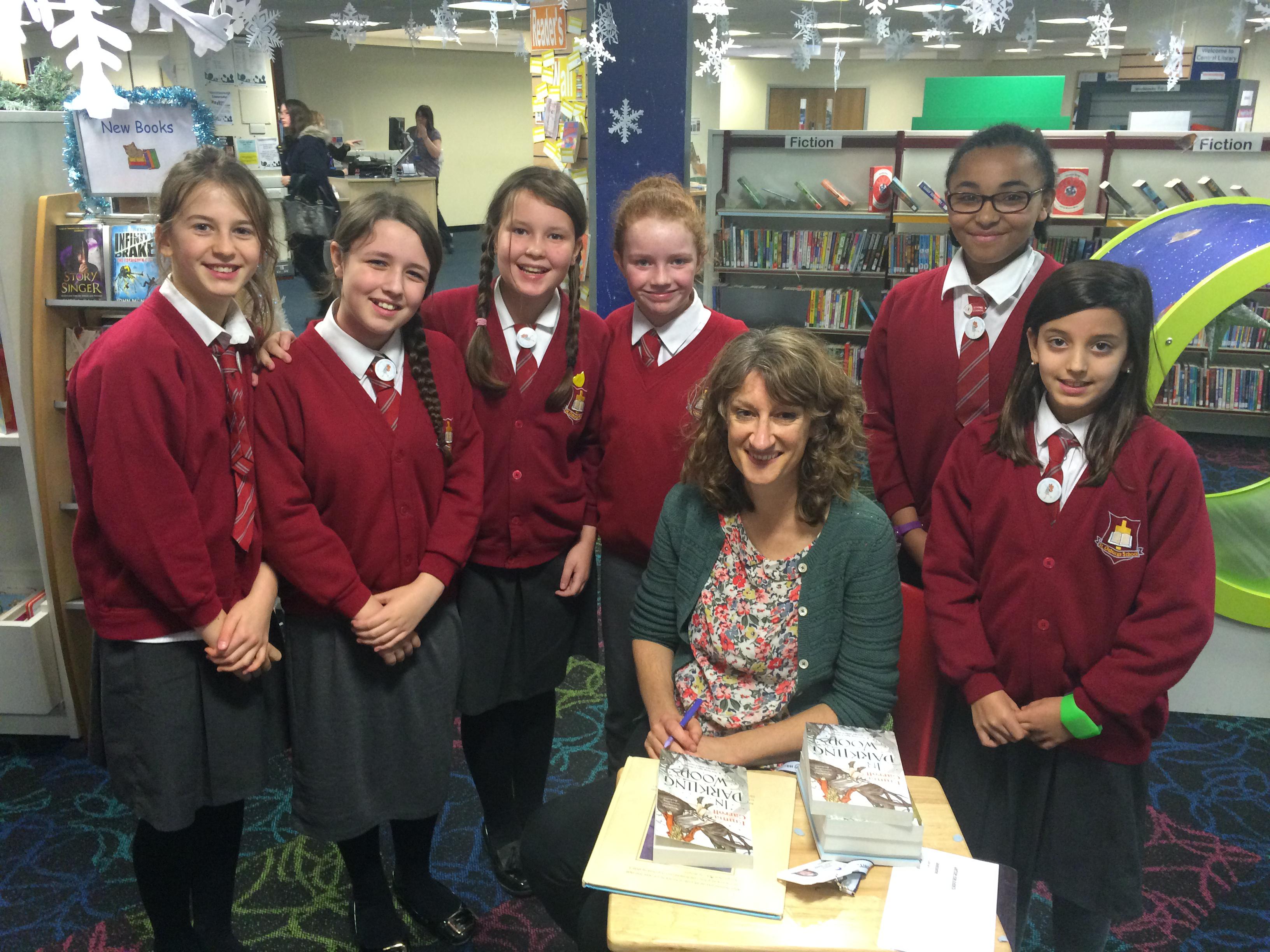 Year 6 girls meeting author Emma Carroll at Central Library.