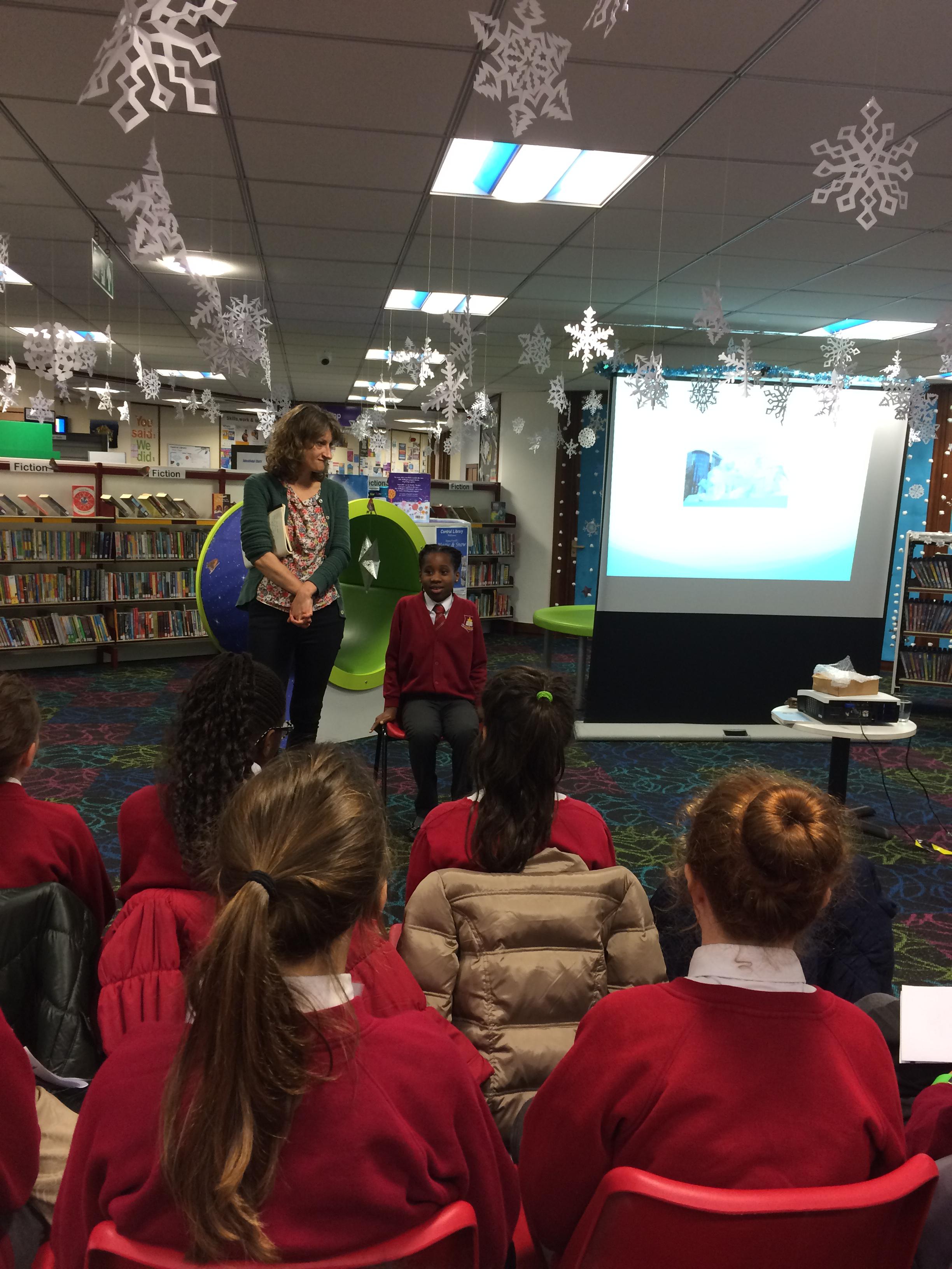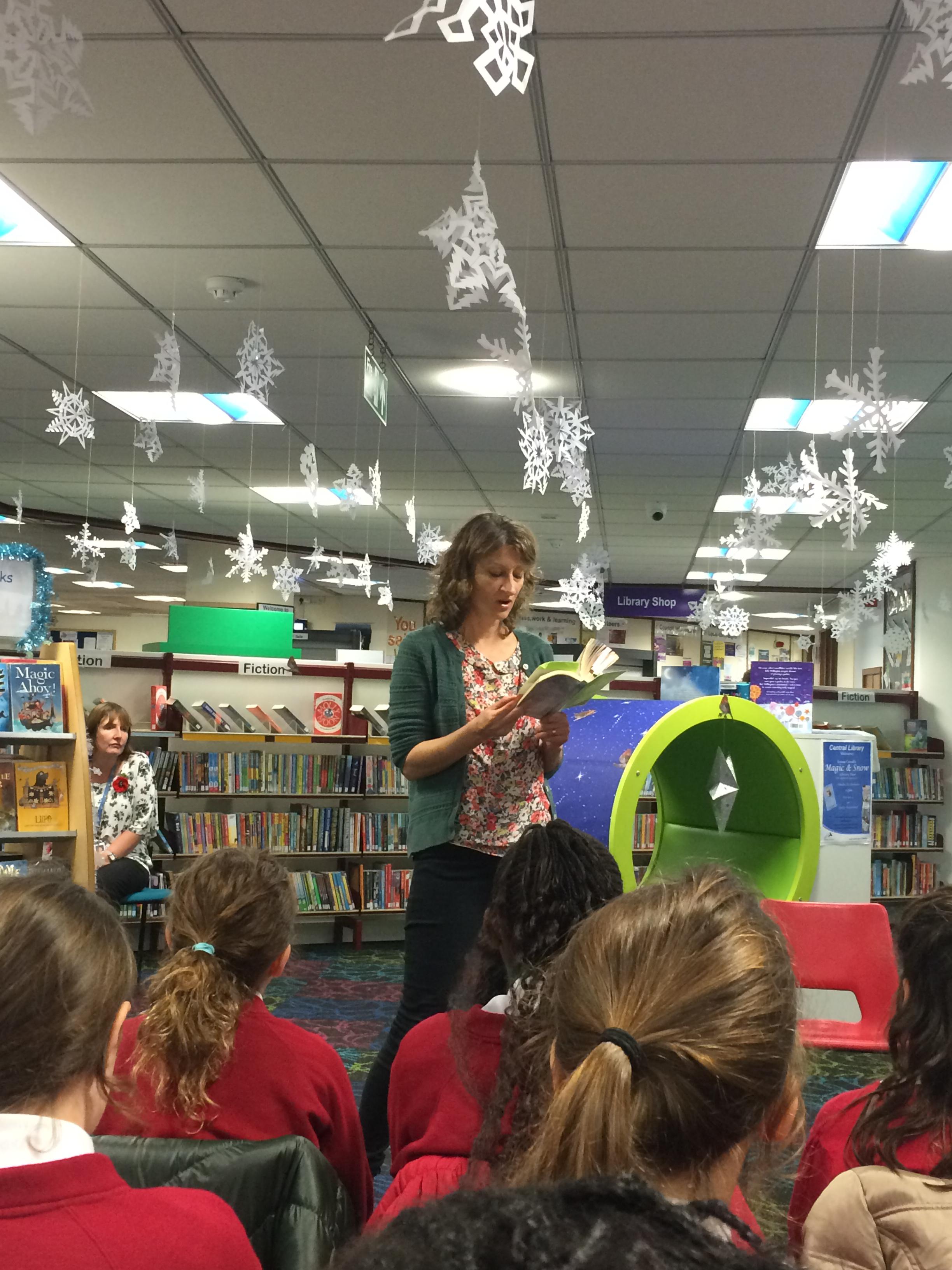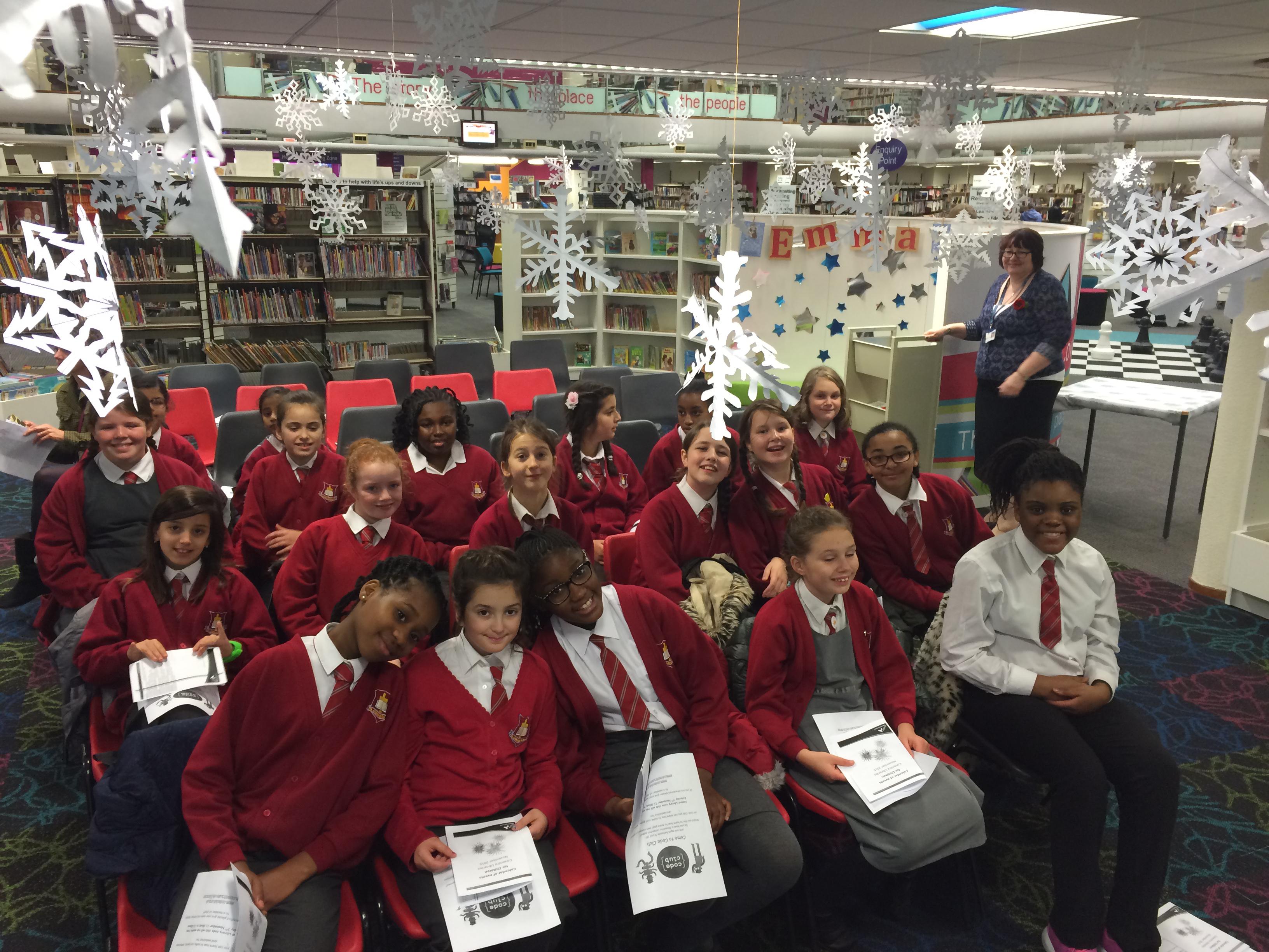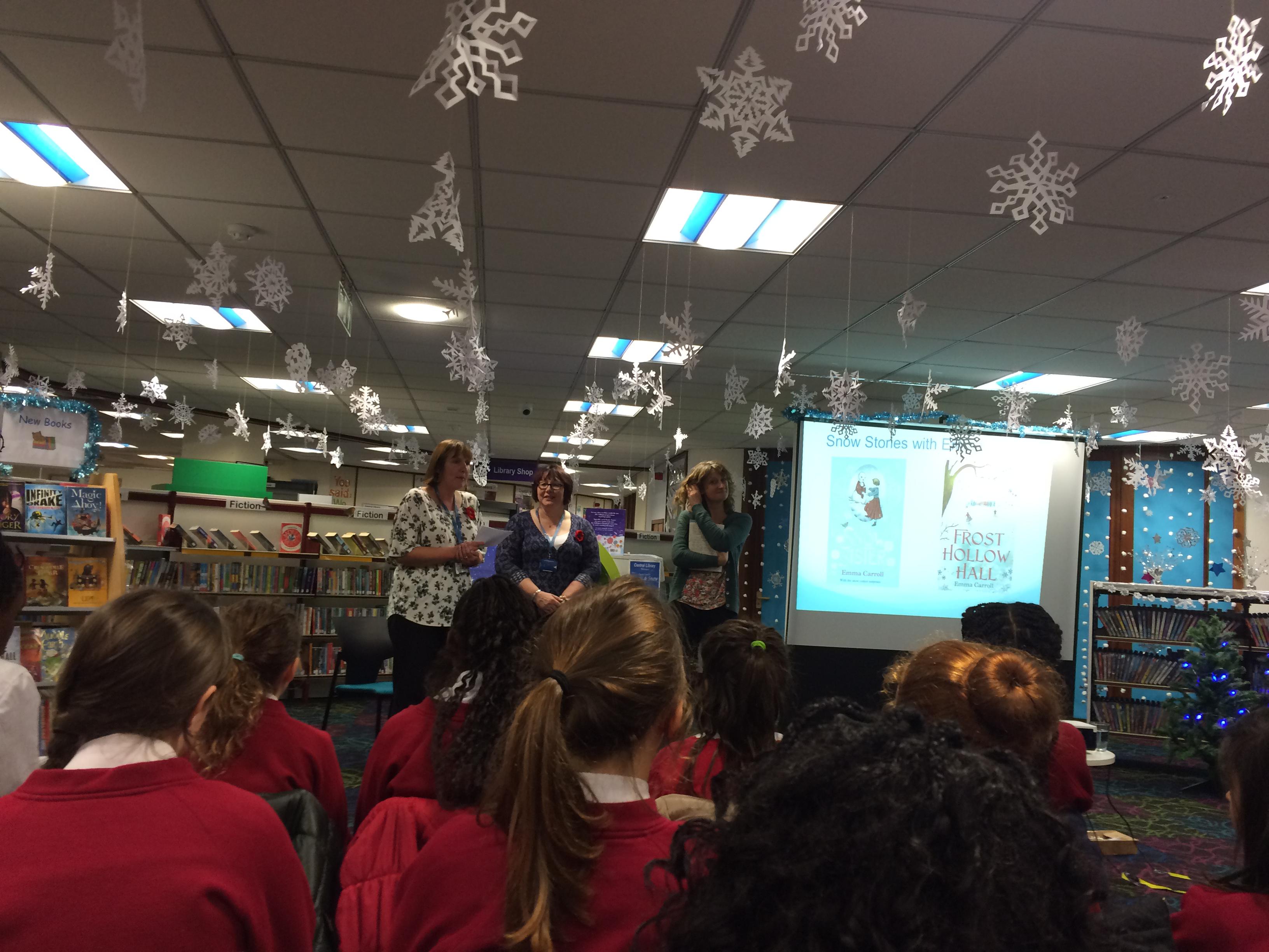 Year 6 girls meeting author Emma Carroll at Central Library.