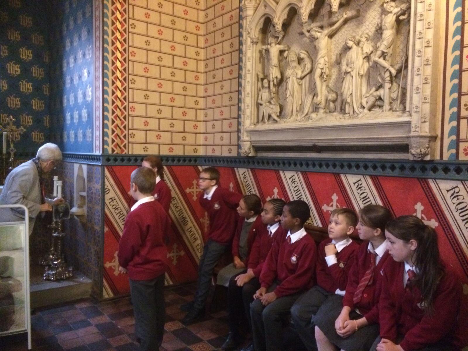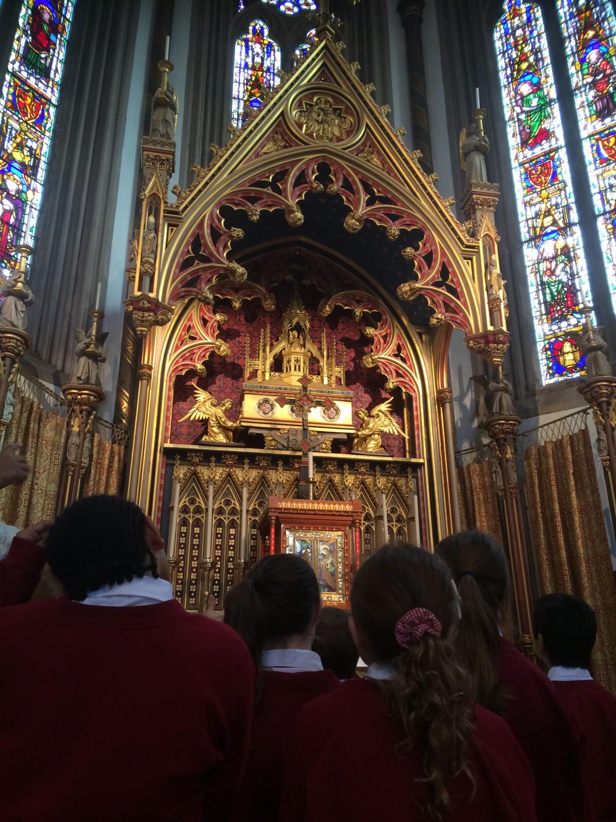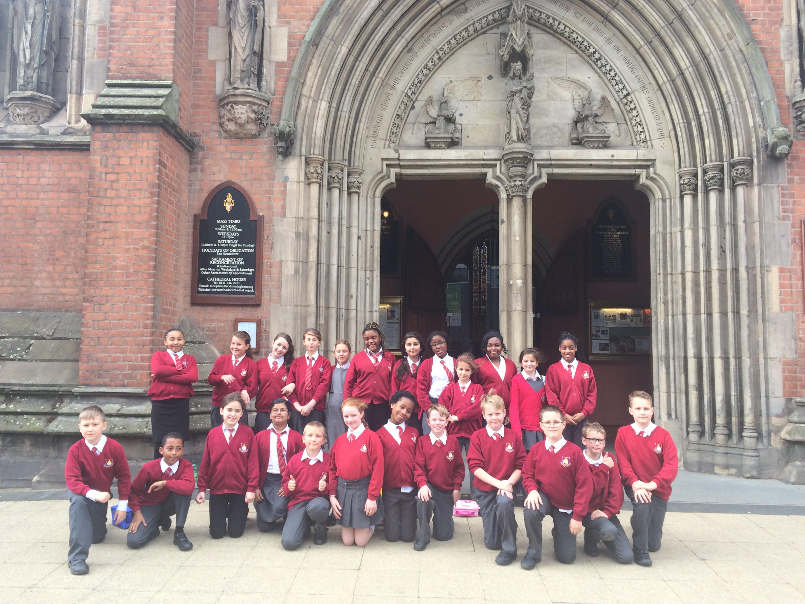 After a quick journey over to Birmingham, Year Six were welcomed by two guides outside St Chad's Cathedral in the centre of Birmingham. A quick descent down the Cathedral stairs took us down to the crypt where we started our tour. Our guides shared lots of interesting stories and showed us many artefacts and paintings as we went on a whistle-stop tour of the cathedral. We learned about Augustus Pugin, the architect behind the magnificent cathedral, as well as St Chad whose relics are kept safe behind the main altar. At lunchtime children celebrated mass with the local community Oliwia, Jessica and Caitlin did a fantastic job alter serving. It was a really enjoyable trip for all of the Year Six children and their behaviour was complimented by the guides who were with us. Visiting St Chad's Cathedral marks the start of the Year Six journey towards making the Sacrament of Confirmation early next year.