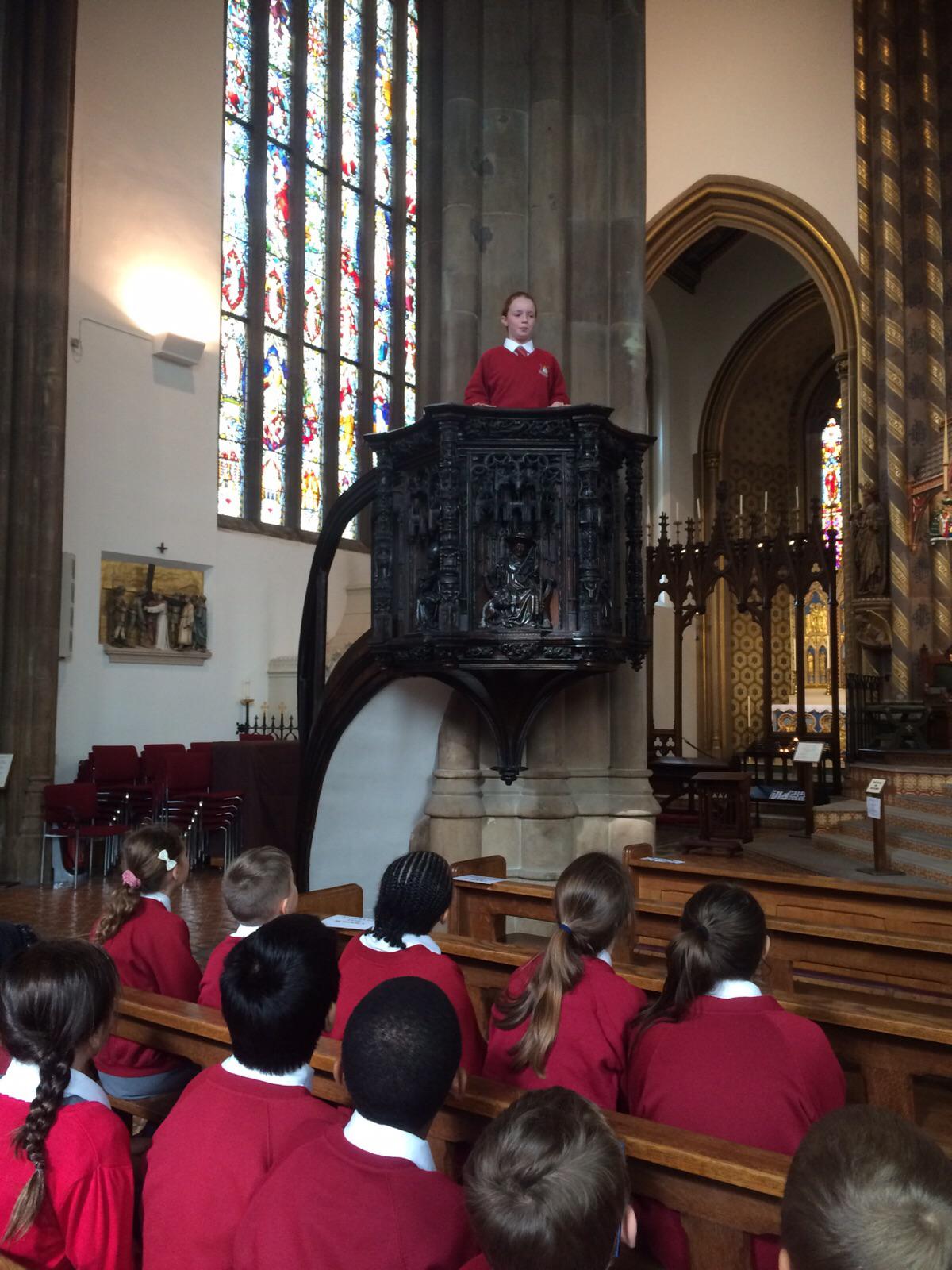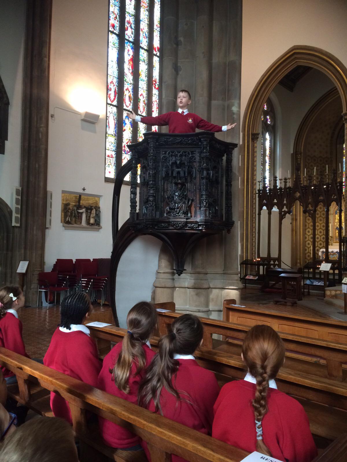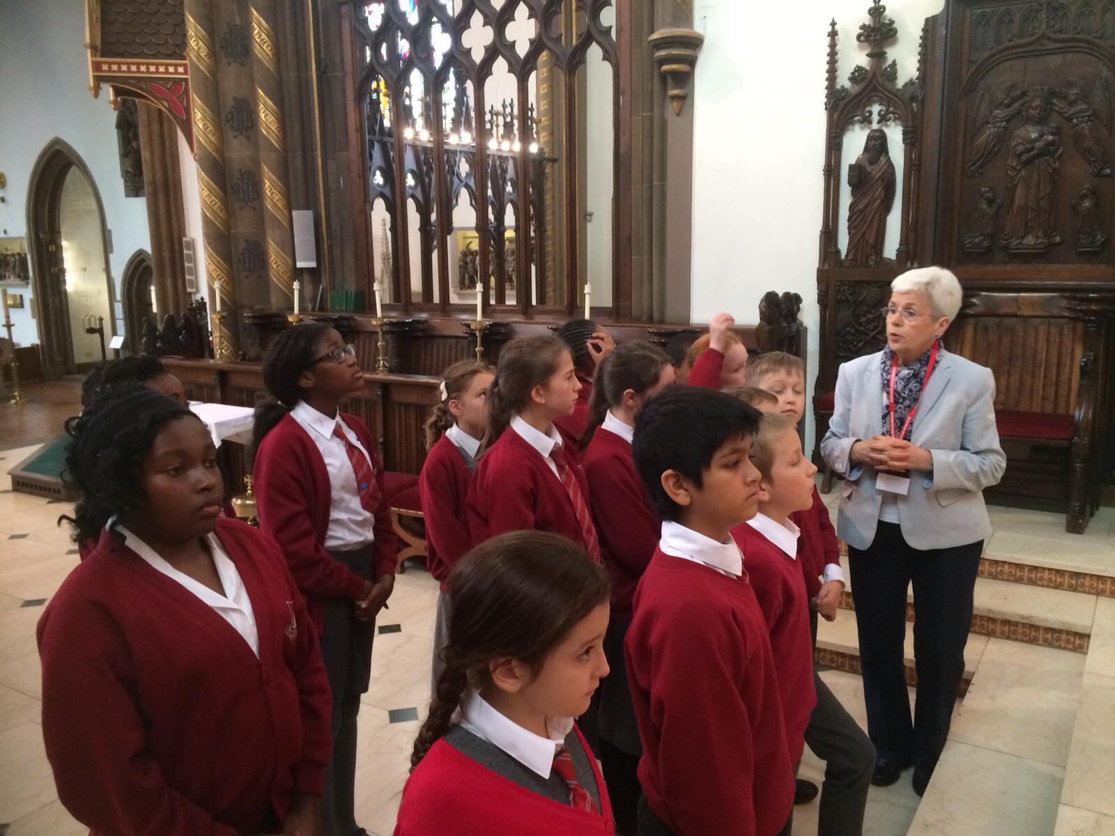 After a quick journey over to Birmingham, Year Six were welcomed by two guides outside St Chad's Cathedral in the centre of Birmingham. A quick descent down the Cathedral stairs took us down to the crypt where we started our tour. Our guides shared lots of interesting stories and showed us many artefacts and paintings as we went on a whistle-stop tour of the cathedral. We learned about Augustus Pugin, the architect behind the magnificent cathedral, as well as St Chad whose relics are kept safe behind the main altar. At lunchtime children celebrated mass with the local community Oliwia, Jessica and Caitlin did a fantastic job alter serving. It was a really enjoyable trip for all of the Year Six children and their behaviour was complimented by the guides who were with us. Visiting St Chad's Cathedral marks the start of the Year Six journey towards making the Sacrament of Confirmation early next year.